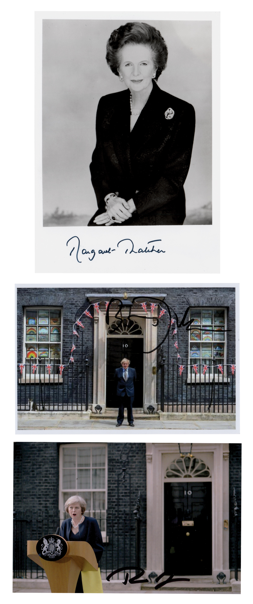 Three photos of British prime ministers, ranging in size from 6 x 4 to 5 x 7, individually signed in black felt tip by Margaret Thatcher, Boris Johnson, and Theresa May. In overall fine condition.