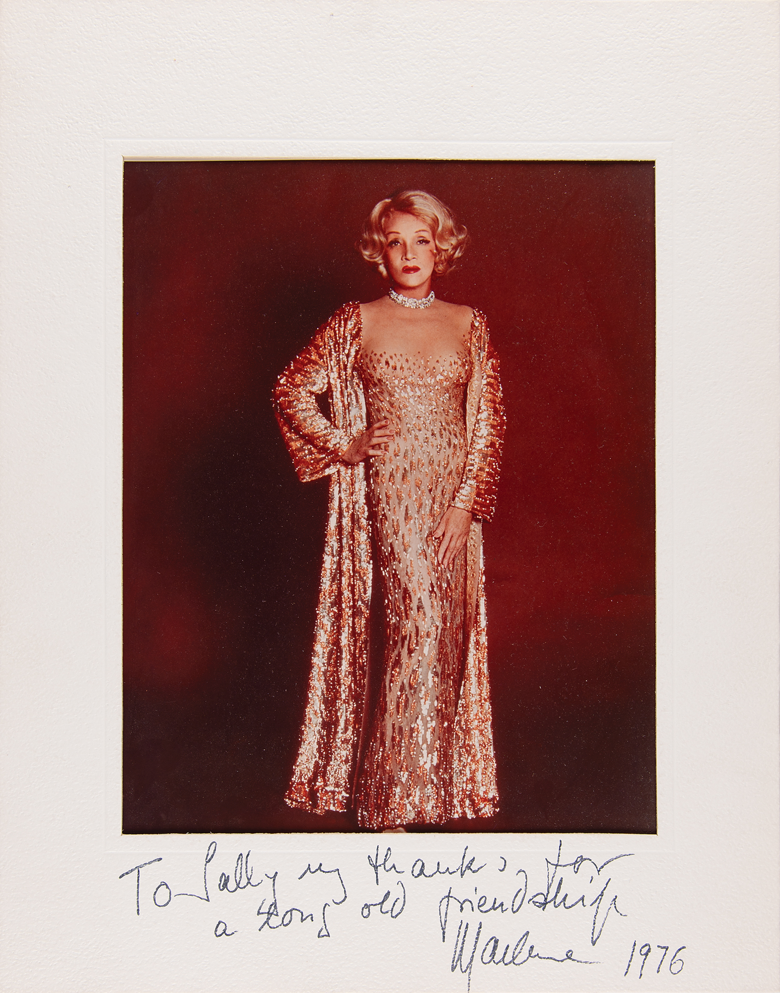Color semi-glossy 7.5 x 9.5 full-length photo of Marlene Dietrich wearing a dazzling dress and a diamond necklace, matted to an overall size of 11 x 15, signed and inscribed on the mat in black felt tip, "To Sally, my thanks for a long old friendship, Marlene, 1976.” In fine condition.