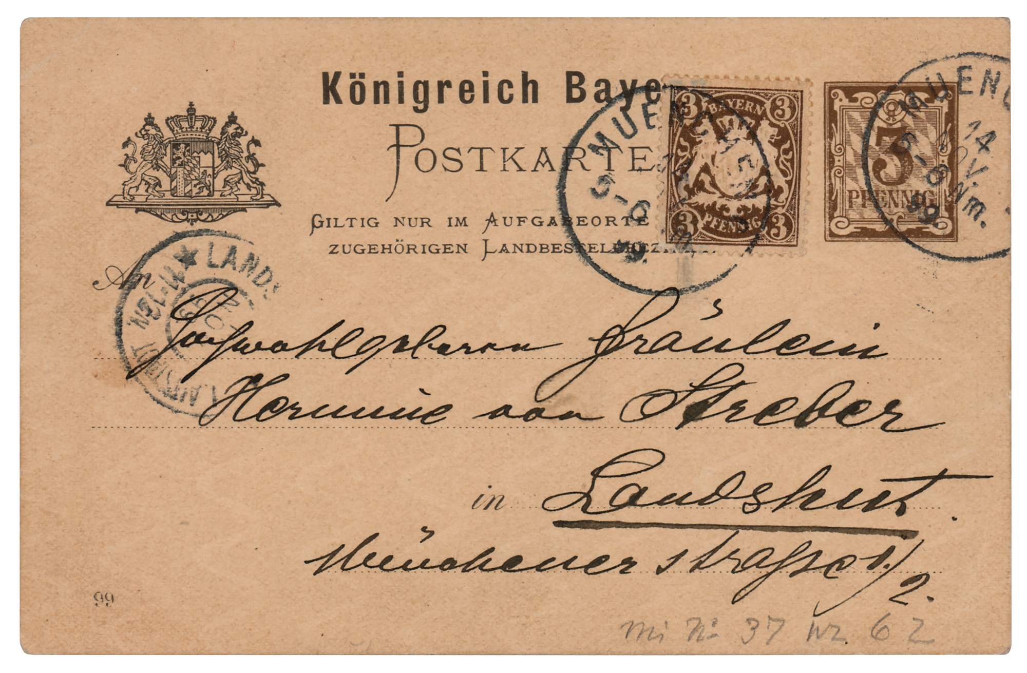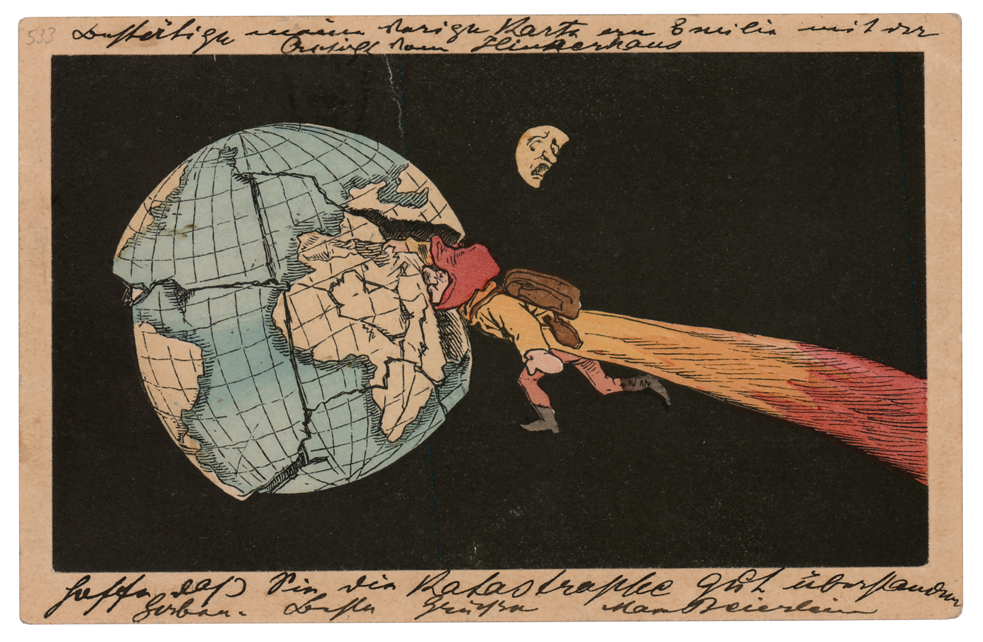 Vintage color 5.5 x 3.5 German postcard featuring an artist's rocketry-inspired concept, showing a man dramatically blasting into the shattered Earth with a fiery trail behind him, the moon looking on in the distance. Captioned in ink in German, and postmarked 1899. In fine condition.