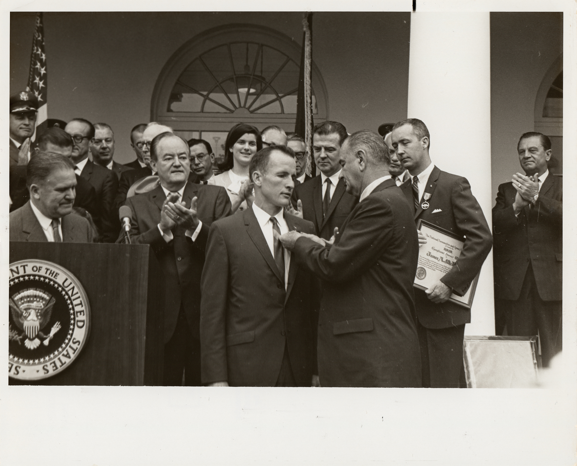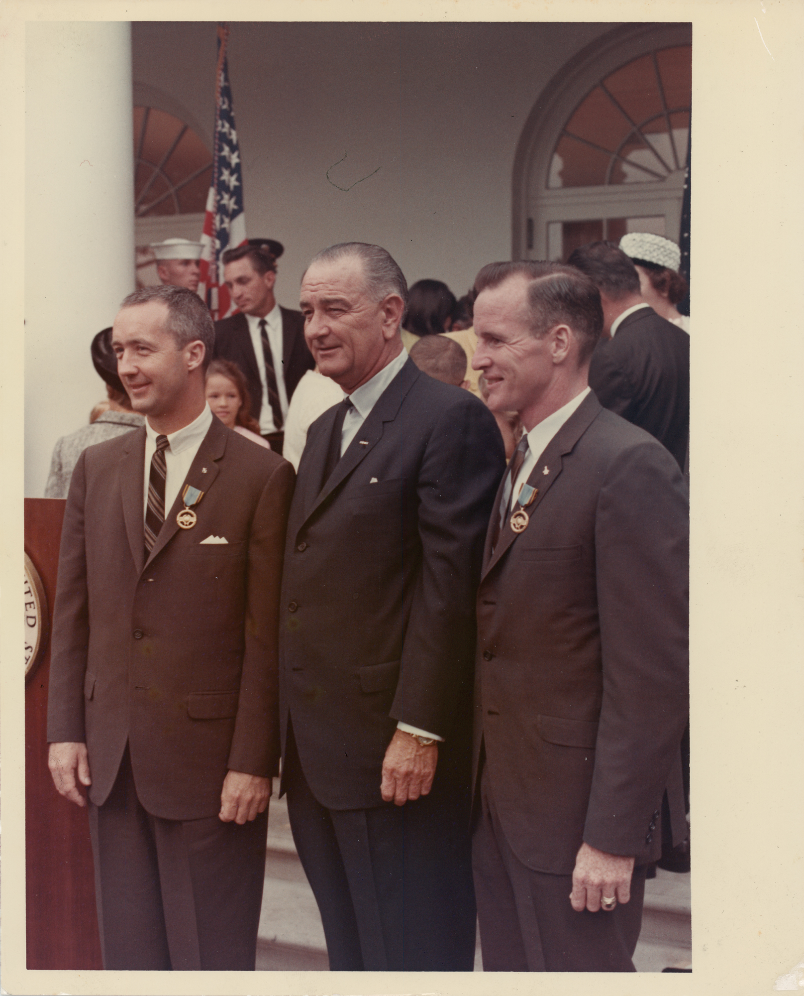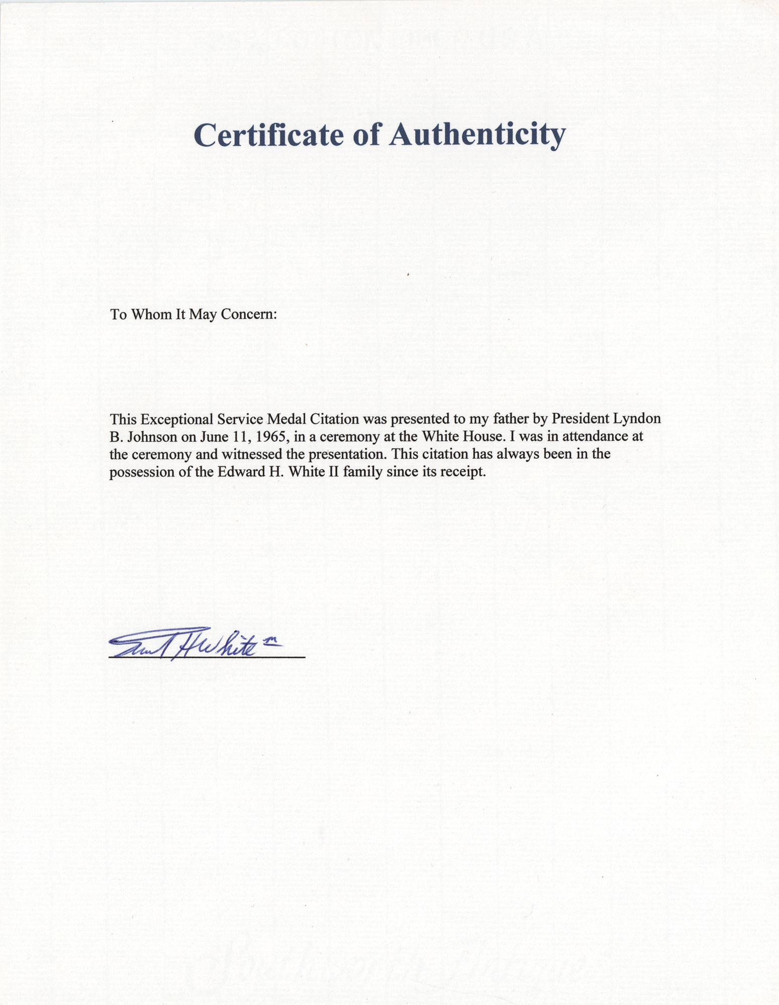 Official illuminated certificate for the "NASA Exceptional Service Medal" issued to Gemini 4 astronaut Ed White, 13.75 x 10.75, awarded by President Lyndon B. Johnson at a White House ceremony on June 11, 1965. The certificate reads: "The National Aeronautics and Space Administration Presents the NASA Exceptional Service Medal to Edward H. White II for outstanding contributions to space flight and engineering. His performance, as Pilot, during the four-day Gemini Mission and as the first man to engage in self-propelled extravehicular activity significantly extended our knowledge of the space environment and man's capabilities in space flight." Signed in fountain pen by NASA Administrator James E. Webb, and countersigned by Deputy Administrator Hugh Latimer Dryden. Framed to an overall size of 15.25 x 12.25. In fine condition. Accompanied by two original NASA press photos of the presentation ceremony, and a letter of provenance from White's son, in part: "This Exceptional Service Medal Citation was presented to my father by President Lyndon B. Johnson on June 11, 1965, in a ceremony at the White House. I was in attendance at the ceremony and witnessed the presentation."