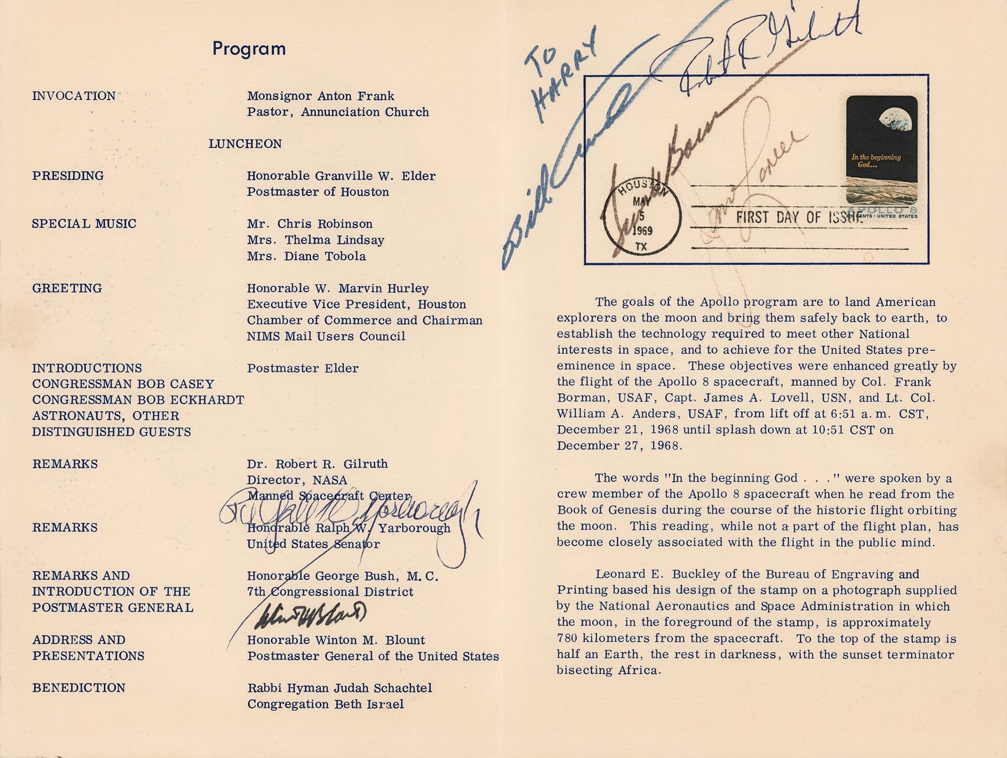 Program from the "Apollo 8 Commemorative Stamp First Day of Issue Ceremony" held at the Rice Hotel in Houston, Texas, on May 5, 1969, two pages, 6 x 9, signed and inscribed inside in felt tip by the prime crew, "To Harry, Bill Adners," "Frank Borman," and "James Lovell." Additionally signed in ink by NASA Manned Spacecraft Center Director Robert R. Gilruth, Senator Ralph W. Yarborough, and Postmaster General Winton M. Blount. In fine condition, with an old tape stain to the right edge, and fading to Lovell's signature.