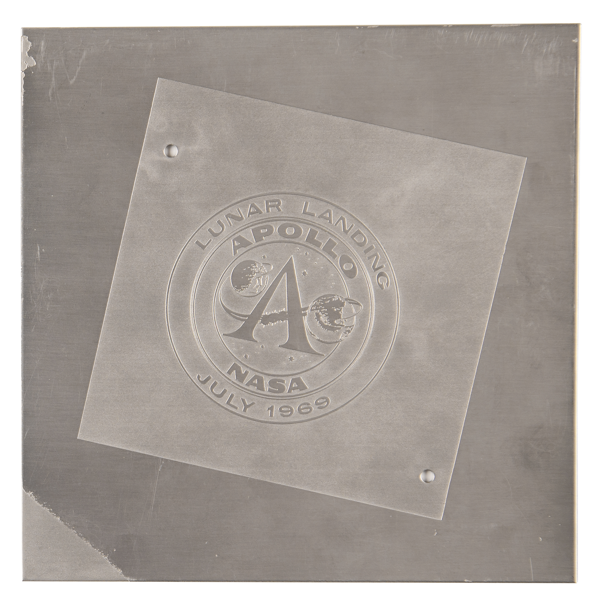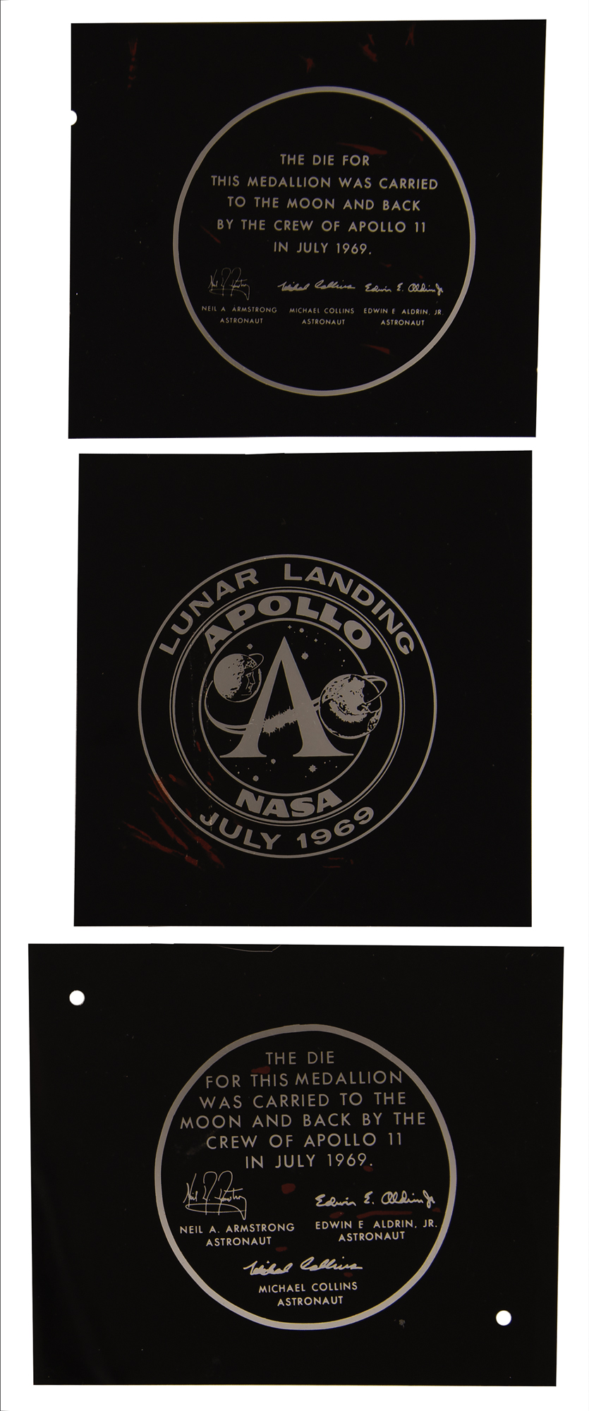 Three negatives of the original artwork from which the dies for the Apollo 11 commemorative medallion were made, plus a proof strike of the die that was carried on the mission. Each negative measures approximately 4˝ x 3.25˝, and includes one image of the obverse, and two variants of the reverse (one obviously dropped in favor of the other). Additionally includes a 6˝ x 6˝ metal plate with proof strikes of the dies: one side with an Apollo program logo, encircled by the text, "Lunar Landing, Apollo-NASA, July 1969," and the other reading, "The die for this medallion was carried to the Moon and back by the crew of Apollo 11 in July 1969," with the facsimile signatures of all three crew members below. A rare and interesting artifact from the most famous of the Apollo missions.