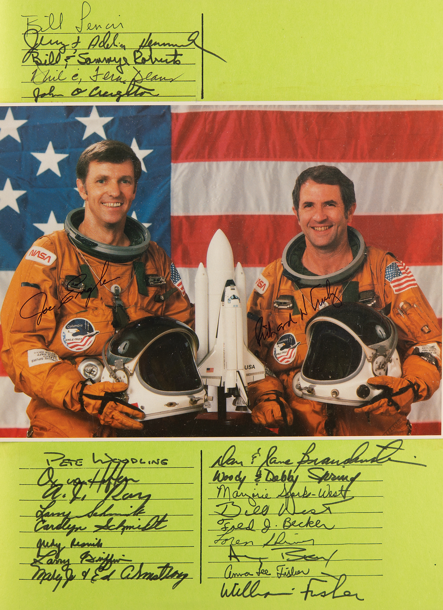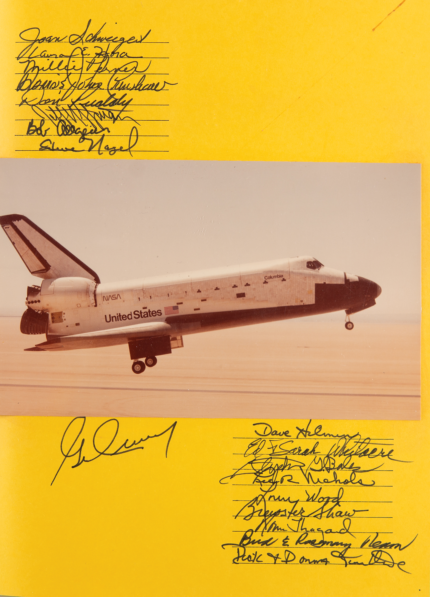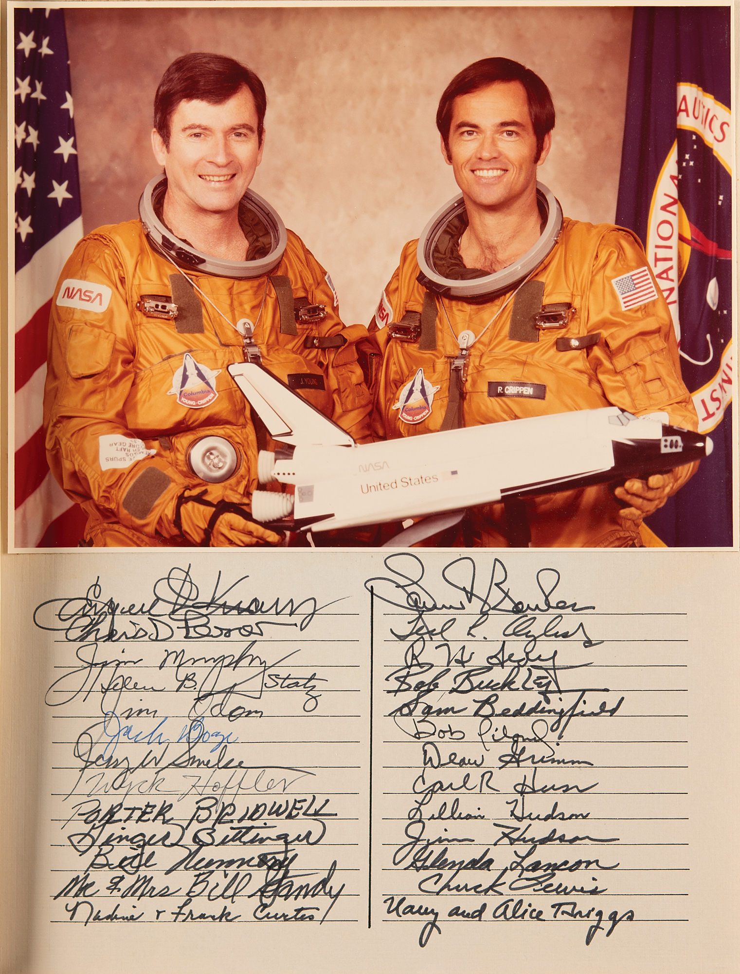 Unique handmade scrapbook-style booklet prepared for Deke Slayton upon his retirement from NASA in 1982, 11 x 14, signed throughout in ink by dozens of fellow astronauts, NASA employees, friends, and personnel from across his prolific career—in which he was one of the original Mercury Seven astronauts, the first Chief of the Astronaut Office, Director of Flight Crew Operations, and Docking Module Pilot of the Apollo–Soyuz Test Project. Among the multitudes of signatories are: Apollo astronauts Alan Shepard, John Young, Gene Cernan, Alan Bean, Ron Evans,; Skylab astronauts Paul Weitz, Joe Kerwin, and Jerry Carr; Space Shuttle astronauts Dick Scobee, Judy Resnik, Bob Crippen, Vance Brand, Don Peterson, Jeffrey Hoffman, Brewster Shaw, Norm Thagard, James van Hoften, Loren Shriver, Dan Brandenstein, Anna Lee Fisher, Rhea Seddon, Dave Leestma, Tony England, Bonnie J. Dunbar, Rick Hauck, Bob Overmyer, and Hank Hartsfield; Flight Directors Gene Kranz, Chris Kraft, and Glynn S. Lunney; MSC Director Robert R. Gilruth; test pilot Fitz Fulton; Gus Grissom's widow, Betty; and many, many more. Several images from the early Space Shuttle program are affixed throughout the book, with two inexplicably bearing autopen signatures of the crew members. In overall very good to fine condition, with light wear and toning.