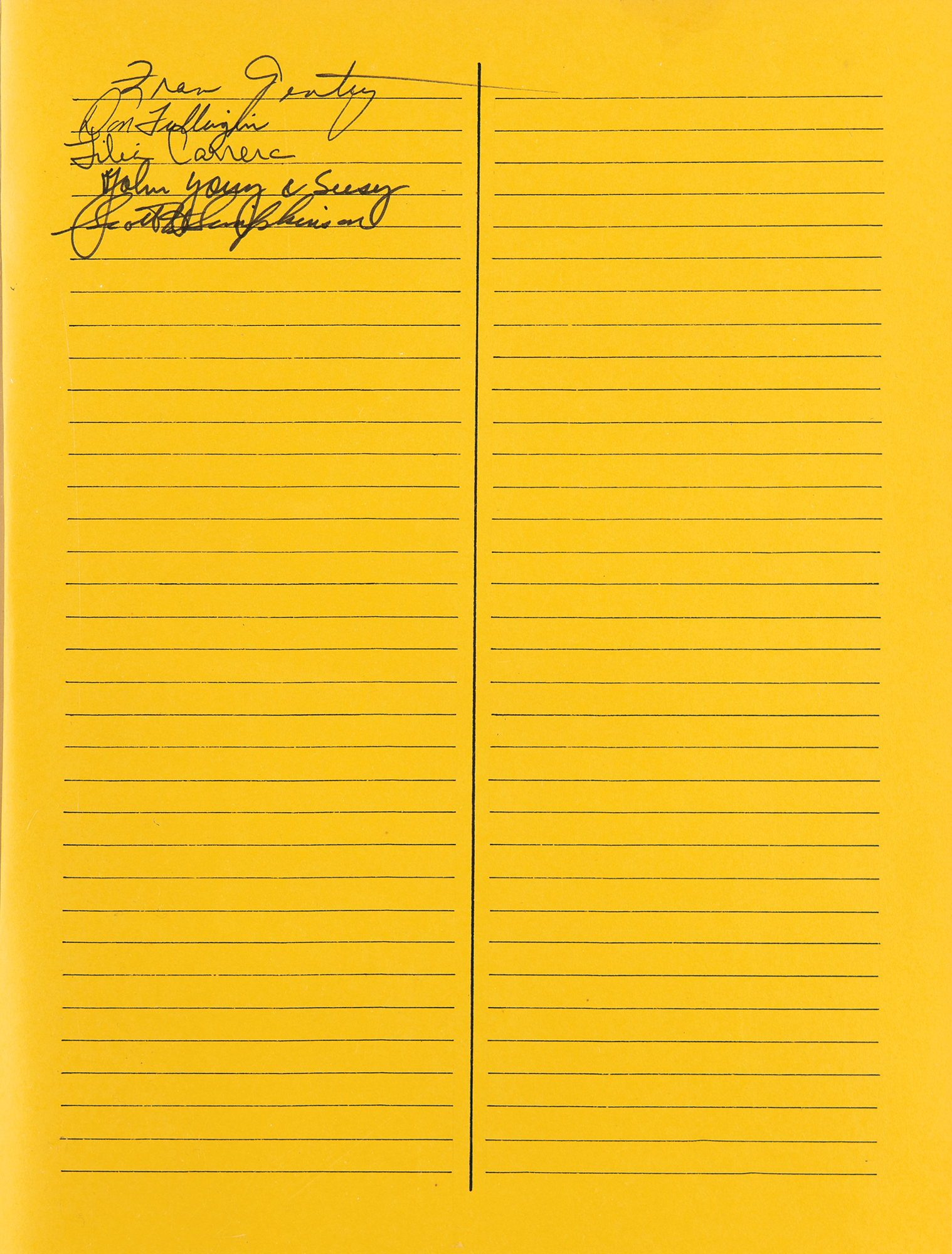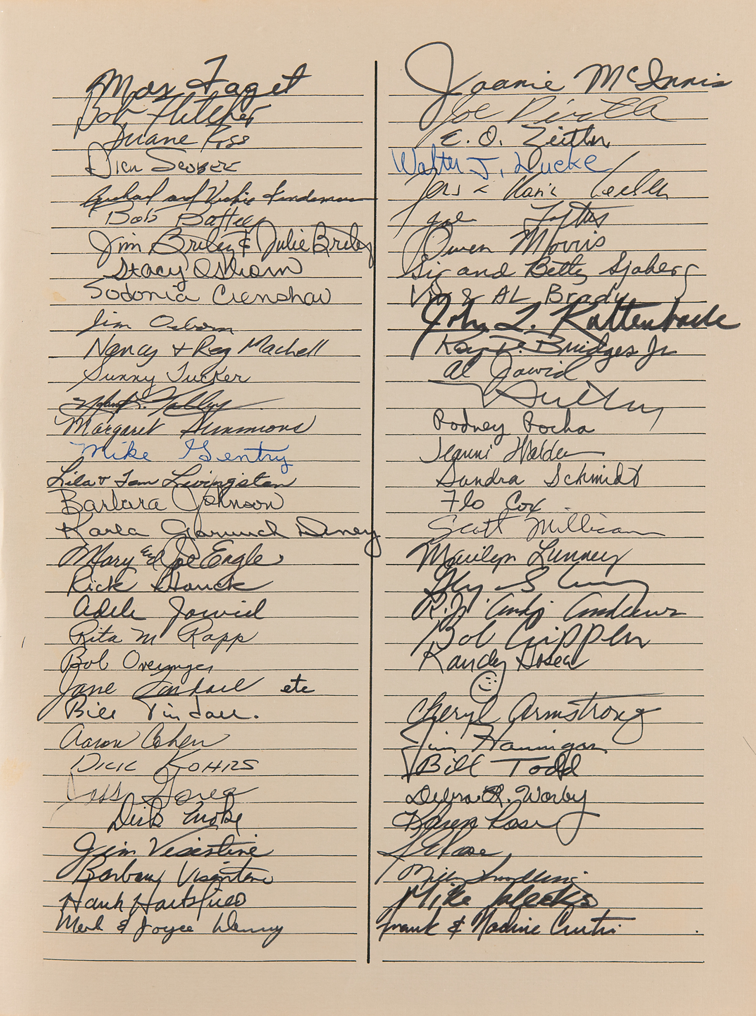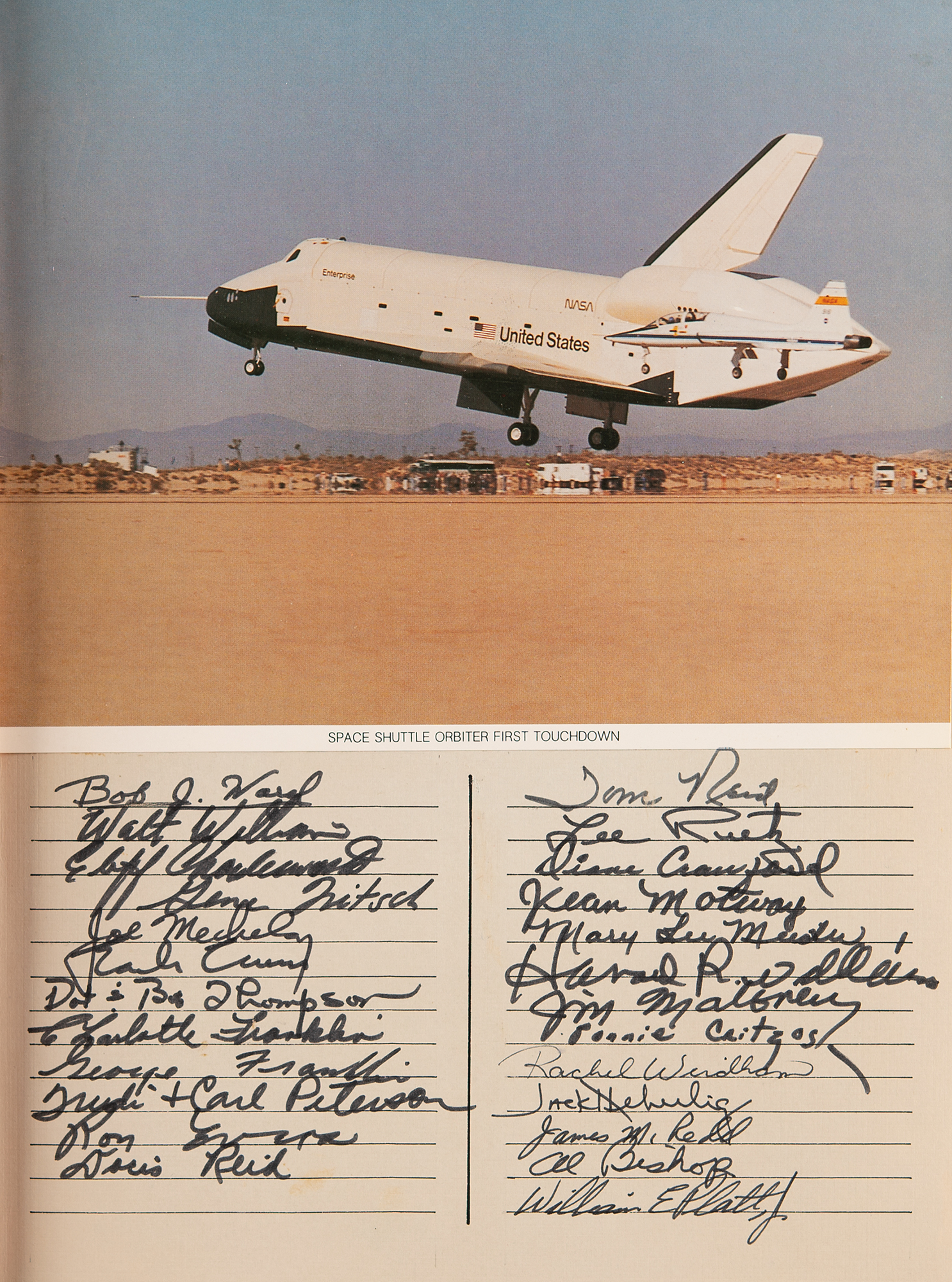 Unique handmade scrapbook-style booklet prepared for Deke Slayton upon his retirement from NASA in 1982, 11 x 14, signed throughout in ink by dozens of fellow astronauts, NASA employees, friends, and personnel from across his prolific career—in which he was one of the original Mercury Seven astronauts, the first Chief of the Astronaut Office, Director of Flight Crew Operations, and Docking Module Pilot of the Apollo–Soyuz Test Project. Among the multitudes of signatories are: Apollo astronauts Alan Shepard, John Young, Gene Cernan, Alan Bean, Ron Evans,; Skylab astronauts Paul Weitz, Joe Kerwin, and Jerry Carr; Space Shuttle astronauts Dick Scobee, Judy Resnik, Bob Crippen, Vance Brand, Don Peterson, Jeffrey Hoffman, Brewster Shaw, Norm Thagard, James van Hoften, Loren Shriver, Dan Brandenstein, Anna Lee Fisher, Rhea Seddon, Dave Leestma, Tony England, Bonnie J. Dunbar, Rick Hauck, Bob Overmyer, and Hank Hartsfield; Flight Directors Gene Kranz, Chris Kraft, and Glynn S. Lunney; MSC Director Robert R. Gilruth; test pilot Fitz Fulton; Gus Grissom's widow, Betty; and many, many more. Several images from the early Space Shuttle program are affixed throughout the book, with two inexplicably bearing autopen signatures of the crew members. In overall very good to fine condition, with light wear and toning.