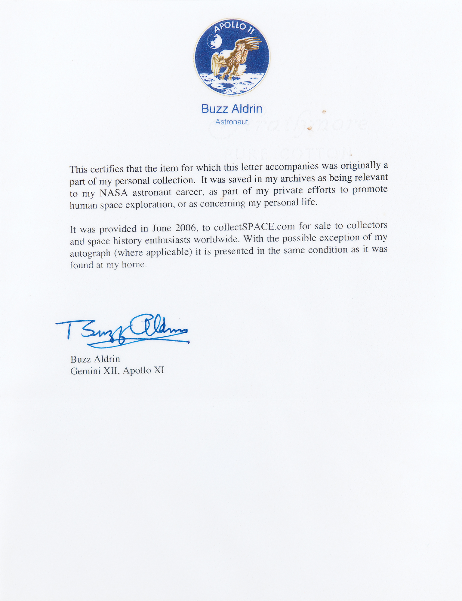 Buzz Aldrin's rare gold-colored Apollo 11 Manned Flight Awareness medal, 1.25" diameter, with the face bearing a the famous image of Buzz Aldrin looking at the American flag on the lunar surface, and the reverse reading: "This Medallion contains metal from spacecrafts Columbia and Eagle, that took Astronauts Armstrong, Aldrin and Collins on their historic Apollo 11 mission that resulted in the first landing of man on the Moon." These were awarded by NASA to important people involved in the space program, with this example originating from Aldrin's personal collection. Accompanied by a laminated letter of provenance signed by Aldrin, noting that it was saved in his archives and sold online in 2006.