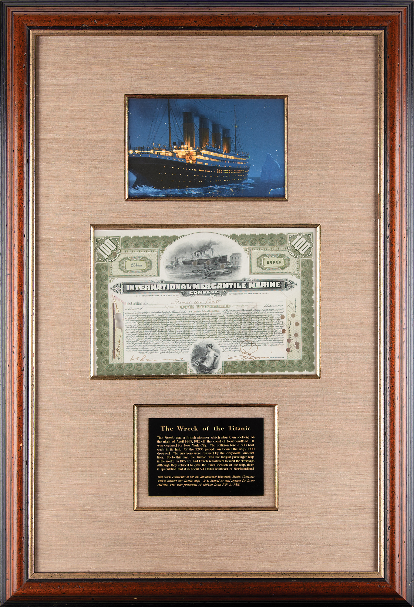 Partly-printed DS, one page, 11.5 x 7.5, no date. Stock certificate for 100 shares of preferred capital stock in the International Mercantile Marine Company, parent of the White Star Line (owner of the RMS Titanic), issued to notable businessman Irénée du Pont, and endorsed on the reverse by du Pont. Impressively cloth-matted and framed with an image of the Titanic and a plaque to an overall size of 21.5 x 31.25, with a window in the backing for viewing the reverse. In fine condition. A descendant of gunpowder-manufacturing millionaire E. I. DuPont, Irénée (1876–1963) entered the family business in 1902 and served as president of the DuPont company from 1919–1925, overseeing the diversification of the firm's interests.