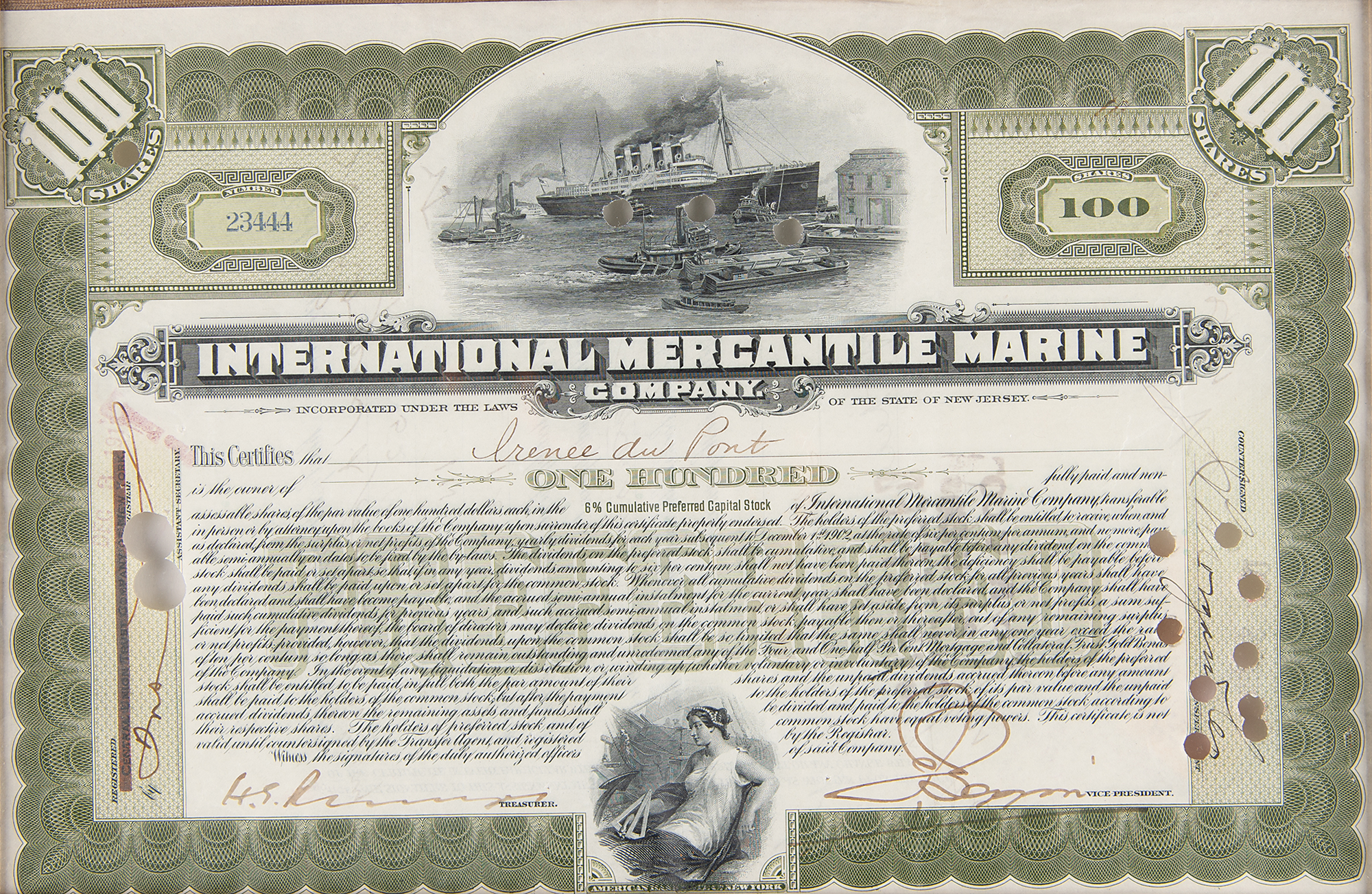 Titanic: International Mercantile Marine Co. Stock Certificate Signed by Irénée du Pont