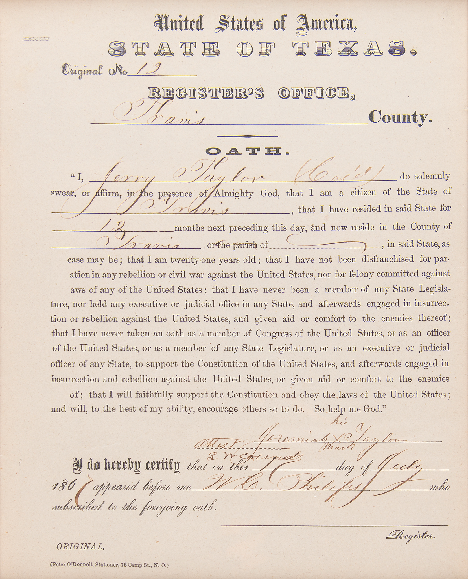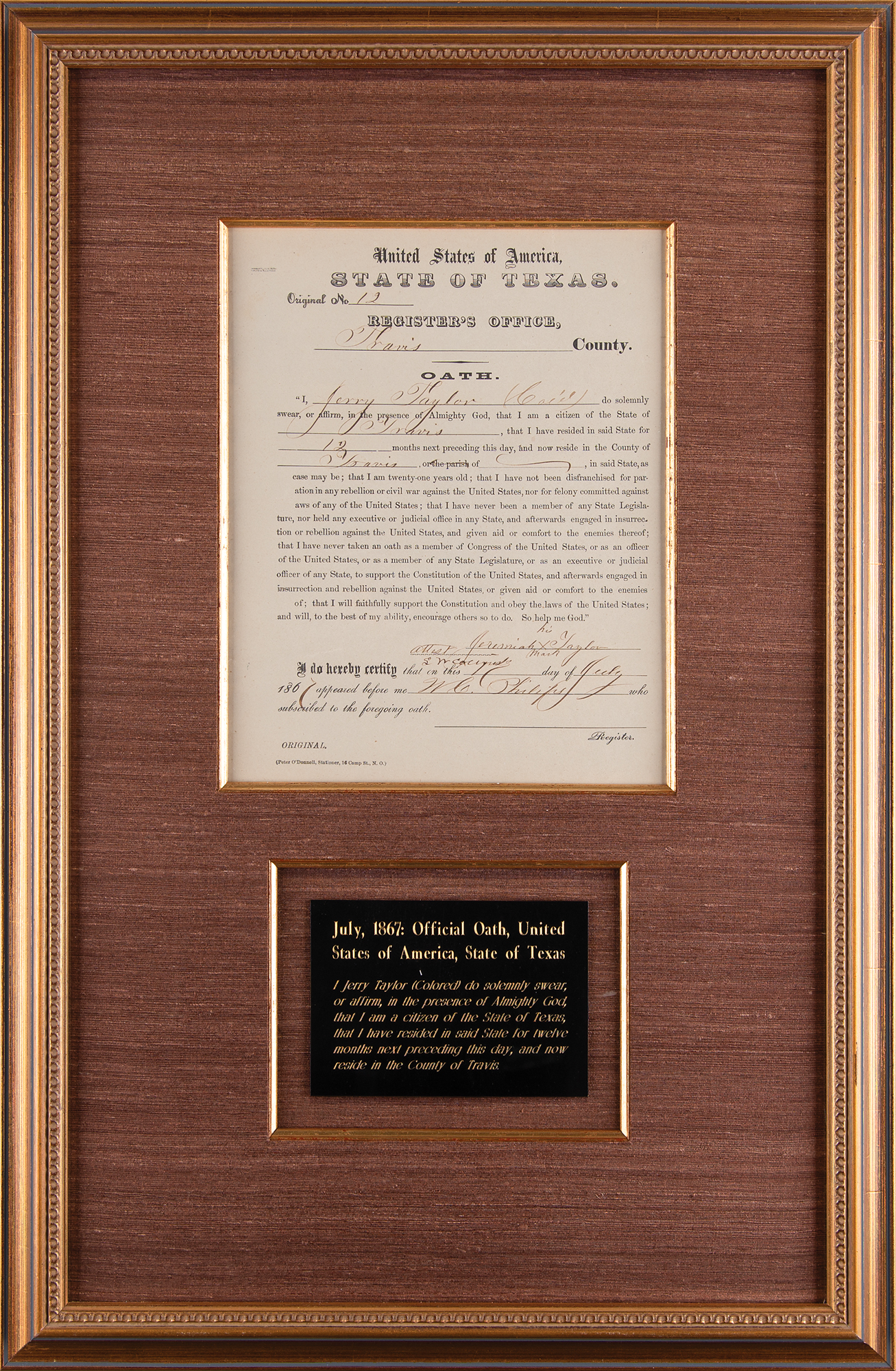 Partly-printed DS, one page, 8 x 9.75, July 1, 1867. Official State of Texas citizenship oath executed by one of the state's Black residents during the Reconstruction era, in part: "I, Jerry Taylor (Col'd), do solemnly swear, or affirm, in the presence of Almighty God, that I am a citizen of the State of Travis, that I have resided in said State for 12 months next preceding this day, and now reside in the County of Travis…I have not been disenfranchised for participation in any rebellion or civil war against the United States." Signed at the conclusion by Jeremiah Taylor with his mark, "X," and countersigned by W. C. Philips. Handsomely cloth-matted and framed with a plaque to an overall size of 16.25 x 24.5. In fine condition.