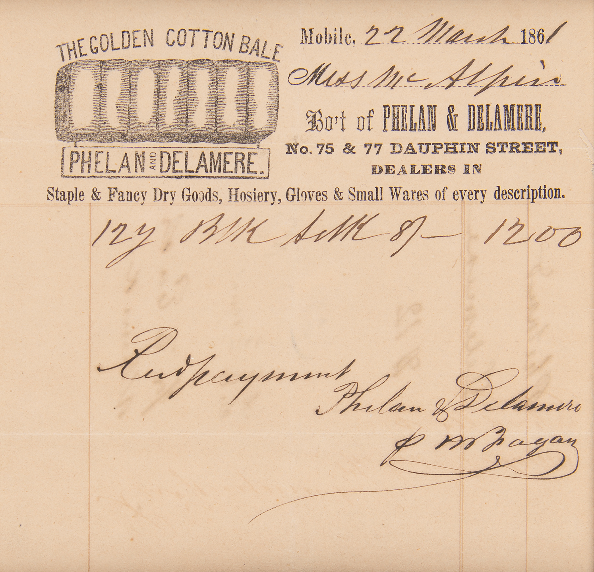 Civil War–era manuscript document, one page, 5 x 5, March 22, 1861. Receipt in the amount of $12 from the Golden Cotton Bale, Phelan & Delamere, "dealers in staple & fancy dry goods, hosiery, gloves & small wares of every description," located on Dauphin Street in Mobile, Alabama. Nicely cloth-matted and framed with a plaque to an overall size of 13 x 17. In fine condition.