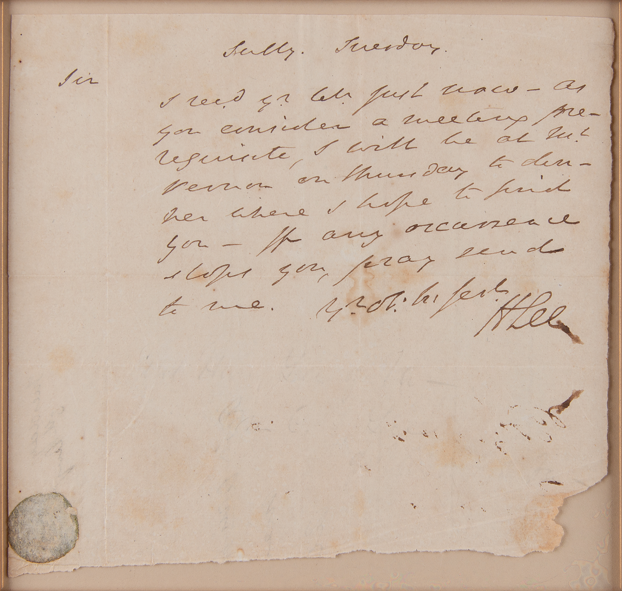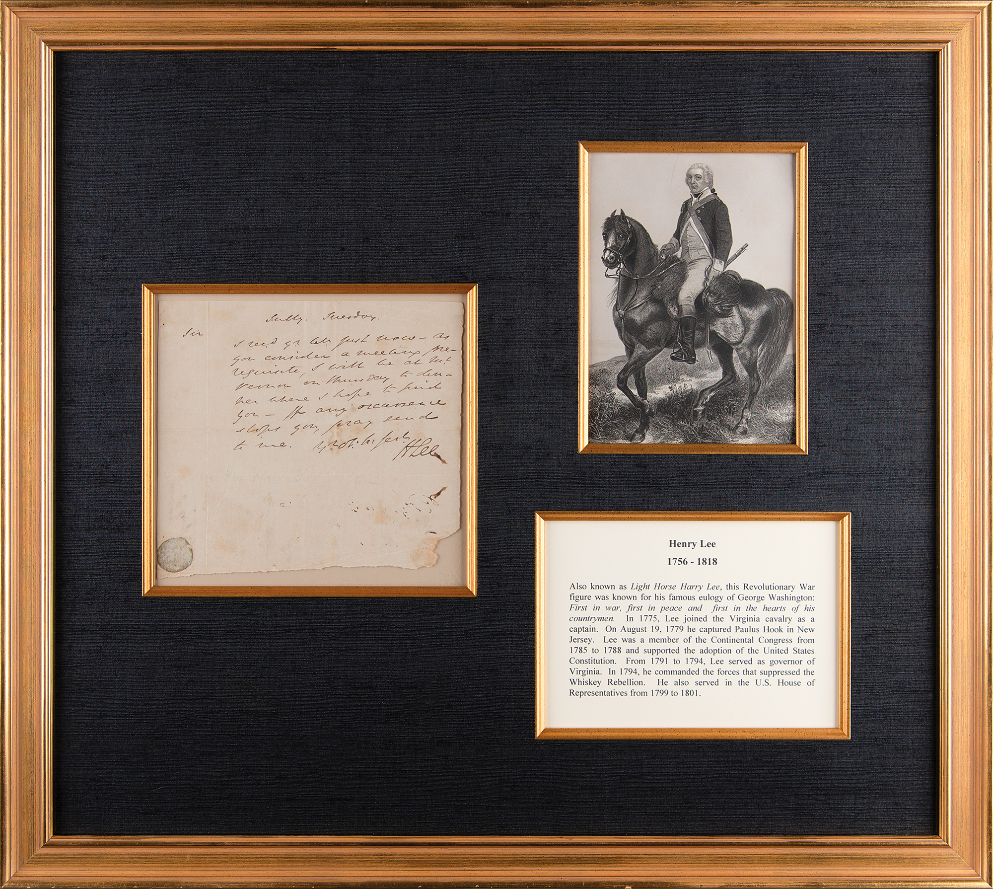 Nicknamed 'Light-Horse Harry,' Lee (1756–1818) was a Revolutionary War hero who captured British posts in New York and in the South; he later served as governor of Virginia and as a US congressman, and was the father of Robert E. Lee. ALS signed “H. Lee,” one page, 7.5 x 6.75, no date. Handwritten letter to a gentleman, in part: "I rec'd y'r let'r just now—as you consider a meeting prerequisite, I will be at Mt. Vernon on Thursday to dinner where I hope to find you." Exquisitely cloth-matted and framed with an engraved portrait and biographical caption to an overall size of 23.5 x 21. In fine condition, with a few light stains, and paper loss to the lower right corner.