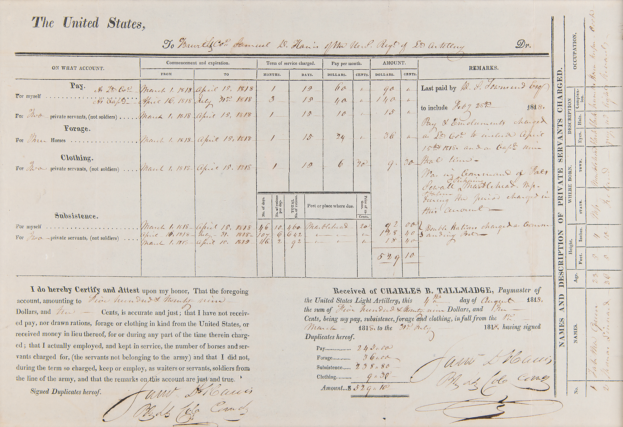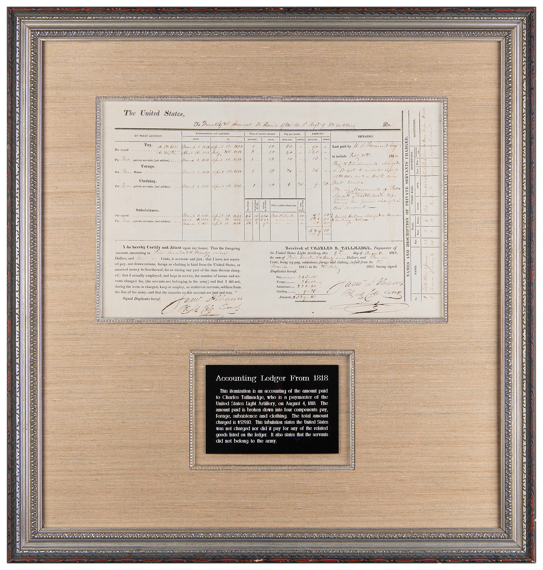 Partly-printed DS, one page, 15.25 x 9.75, August 4, 1818. Accounting ledger of the amount received of Charles Tallmadge, paymaster of the United States Light Artillery, to cover pay, forage, clothing, and subsistence from March–July 1818, totaling $529.10. Nicely cloth-matted and framed with a descriptive plaque to an overall size of 23.75 x 25. In fine condition.