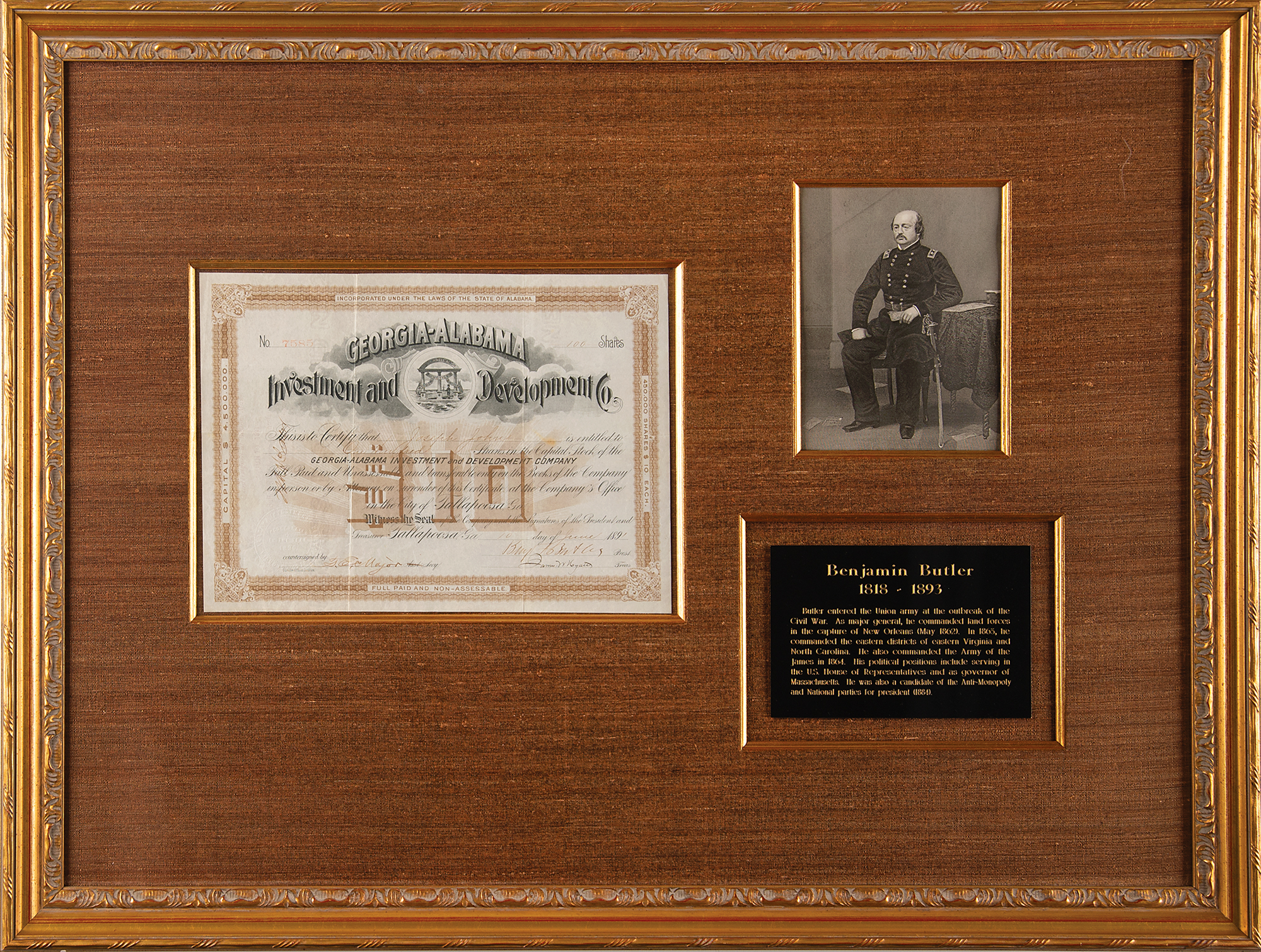 Partly-printed DS, signed “Benj. F. Butler,” one page, 10.75 x 7.75, June 10, 1891. Stock certificate issued to Joseph John for 100 shares of capital stock of the Georgia-Alabama Investment and Development Company. Signed at the conclusion by Benjamin Butler as the company's president, and countersigned by James W. Hyatt as treasurer. Handsomely cloth-matted and framed with an engraved portrait and plaque to an overall size of 28.5 x 21.75. In fine condition.