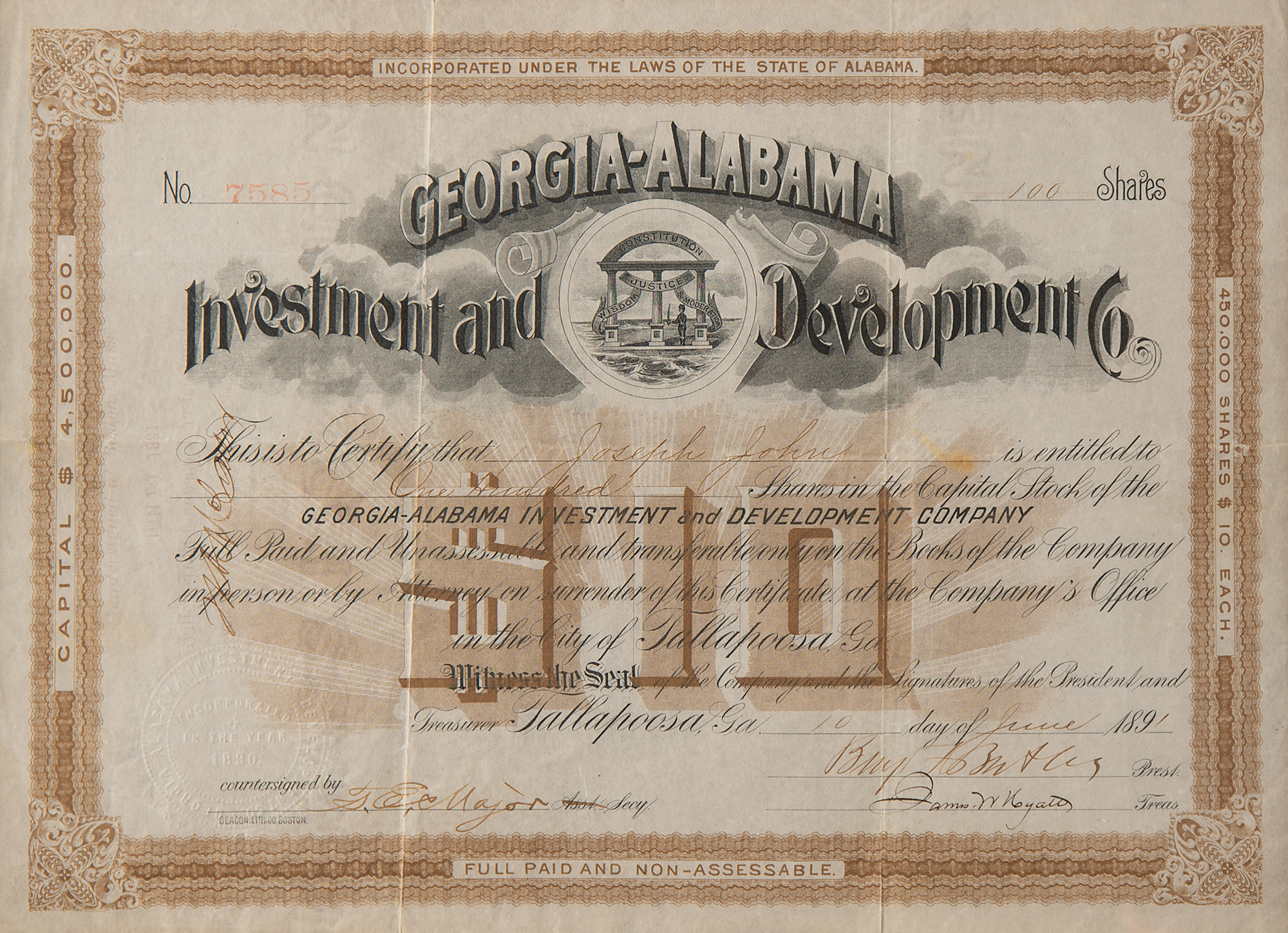 The Georgia-Alabama Investment and Development Company was chartered by Ralph Spencer in 1890 to attract manufacturing to Tallapossa, a boom town established during Georgia's first gold rush. Instead, Spencer and several board members embezzled investor funds and the company collapsed in 1892. With over 10,000 investors financially ruined, the scandal gained national attention.