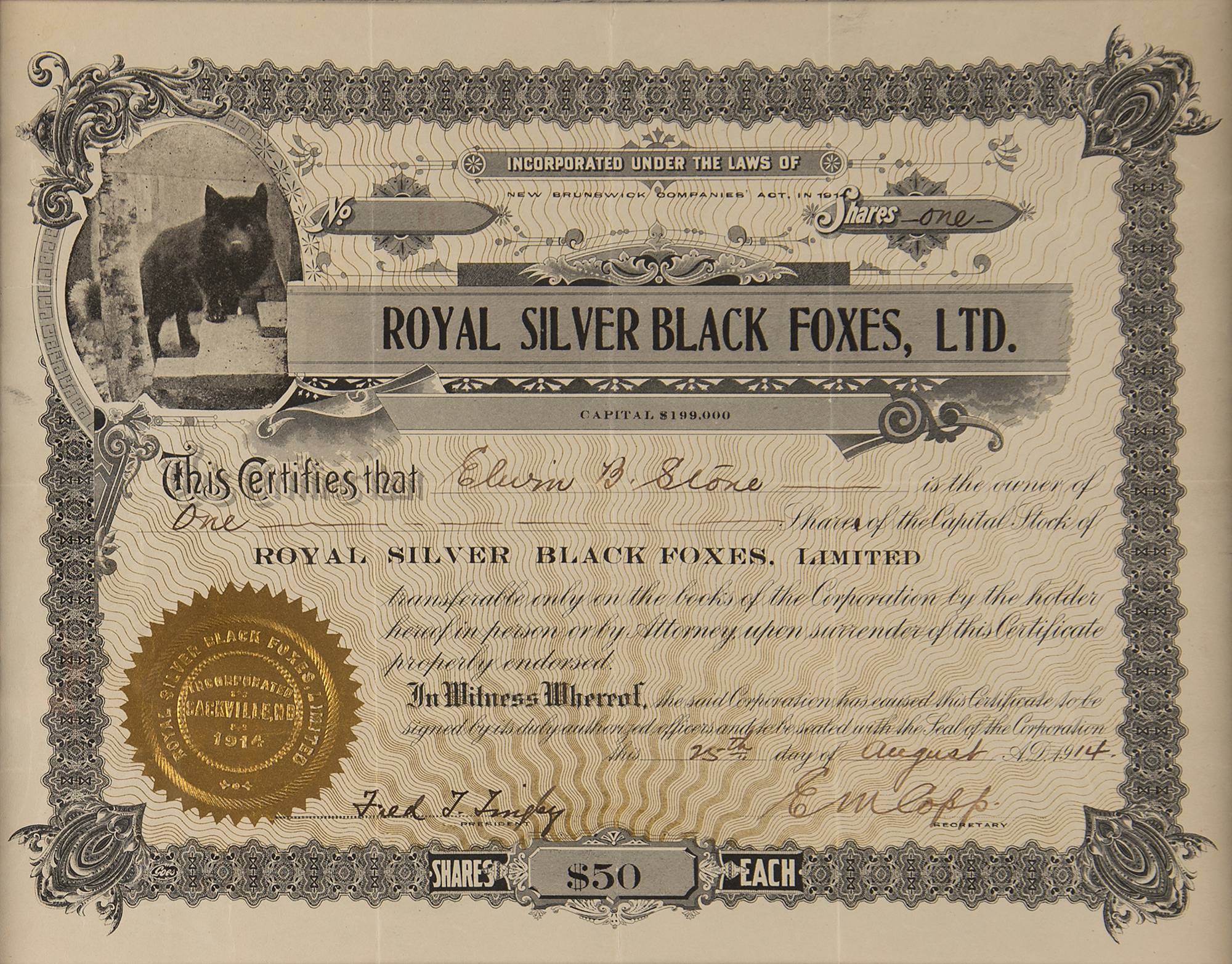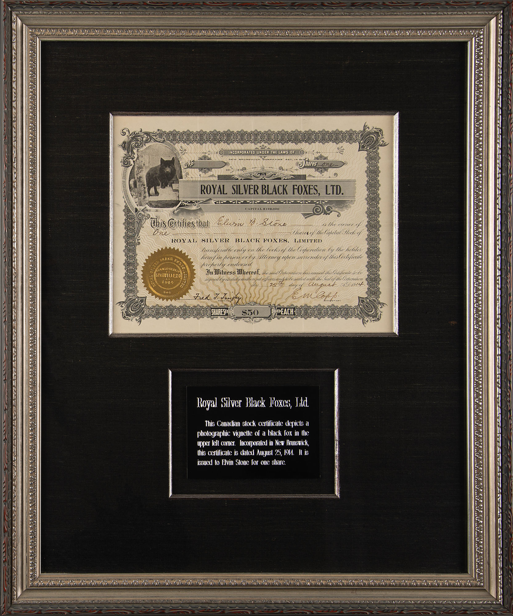 Stock certificate for one share in Royal Silver Black Foxes Ltd., one page, 10.5 x 8.25, August 25, 1915, signed in ink by the company's president and secretary. The certificate features a handsome vignette of a black fox in the upper left, and an ornate border. Nicely cloth-matted and framed with a plaque to an overall size of 19.25 x 23.25. In fine condition.