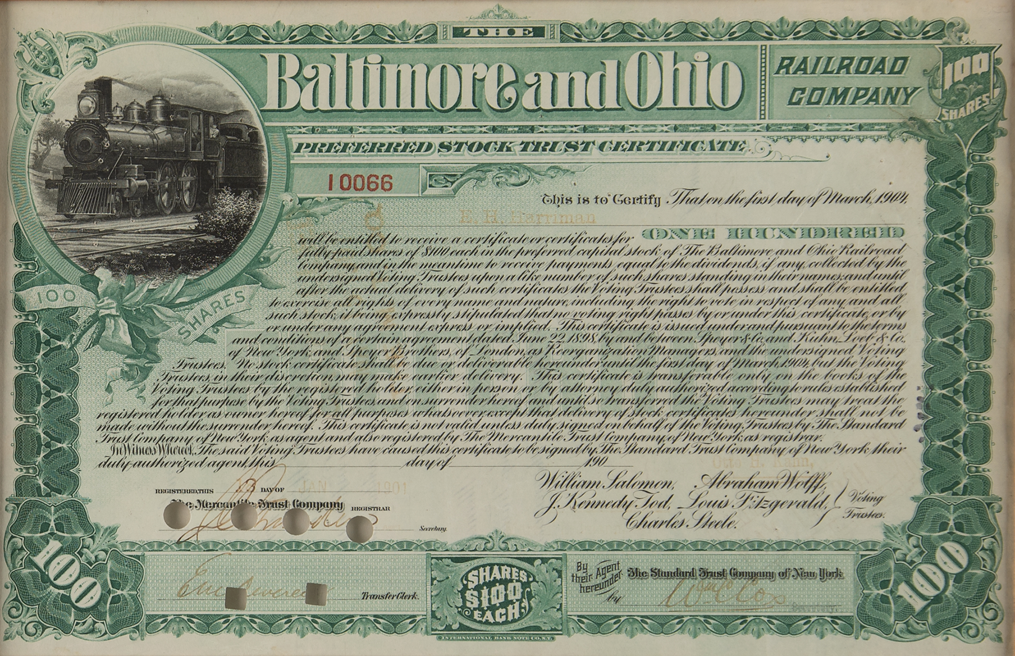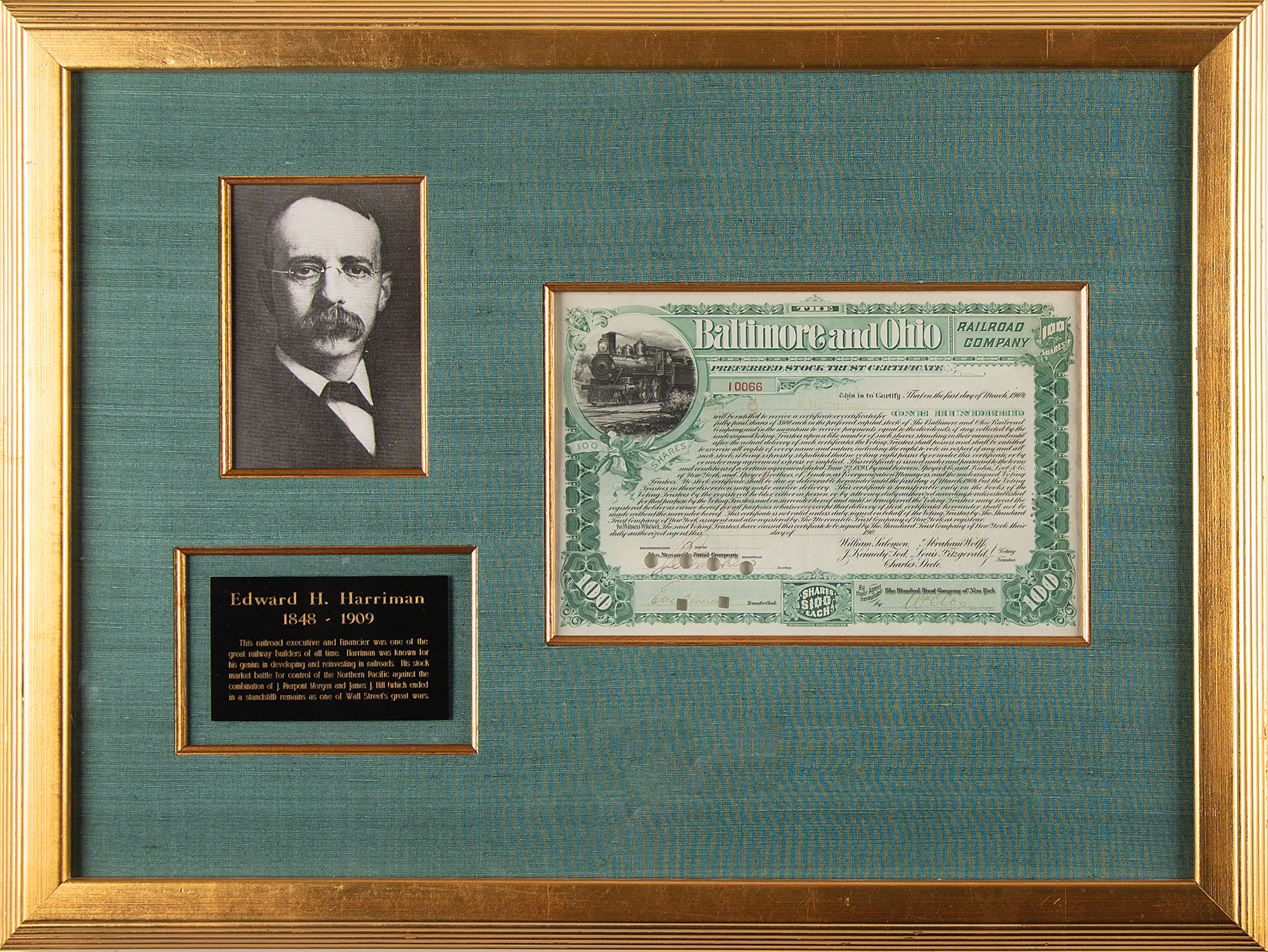 American railroad executive (1848–1909) who controlled several railways in his lifetime, influencing much of the US economy. Partly-printed DS, signed “E. H. Harriman,” one page, 11 x 7.25, January 13, 1901. Stock certificate issued to Harriman for 100 shares of the Baltimore and Ohio Railroad Company, endorsed on the reverse by Harriman. The certificate features a handsome vignette of a steam engine. Nicely cloth-matted and framed with a portrait and plaque to an overall size of 26.75 x 20, with a window in the backing for viewing the reverse. In fine condition.