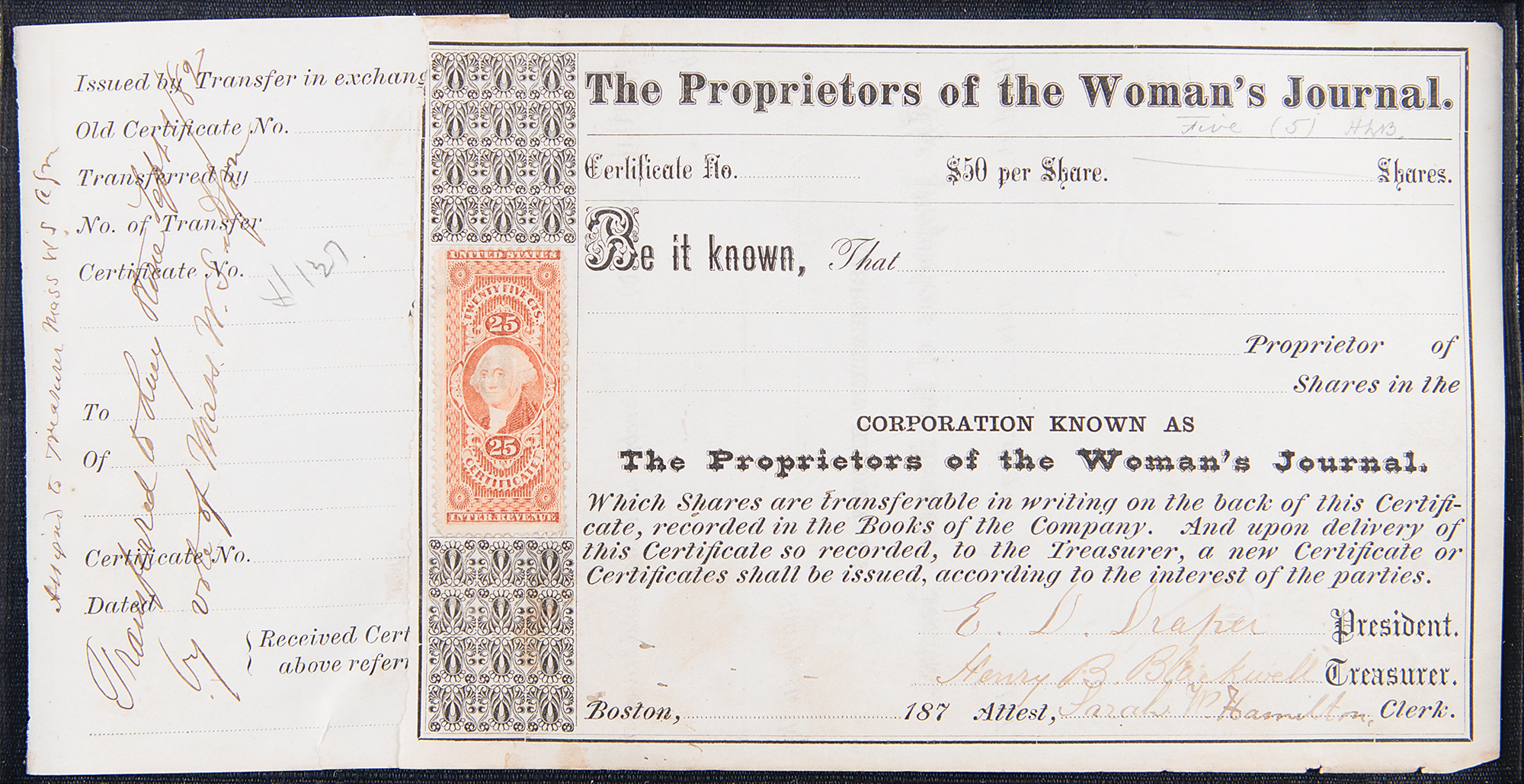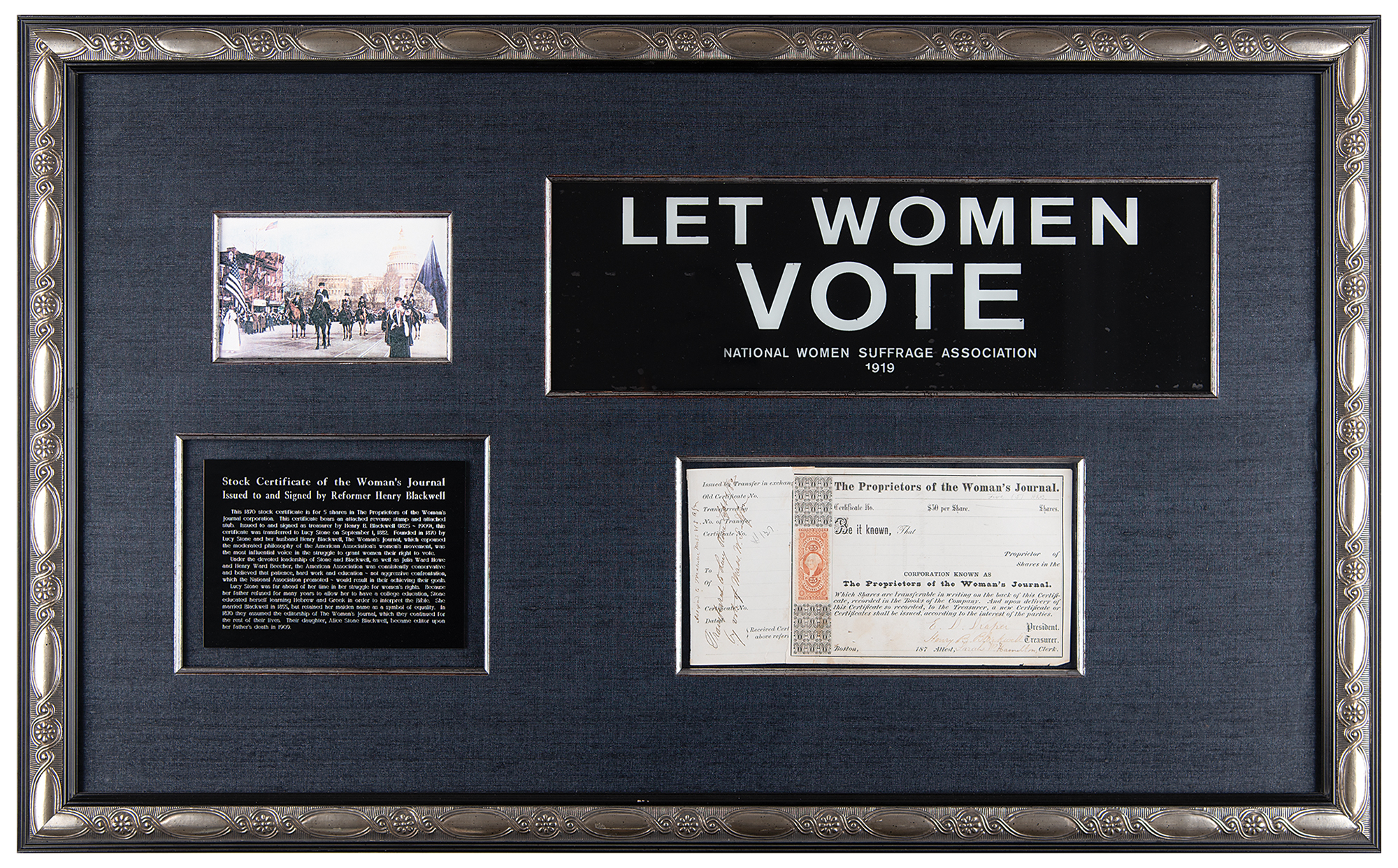 American advocate for social and economic reform (1825-1909), and husband of Lucy Stone, with whom he helped found the American Woman Suffrage Association. Partly-printed DS, signed “Henry B. Blackwell,” one page, 10 x 5, no date but circa 1870s. Unaccomplished stock certificate for shares in the Woman's Journal, signed at the conclusion by President E. D. Draper, Treasurer Henry B. Blackwell, and Clerk Sarah Hamilton; a note on the receipt affixed to the left side indicates that the shares were transferred to Blackwell's wife and fellow activist, Lucy Stone. Impressively cloth-matted and framed with an image and 'Let Women Vote' placard to an overall size of 36 x 22. In fine condition.