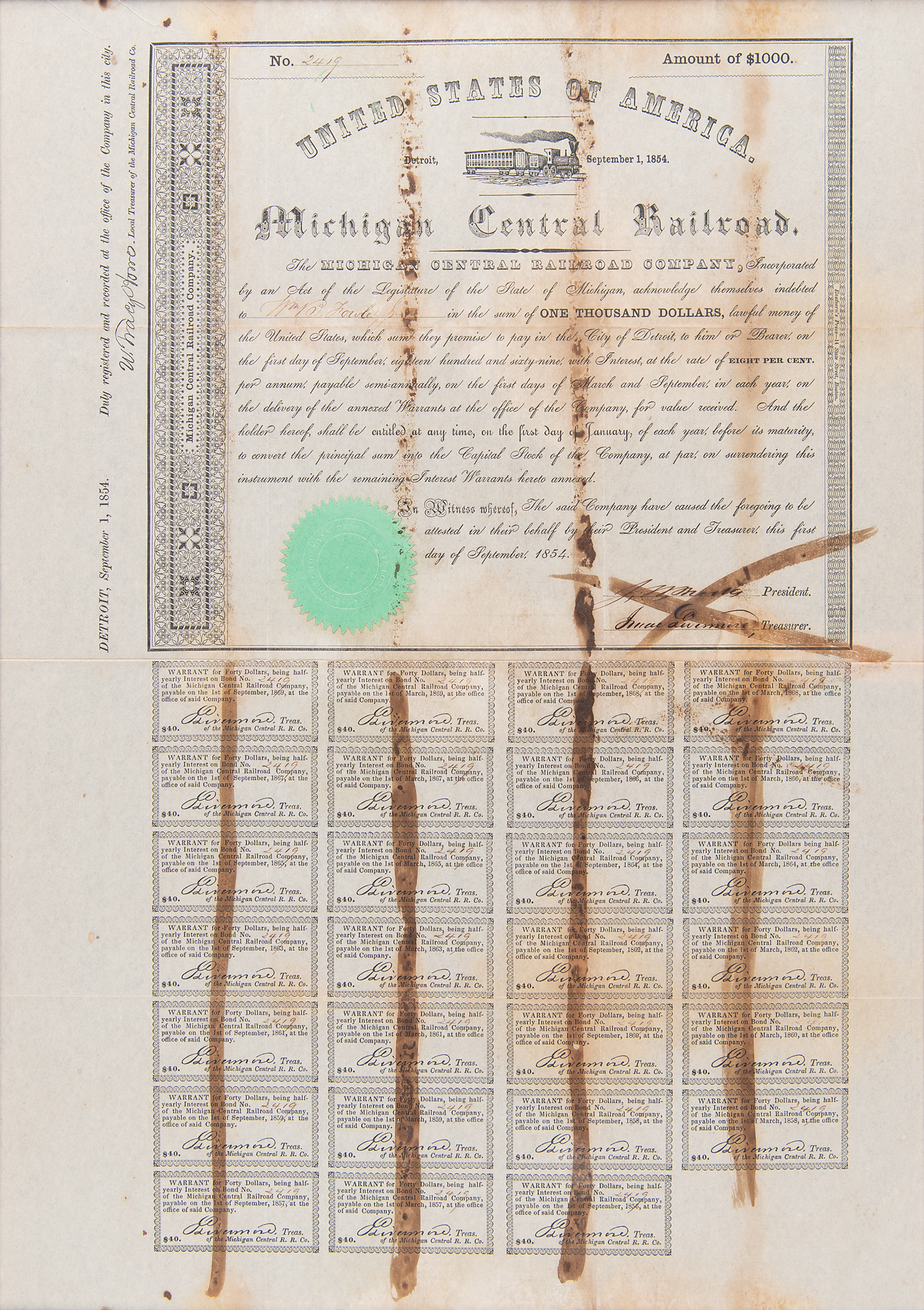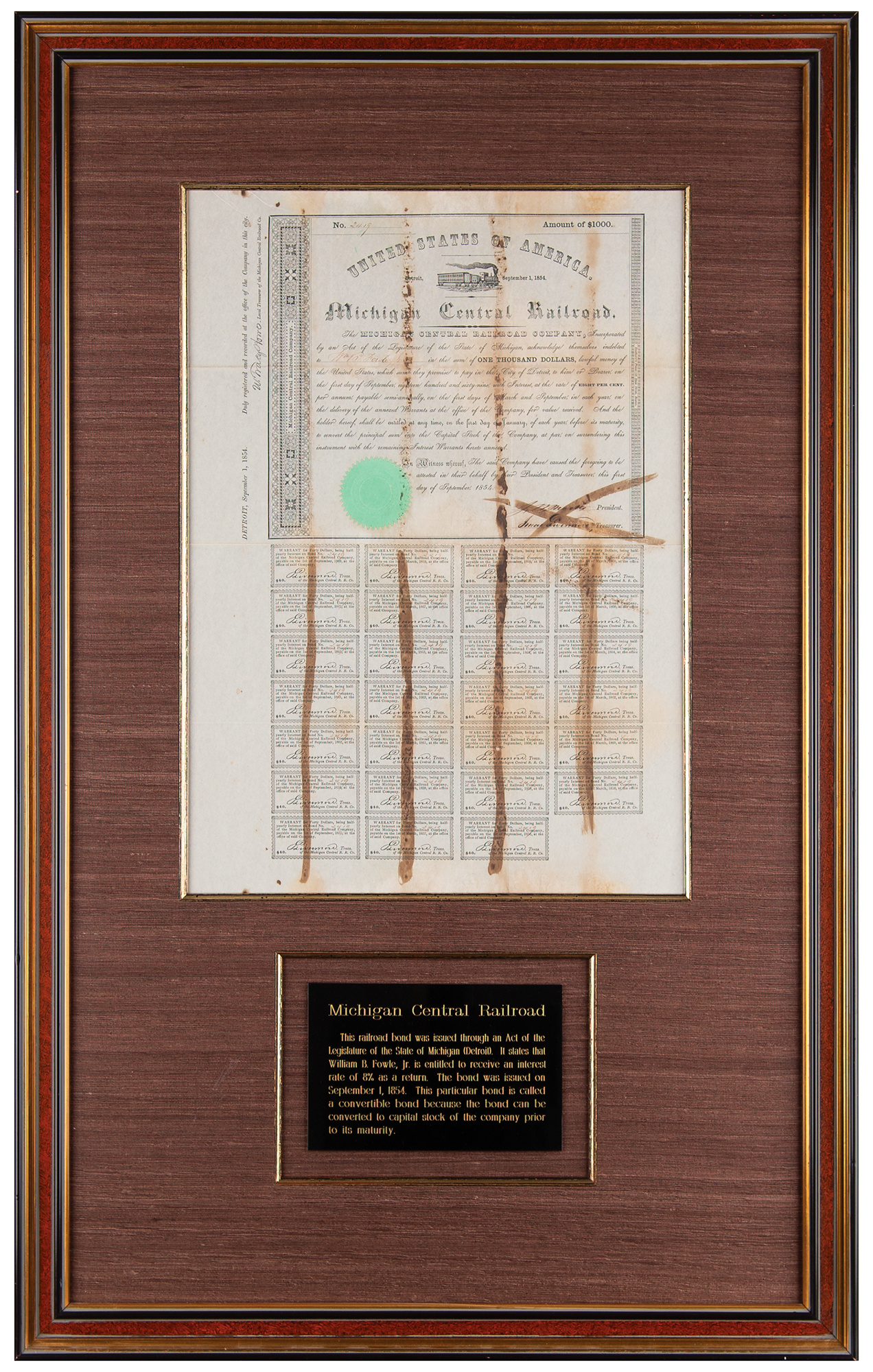 Bond of the Michigan Central Railroad in the amount of $1000, one page, 11.5 x 16.25, September 1, 1854, signed in ink by the company's president and treasurer. Retains 27 coupons intact below. Attractively cloth-matted and framed with a plaque to an overall size of 19.5 x 31.25. In very good to fine condition, with staining along the folds.