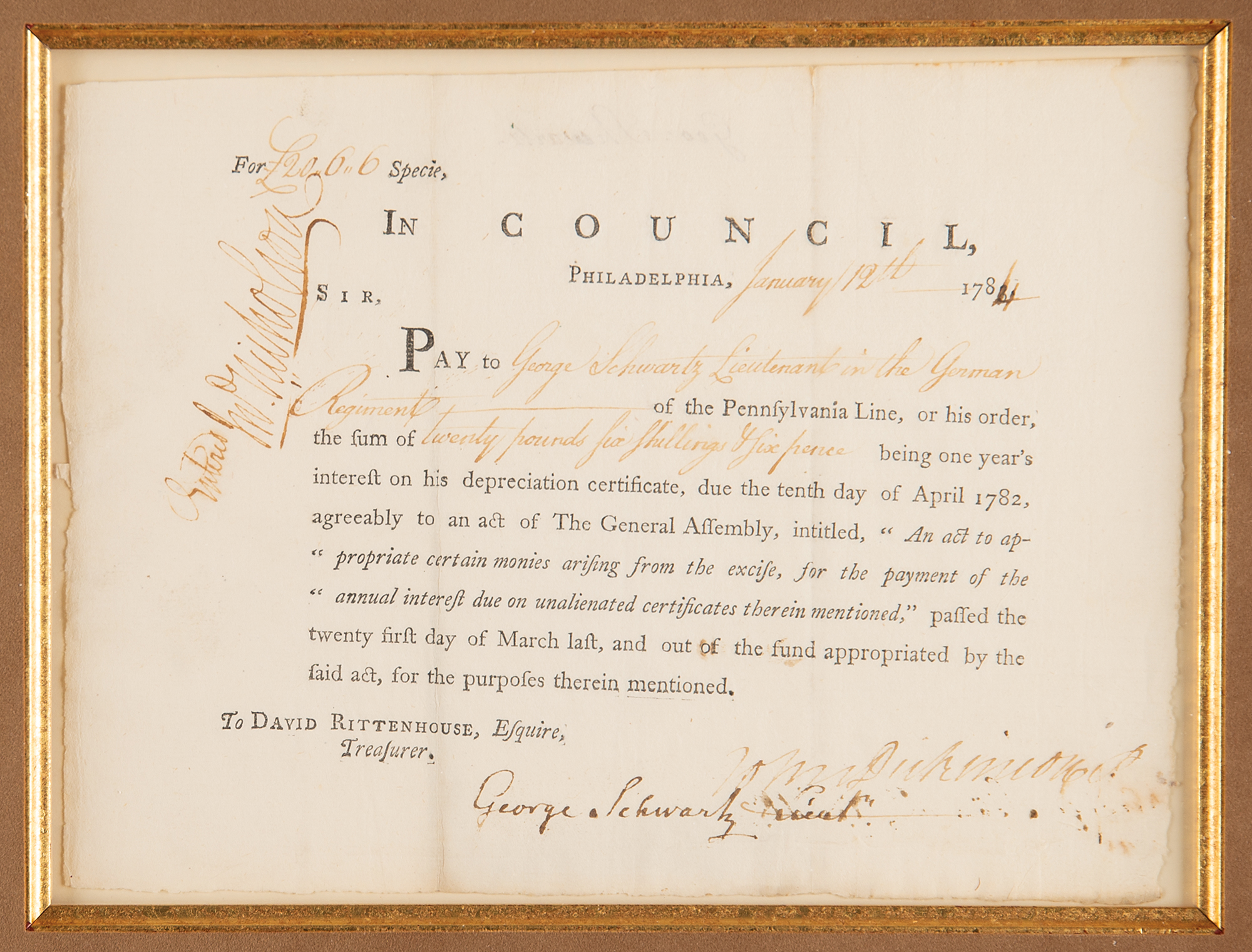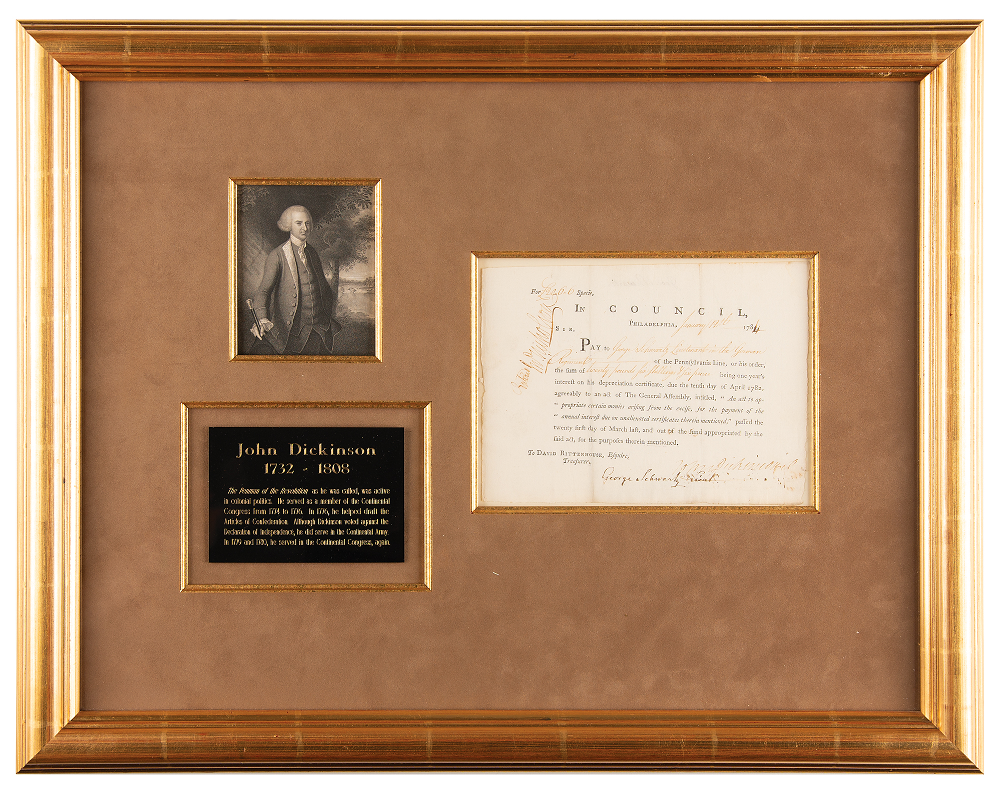 Lawyer and signer of the Constitution from Delaware (1732–1808) who also served as an officer during the Revolutionary War, governor of Delaware, and governor of Pennsylvania. Partly-printed DS, one page, 8.25 x 6.25, January 12, 1784. Pay order issued to Treasurer David Rittenhouse, in part: "Pay to George Schwartz, Lieutenant in the German Regiment of the Pennsylvania Line, or his order, the sum of twenty pounds six shillings & six pence being one year's interest on his depreciation certificate." Signed at the conclusion in ink by John Dickinson, countersigned in the upper left by John Nicholson, and endorsed at the bottom by George Schwartz. Handsomely suede-matted and framed with a portrait and biographical plaque to an overall size of 24.5 x 19.5. In fine condition.
