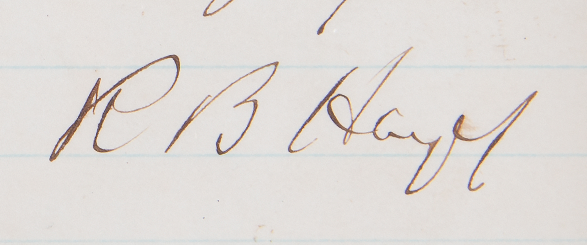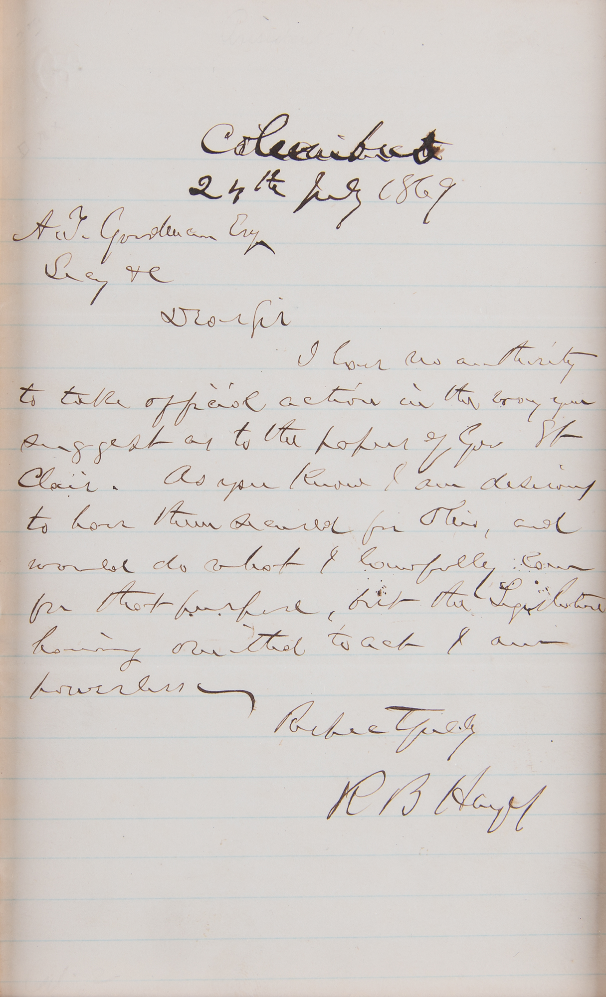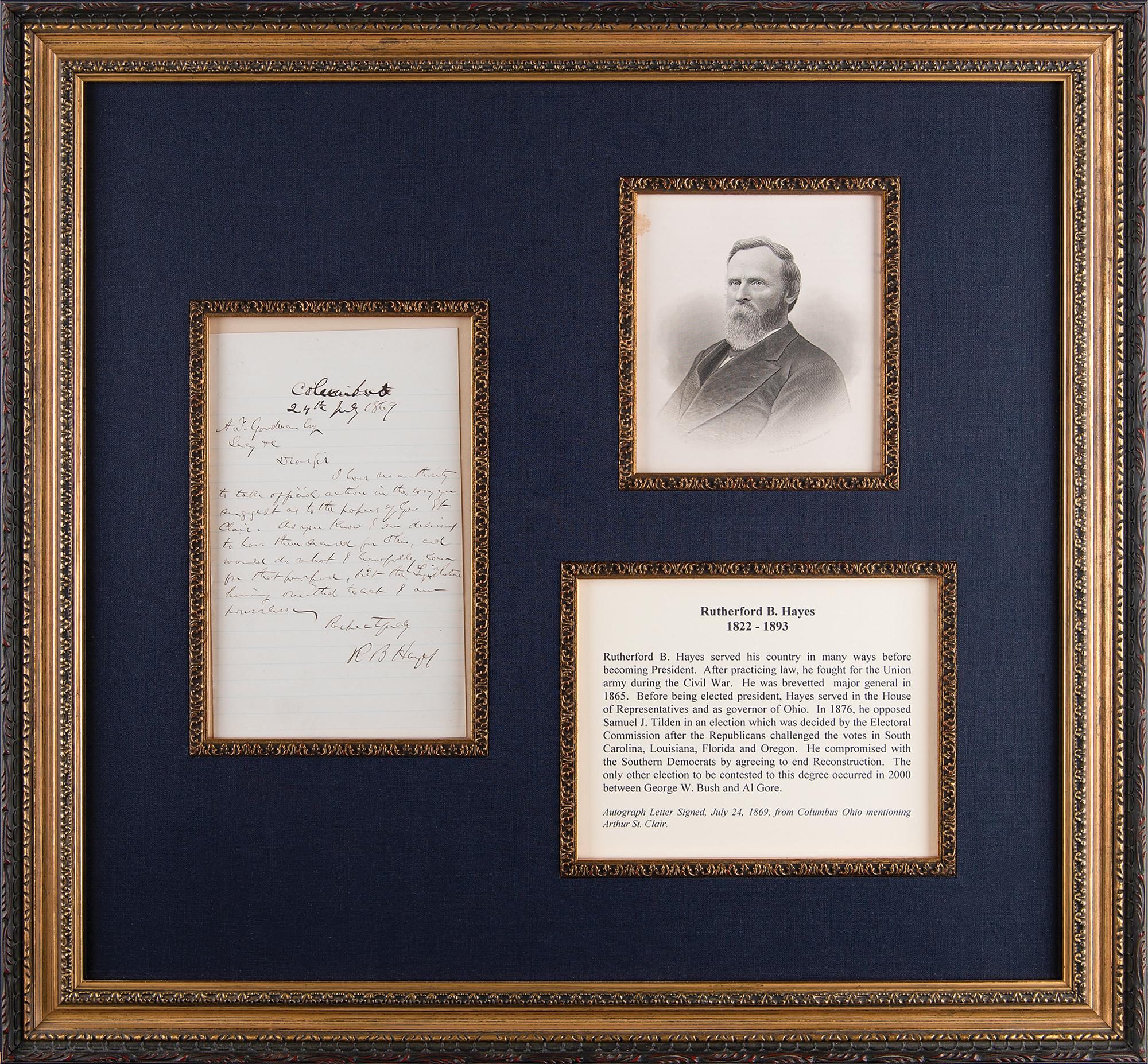 ALS signed “R. B. Hayes,” one page, 5 x 8, July 24, 1869. Handwritten letter referring to Arthur St. Clair, who had served as first governor of the Northwest Territory, in what is now Ohio, from 1788 to 1802. In part: "I have no authority to take official action in the way you suggest as to the papers of Gov. St. Clair. As you know, I am desirous to have them secured for Ohio, and would do what I lawfully can for that purpose." Impressively cloth-matted and framed with an engraved portrait and biographical caption to an overall size of 22 x 20.5. In fine condition.
