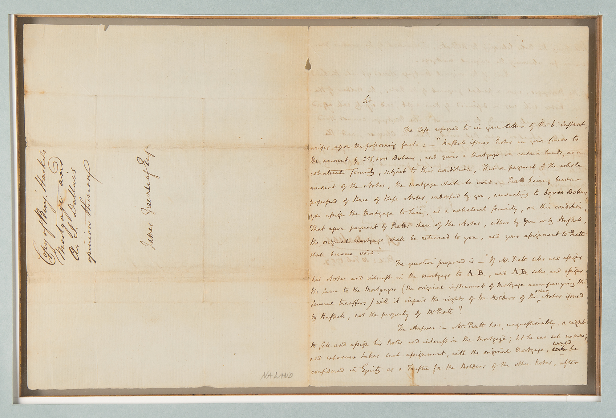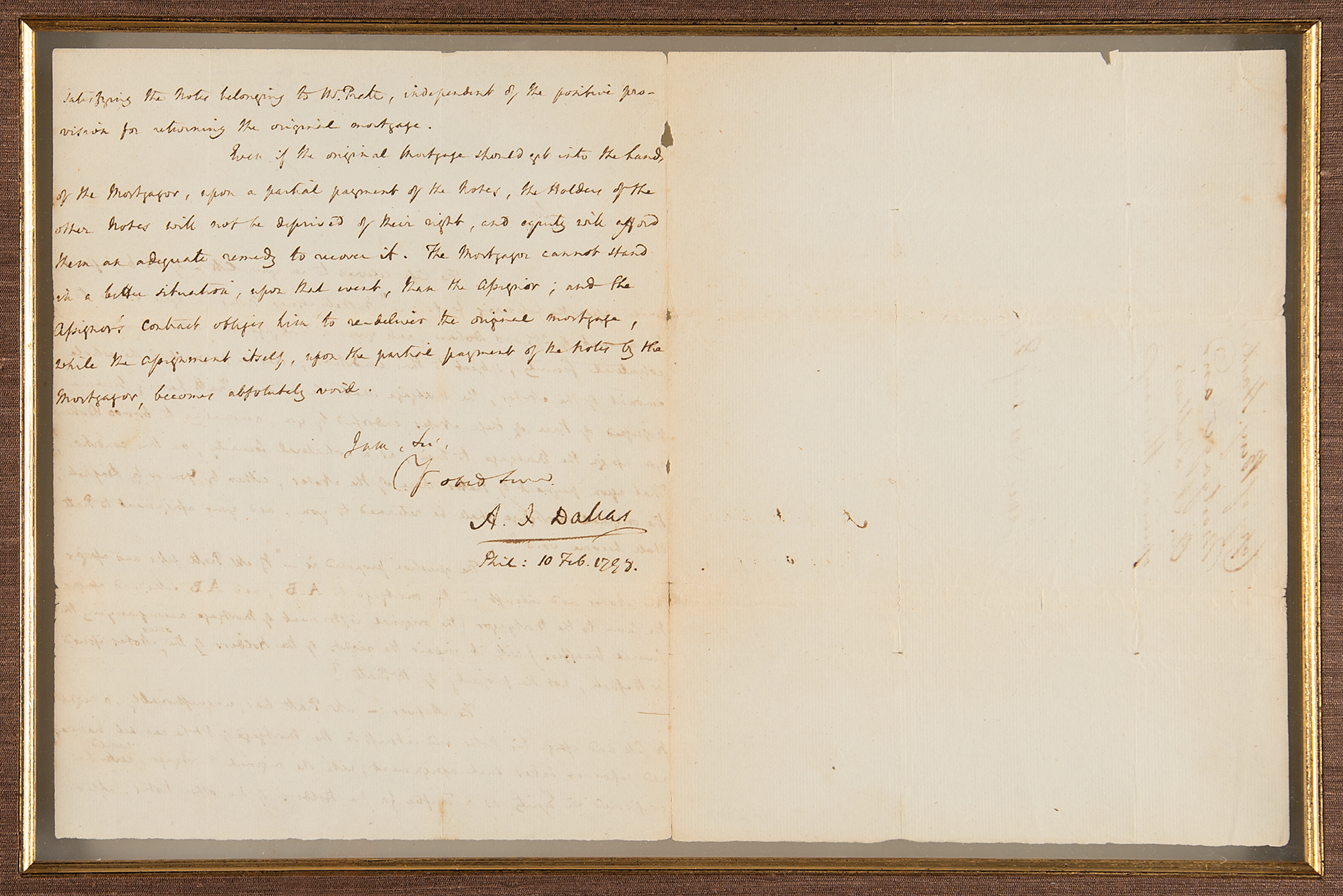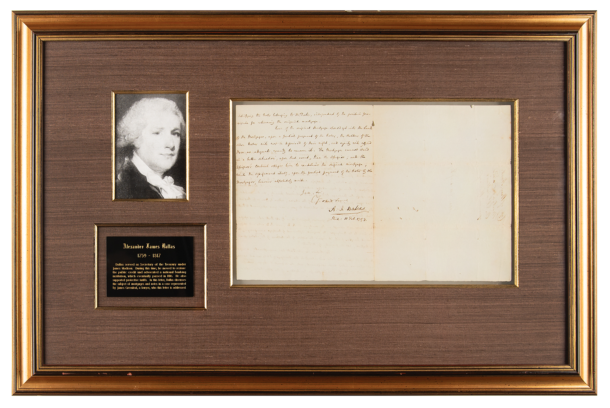 American statesman (1759–1817) who served as Secretary of the Treasury under James Madison. ALS signed “A. J. Dallas,” one page both sides, 8 x 10, February 10, 1798. Handwritten letter conveying his opinion on a mortgage, in part: "The question proposed is— 'If Mr. Pratt sells and assigns his Notes and interest in the mortgage to A.B., and A.B. sells and assigns the same to the Mortgagor (the original instrument of Mortgage accompanying the several transfers) will it impair the rights of the Holders of the other Notes issued…not the property of Mr. Pratt?' The answer:—Mr. Pratt has, unquestionably, a right to sell and assign his notes and interest in the Mortgage…whoever takes such assignment, with the original Mortgage would be considered in Equity as a Trustee for the Holders of the other Notes, after satisfying the notes belonging to Mr. Pratt, independent of the positive provision for returning the original Mortgage." Impressively cloth-matted and framed with a portrait and plaque to an overall size of 34 x 22.5, with a window in the backing for viewing the reverse. In fine condition, with minor paper loss along the folds and hinge.