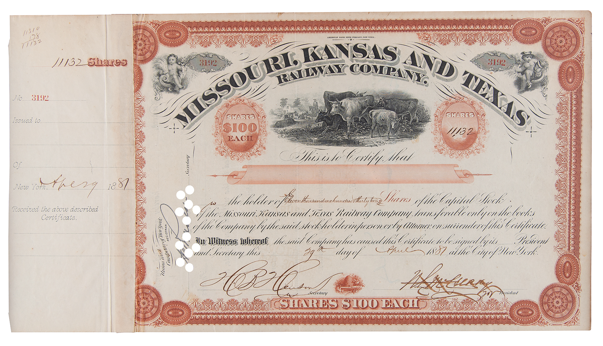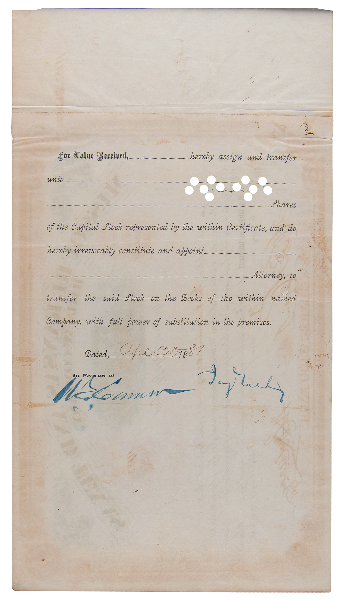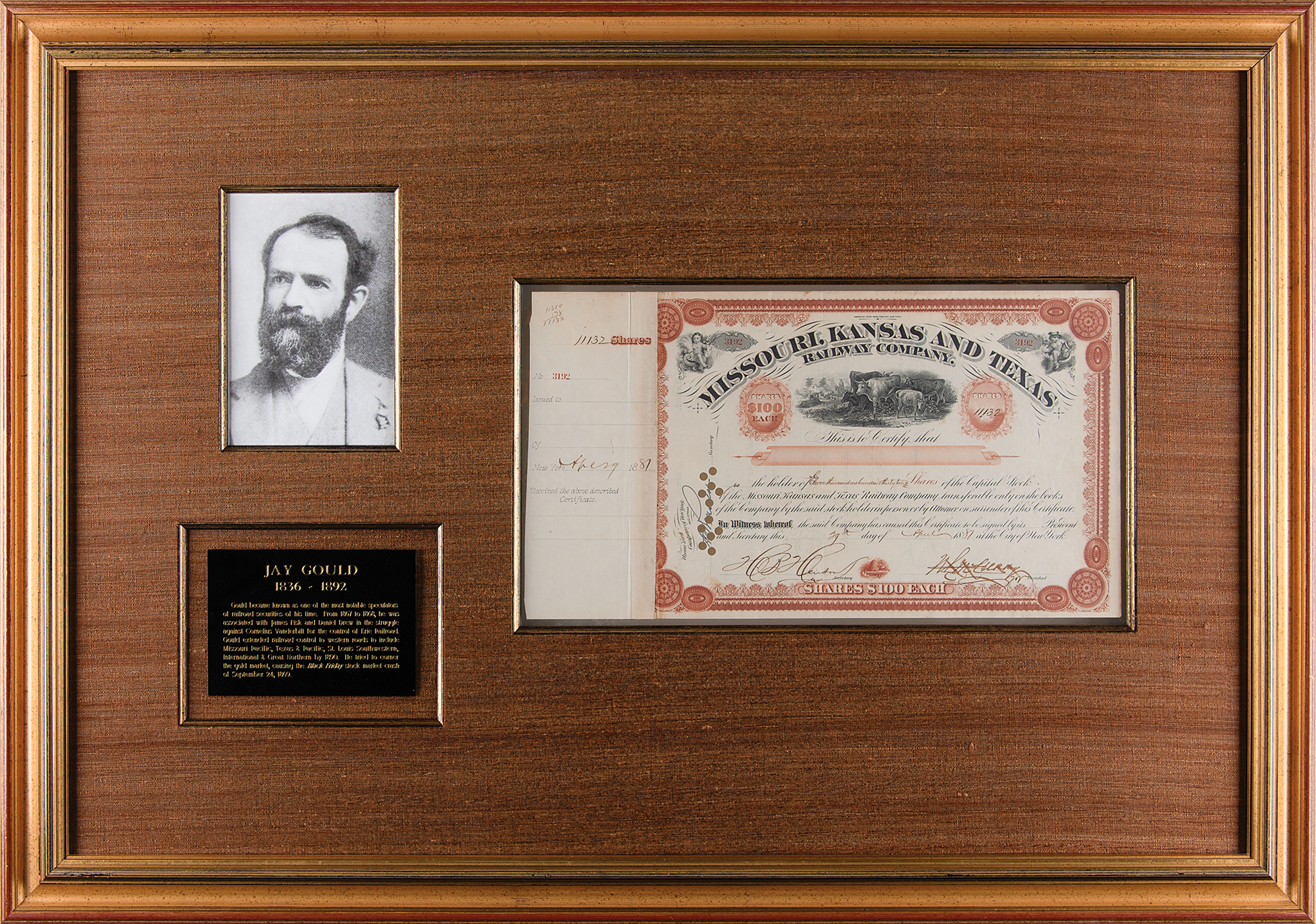 Financier (1836–1892) known for his stock market manipulation of railroad securities; he also tried to corner the gold market, leading to the 'Black Friday' stock market crash of September 1869. Partly-printed DS, one page, 14.25 x 7.75, April 29, 1881. Stock certificate for 11,132 shares in the Missouri, Kansas and Texas Railway Company issued, endorsed on the reverse in blue ink by Jay Gould. The receipt remains affixed to the left edge. Attractively cloth-matted and framed with a portrait and plaque to an overall size of 31.75 x 22.25, with a window in the backing for viewing the opposing side. In fine condition.