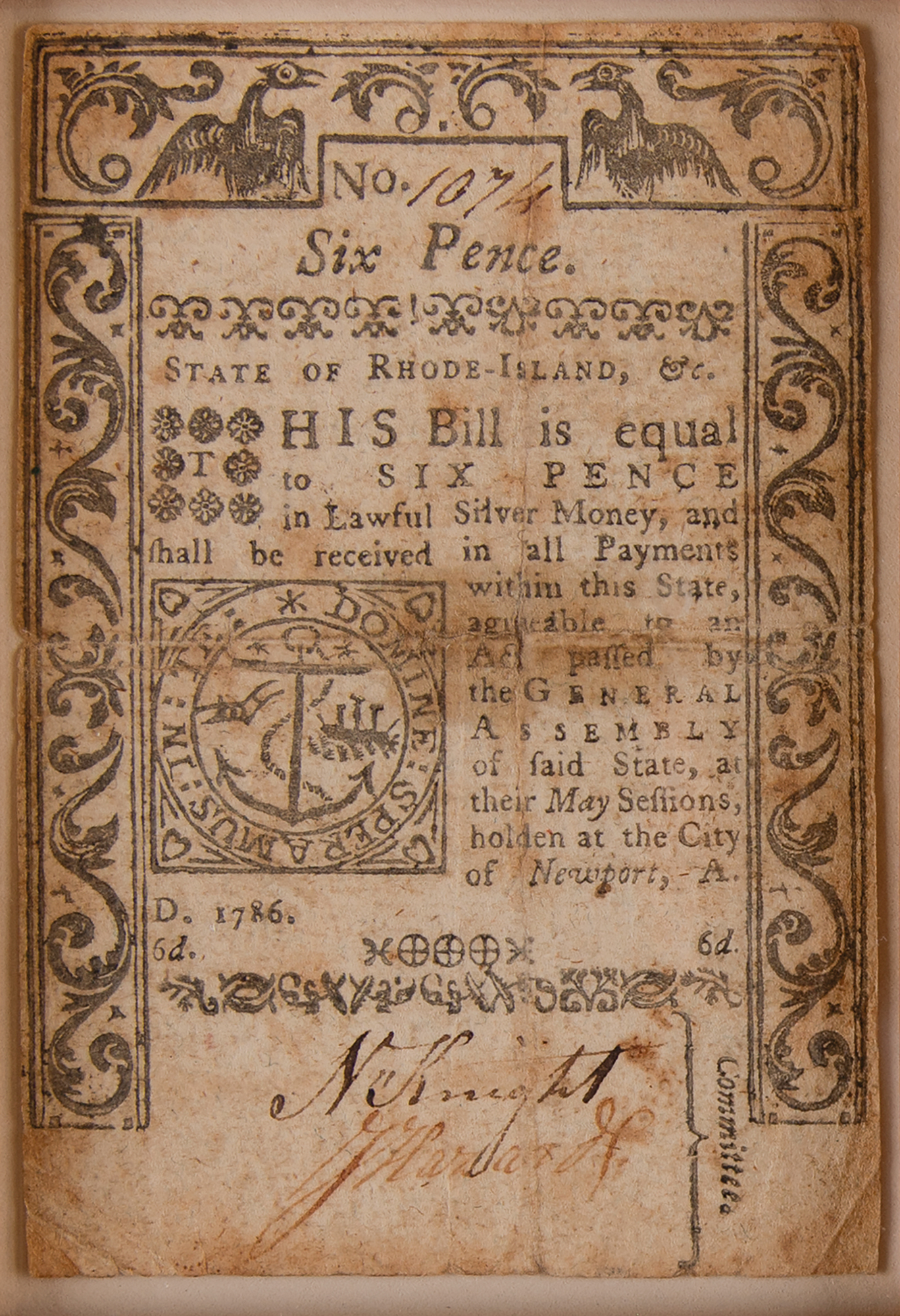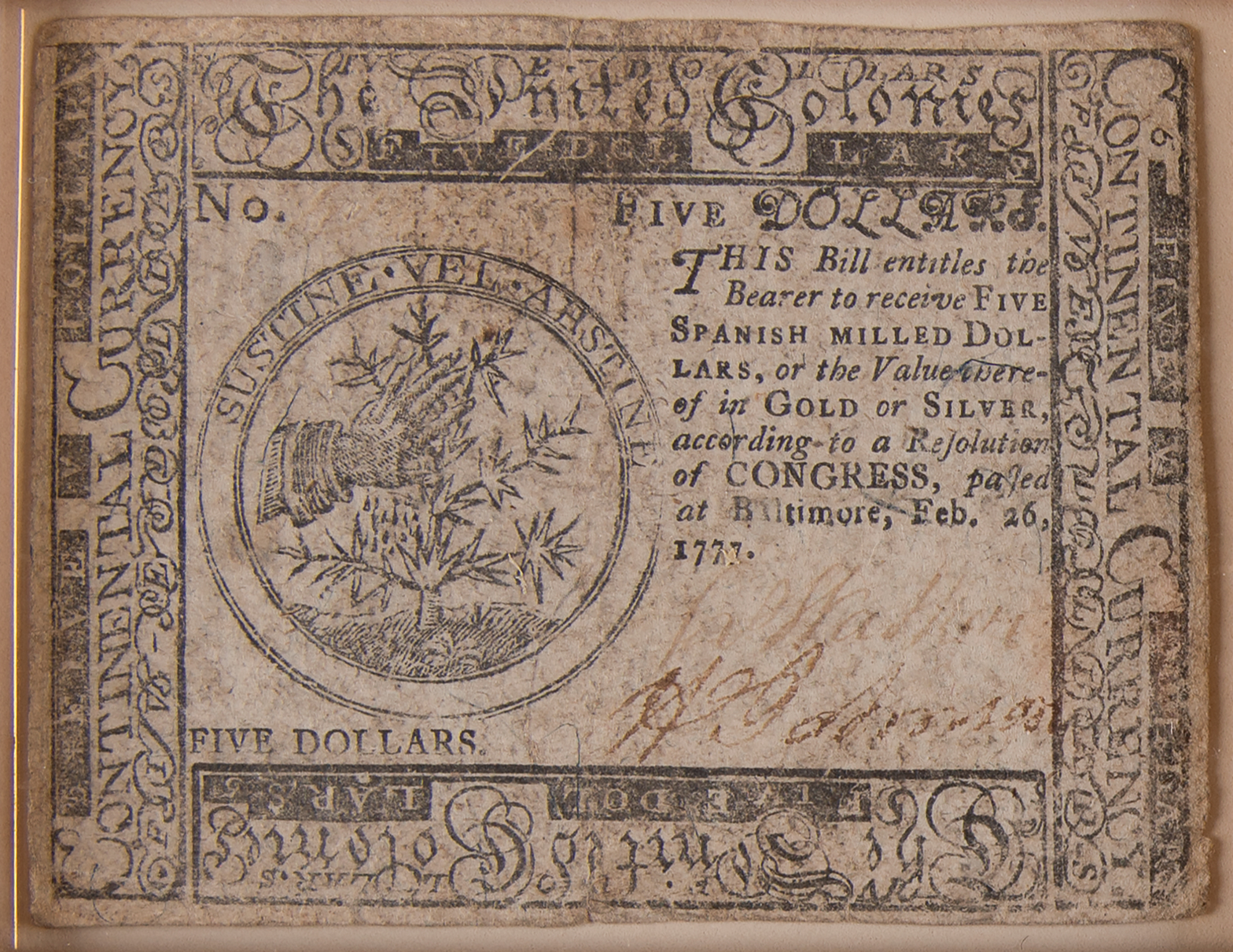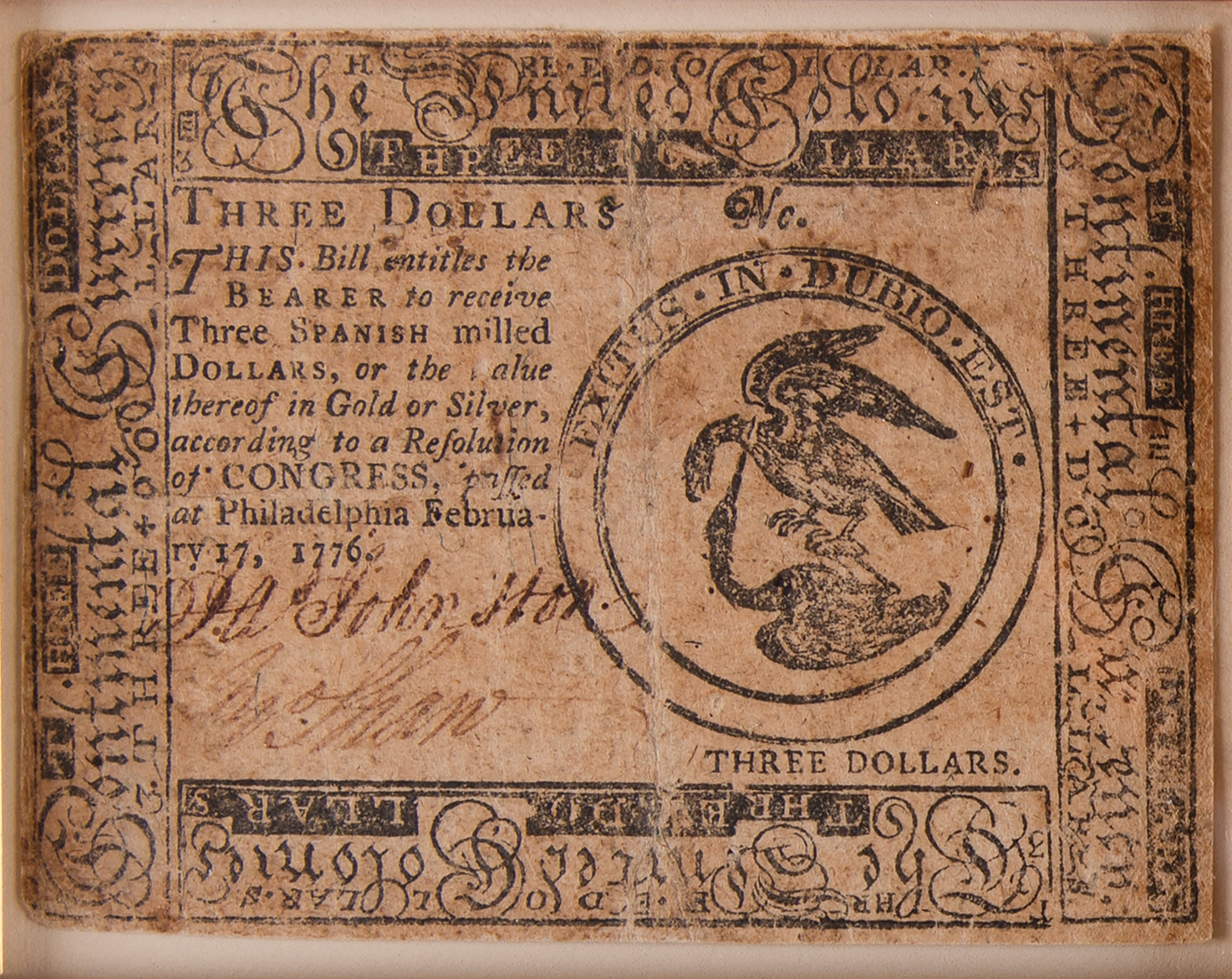 Handsome display featuring three pieces of early American currency, ranging in size from 3.5 x 3 to 2.75 x 4, including: a three-dollar continental note from Philadelphia, February 17, 1776; a five-dollar continental note from Baltimore, February 26, 1777; and a six-pence note from Rhode Island, May 1786. Nicely cloth-matted and framed with an image and caption to an overall size of 22.25 x 19.25. In overall very good to fine condition.