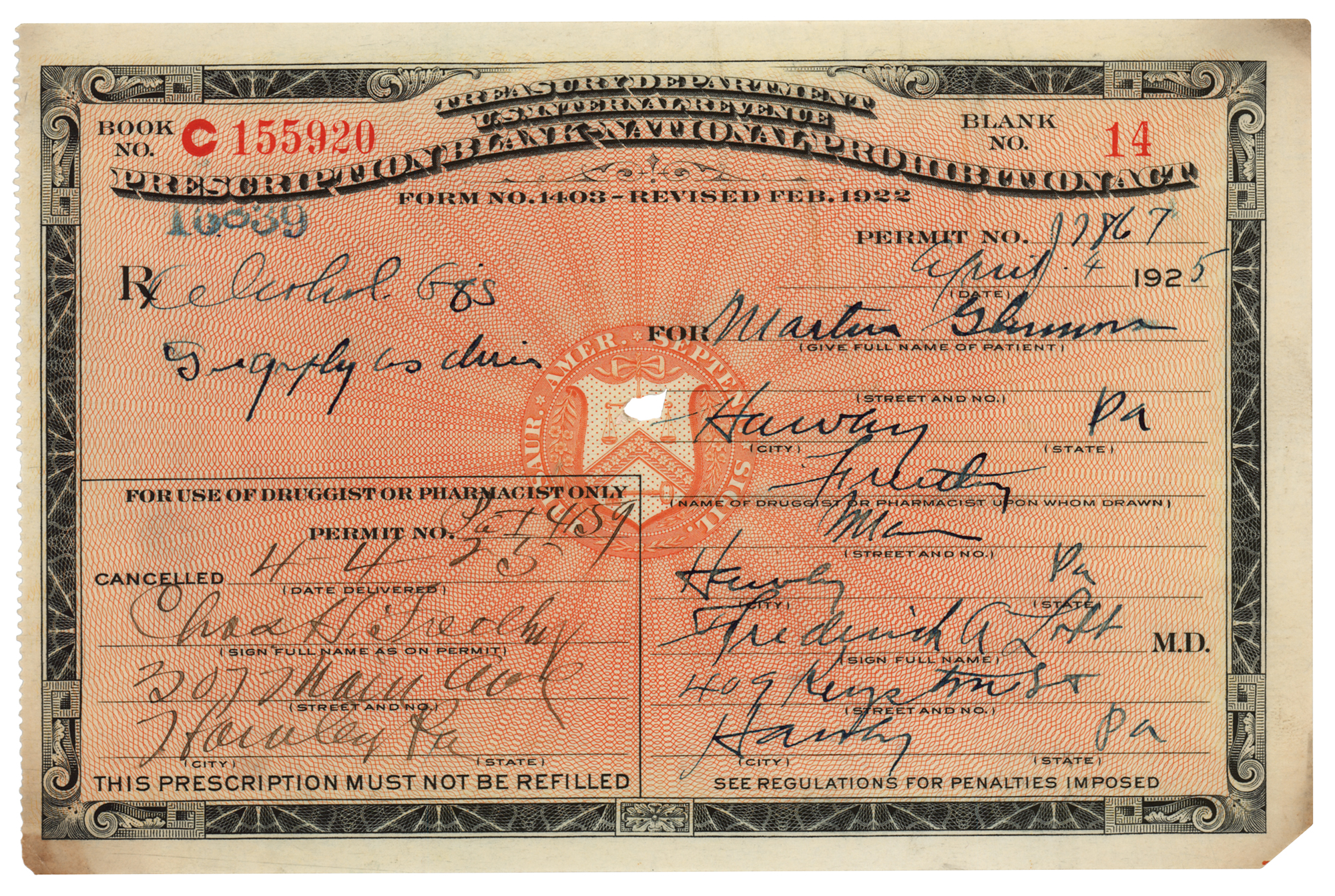Partly-printed document headed "Prescription Blank" issued under the authority of the "National Prohibition Act," one page, 6.75 x 4.5, listing the "Rx" as "Alcohol," and a prescription date of April 4, 1925. Filled by a pharmacist in Hawley, Pennsylvania. In fine condition, with a clipped corner and central cancelation hole.