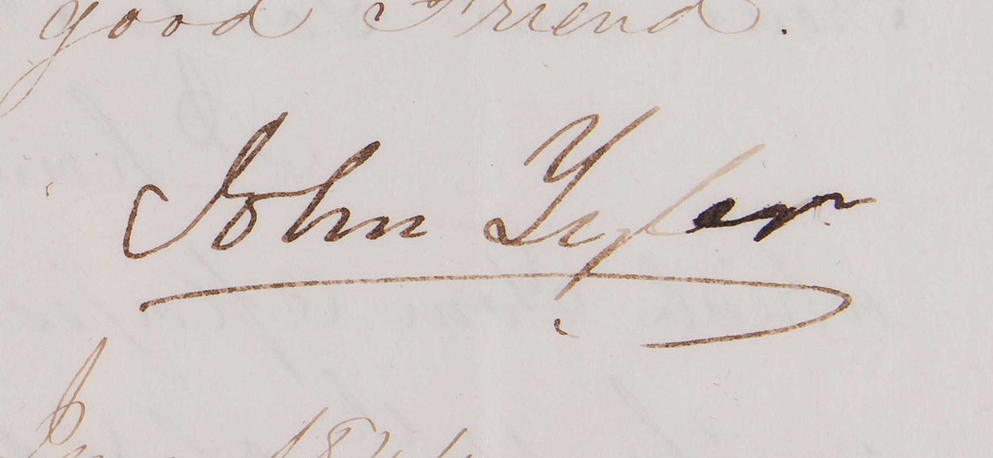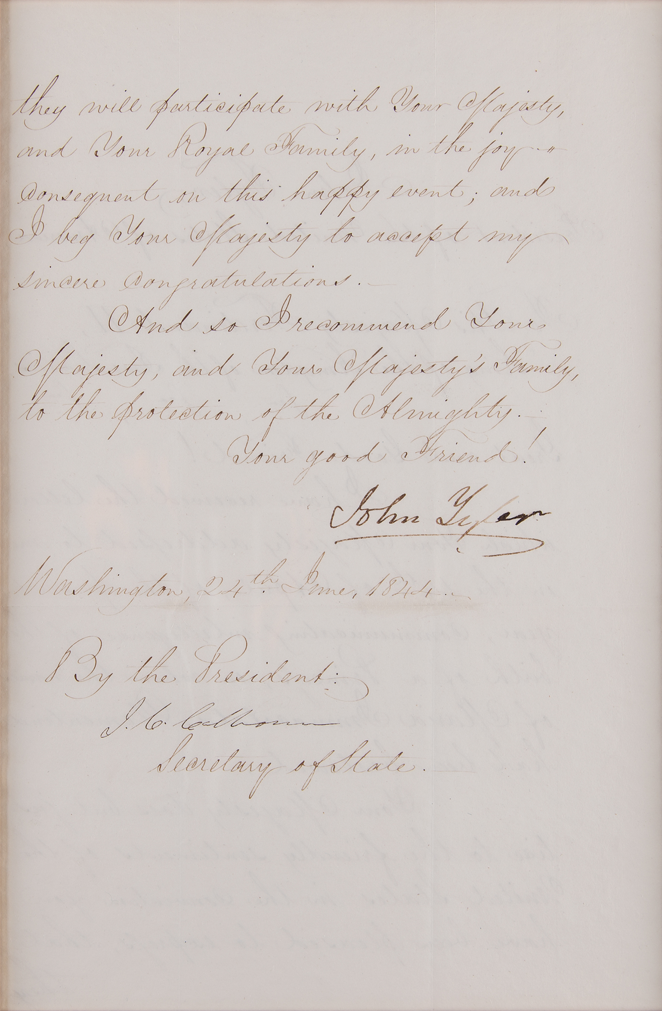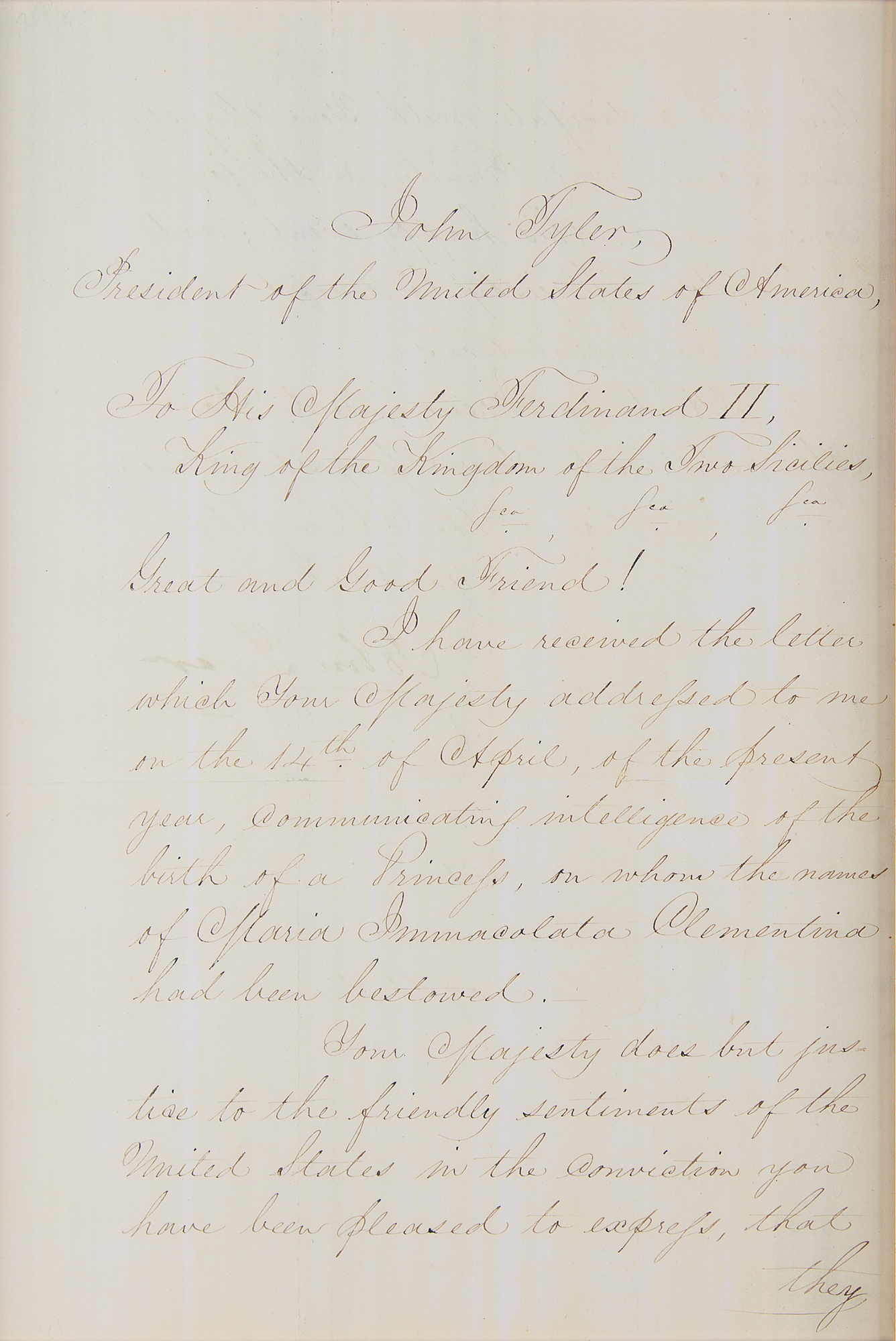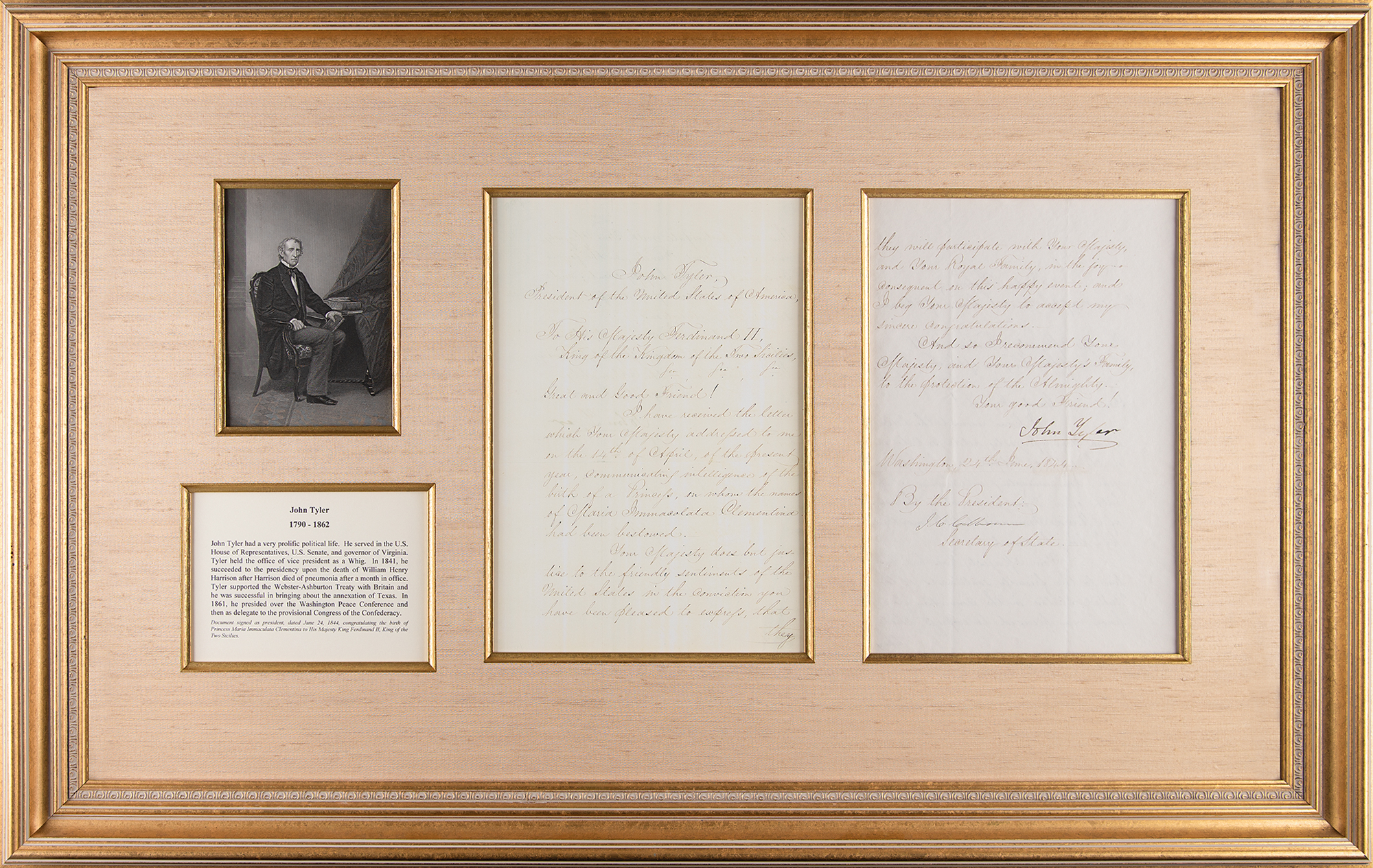 LS as president, one page, 9 x 13.25, June 24, 1844. Official letter of state to "His Majesty Ferdinand II, King of the Kingdom of the Two Sicilies," congratulating him on the birth of a princess. In part: "I have received the letter which Your Majesty addressed to me on the 14th of April, of the present year, communicating intelligence of the birth of a Princess, on whom the names of Maria Immacolata Clementina had been bestowed. Your Majesty does but justice to the friendly sentiments of the United States in the conviction you have been pleased to express, that they will participate with Your Majesty, and Your Royal Family, in the joy consequent on this happy event; and I beg Your Majesty to accept my sincere congratulations." Gorgeously cloth-matted and framed with an engraved portrait and biographical caption to an overall size of 41 x 25.75. In fine condition. Born to Ferdinand II of the Two Sicilies and his wife Maria Theresa of Austria on April 14, 1844, Princess Maria Immaculata of Bourbon-Two Sicilies would go on to become an Austrian archduchess through her marriage to Archduke Karl Salvator of Austria.