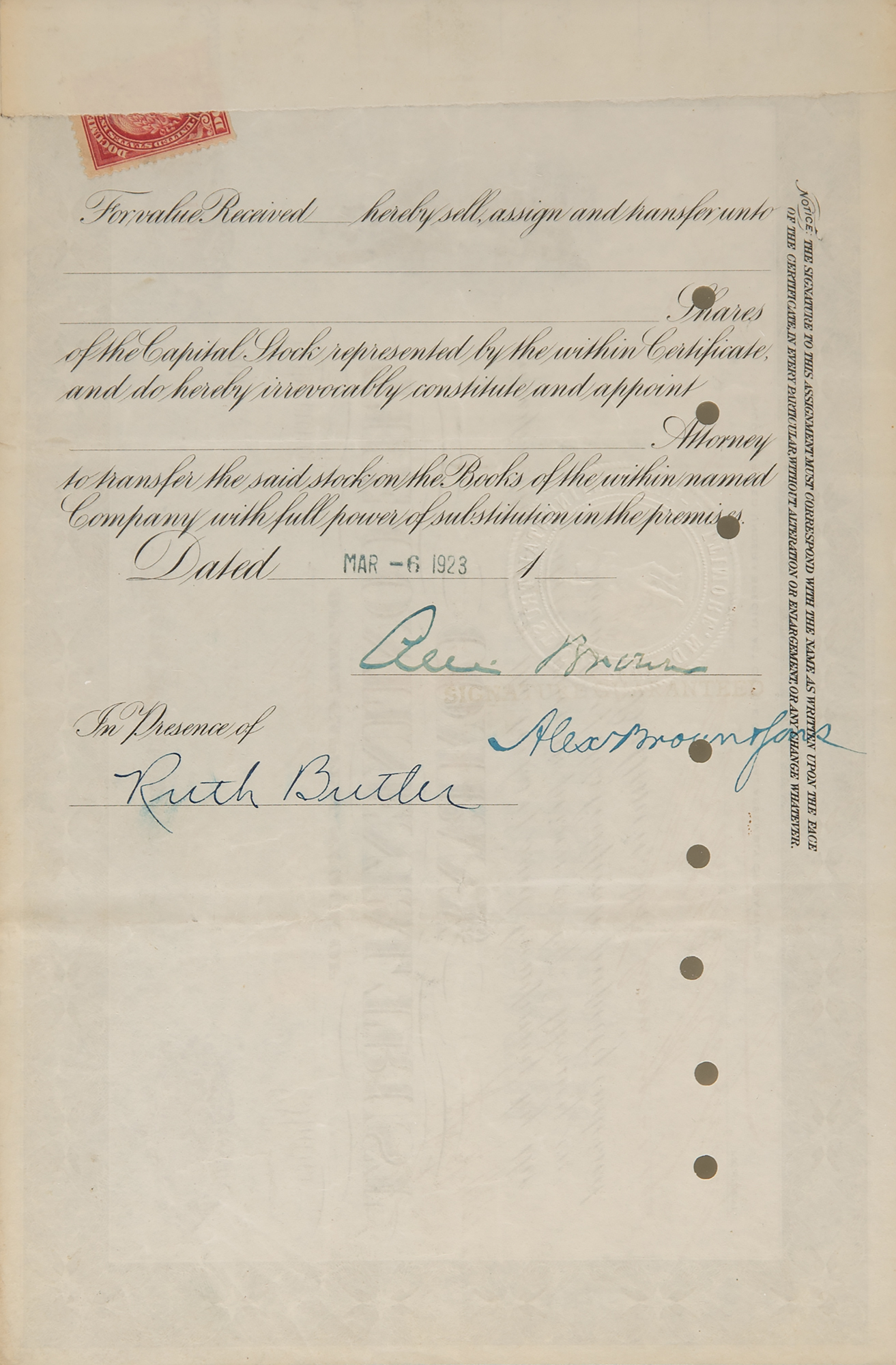 Namesake and great-grandson of the founder of Alex. Brown & Sons, the first investment bank in the United States, who took control of the firm at age 32 and became involved in railroad mergers of the 1890s (1858–1949). Partly-printed DS, signed “Alex. Brown,” one page, 10.5 x 7, January 21, 1901. Stock certificate for 100 shares in the Continental Trust Company issued to Alexander Brown, signed on the front in ink by the firm's president and secretary, and endorsed on the reverse by Brown to transfer the shares. Impressively cloth-matted and framed with a portrait and plaque to an overall size of 26.75 x 20.25, with a window in the backing for viewing the reverse. In fine condition.