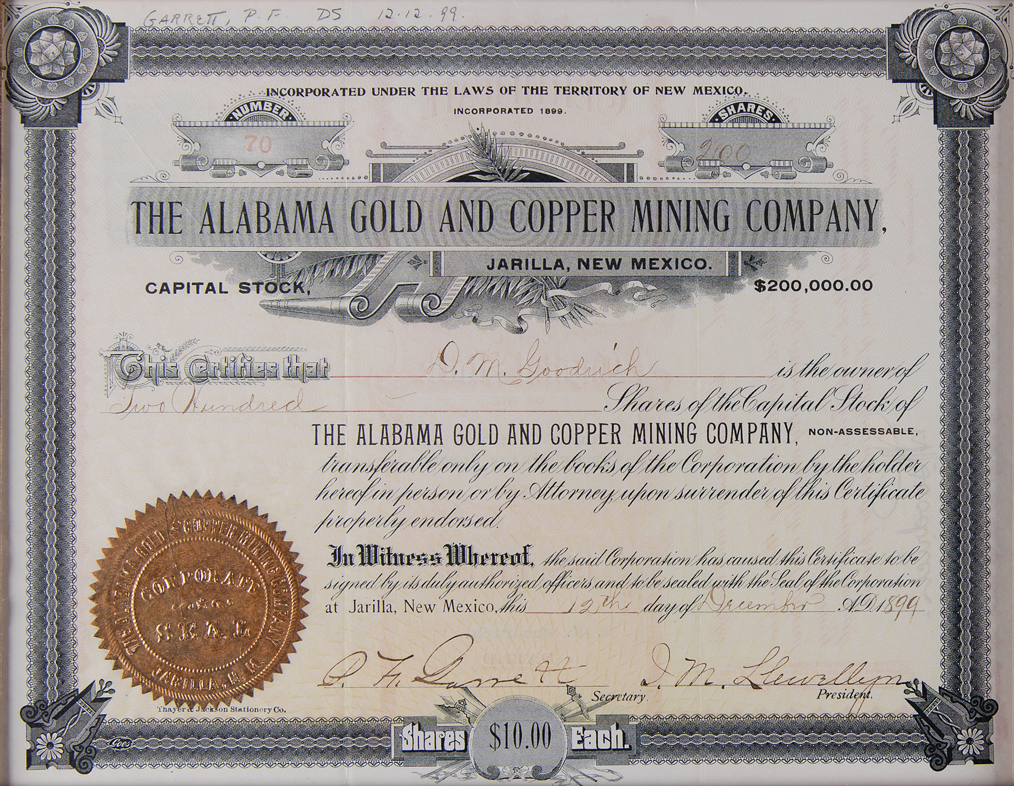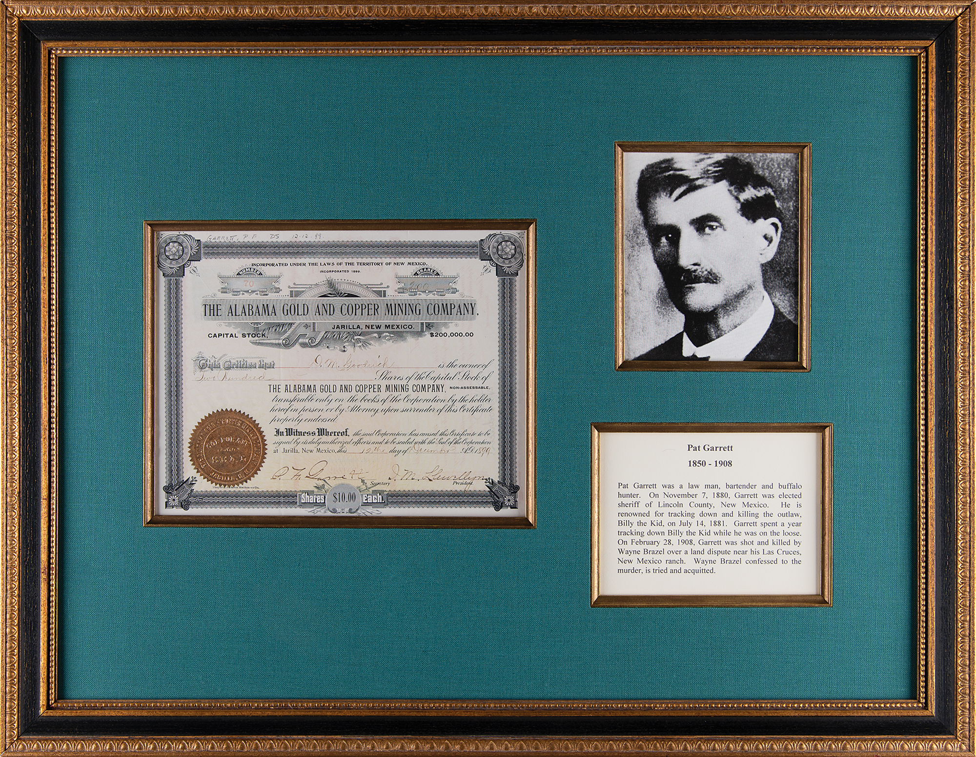 New Mexico lawman (1850–1908) who killed his former gambling partner, the fabled outlaw Billy the Kid, in 1881. Partly-printed DS, signed “P. F. Garrett,” one page, 10 x 7.75, December 12, 1899. Stock certificate for 100 shares of capital stock in the Alabama Gold and Copper Mining Company issued to D. M. Goodrich, signed at the conclusion by Garrett as the company's secretary. The gold foil seal affixed at the lower left corner remains intact. Nicely cloth-matted and framed with a portrait and biographical caption to an overall size of 25.5 x 20.5. In fine condition.