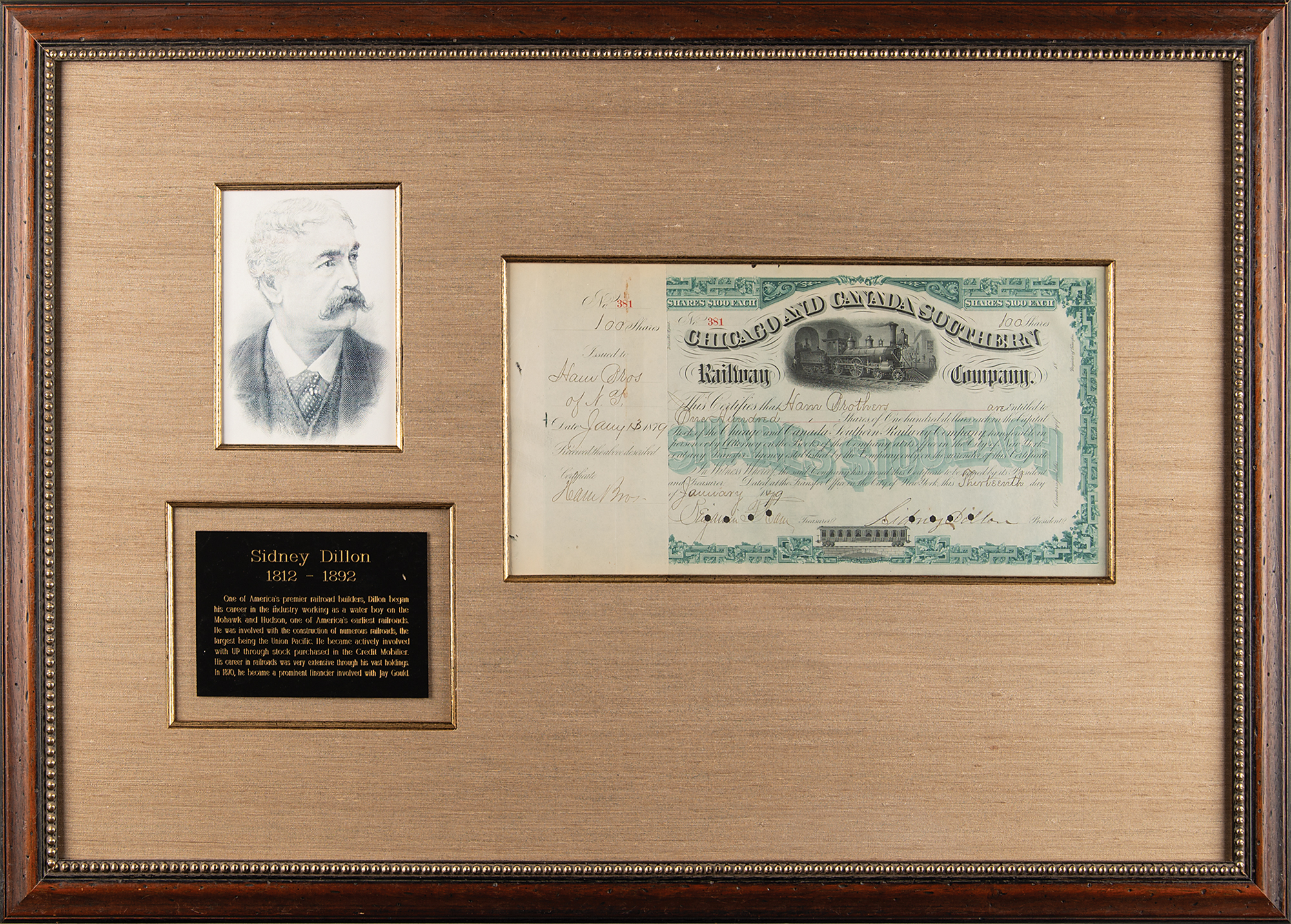 One of America's premier railroad builders (1812–1892) who was involved with the construction of the Union Pacific Railroad and First Transcontinental Railroad. Partly-printed DS, one page, 15.25 x 7.5, January 17, 1879. Stock certificate issued to Hann Brothers for 100 shares in the Chicago and Canada Southern Railway Company, signed at the conclusion in ink by Sidney Dillon as president. The original receipt remains affixed to the left side. Impressively cloth-matted and framed with a portrait and plaque to an overall size of 33.5 x 22.5. In fine condition.