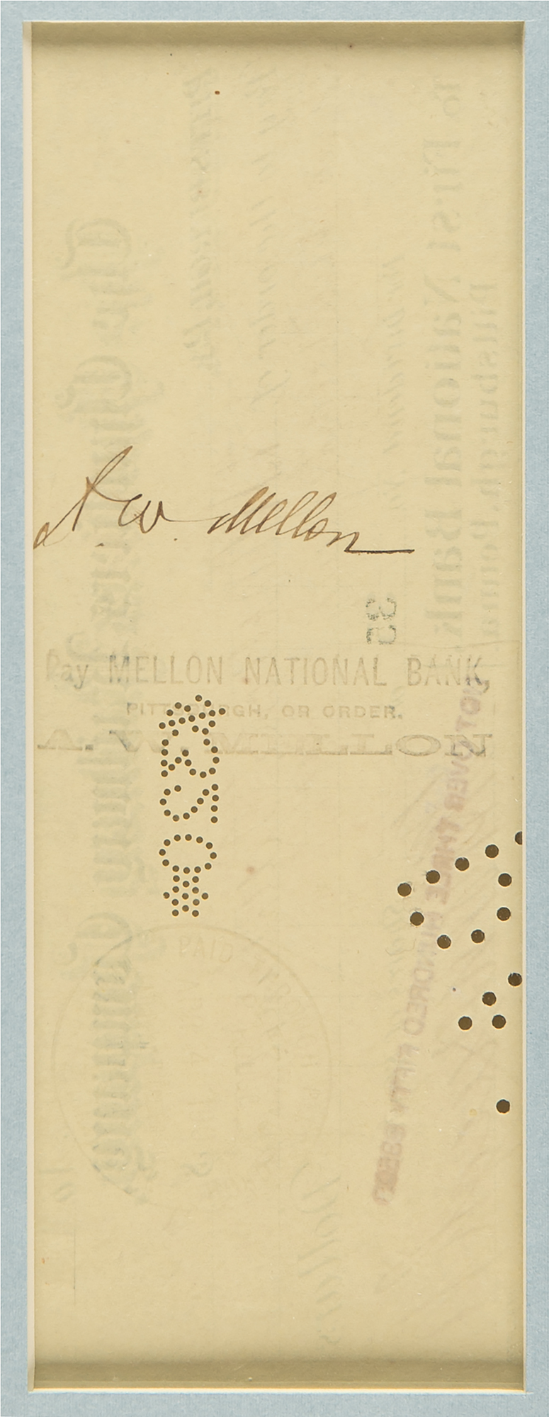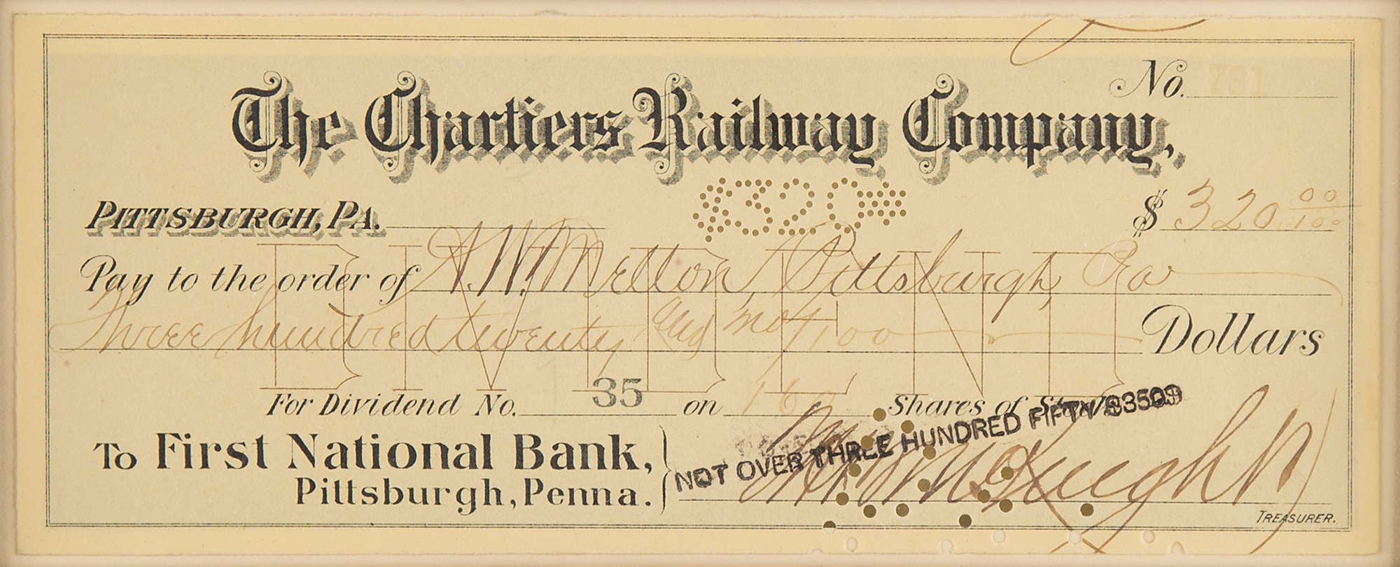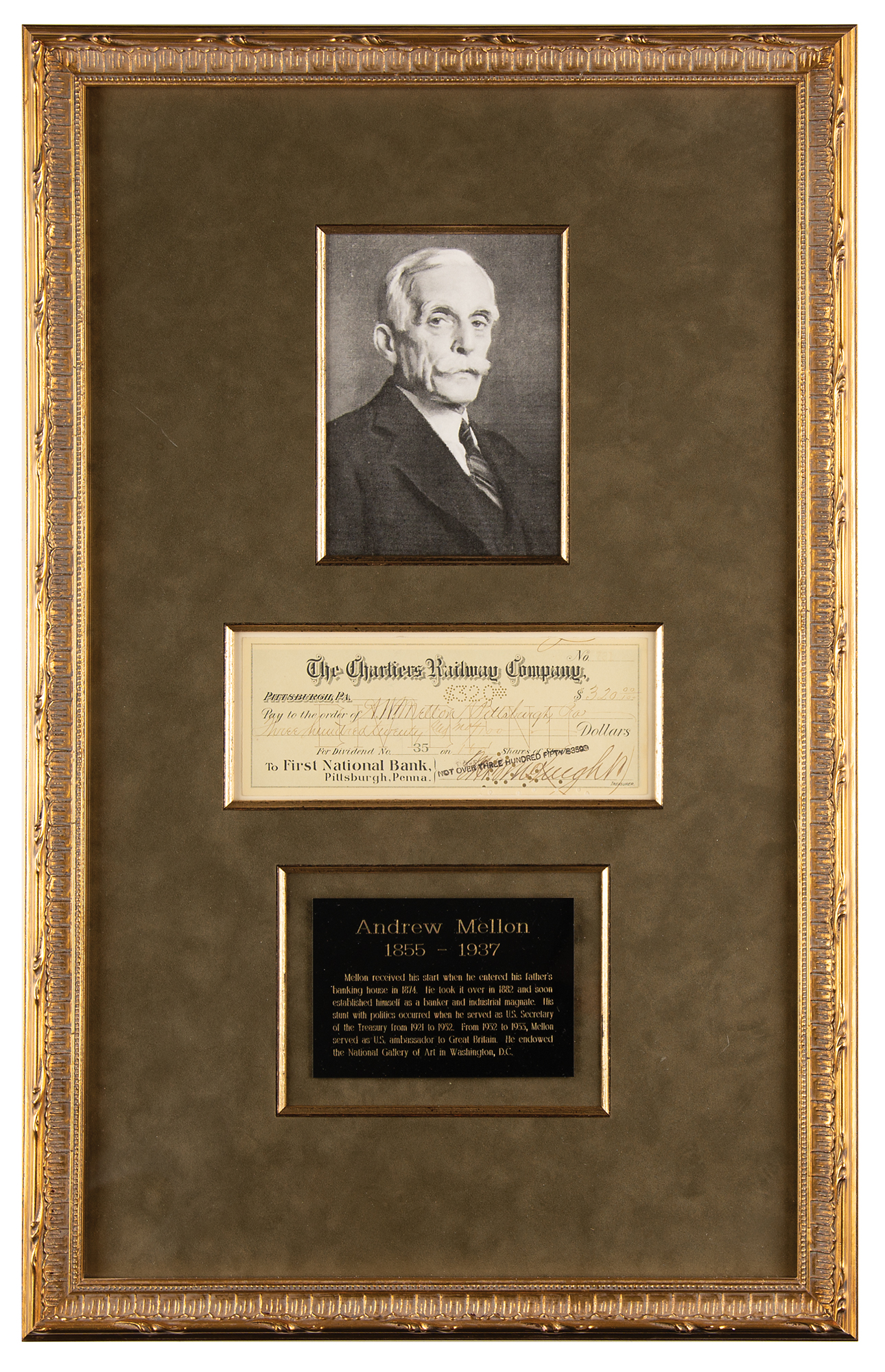 Chartiers Railway Company dividend check, 7.5 x 3, filled out in another hand and made payable to A. W. Mellon for $320, endorsed on the reverse in ink, "A. W. Mellon." Suede-matted and framed with a portrait and plaque to an overall size of 16 x 25.5, with a window in the backing for viewing the reverse. In fine condition.