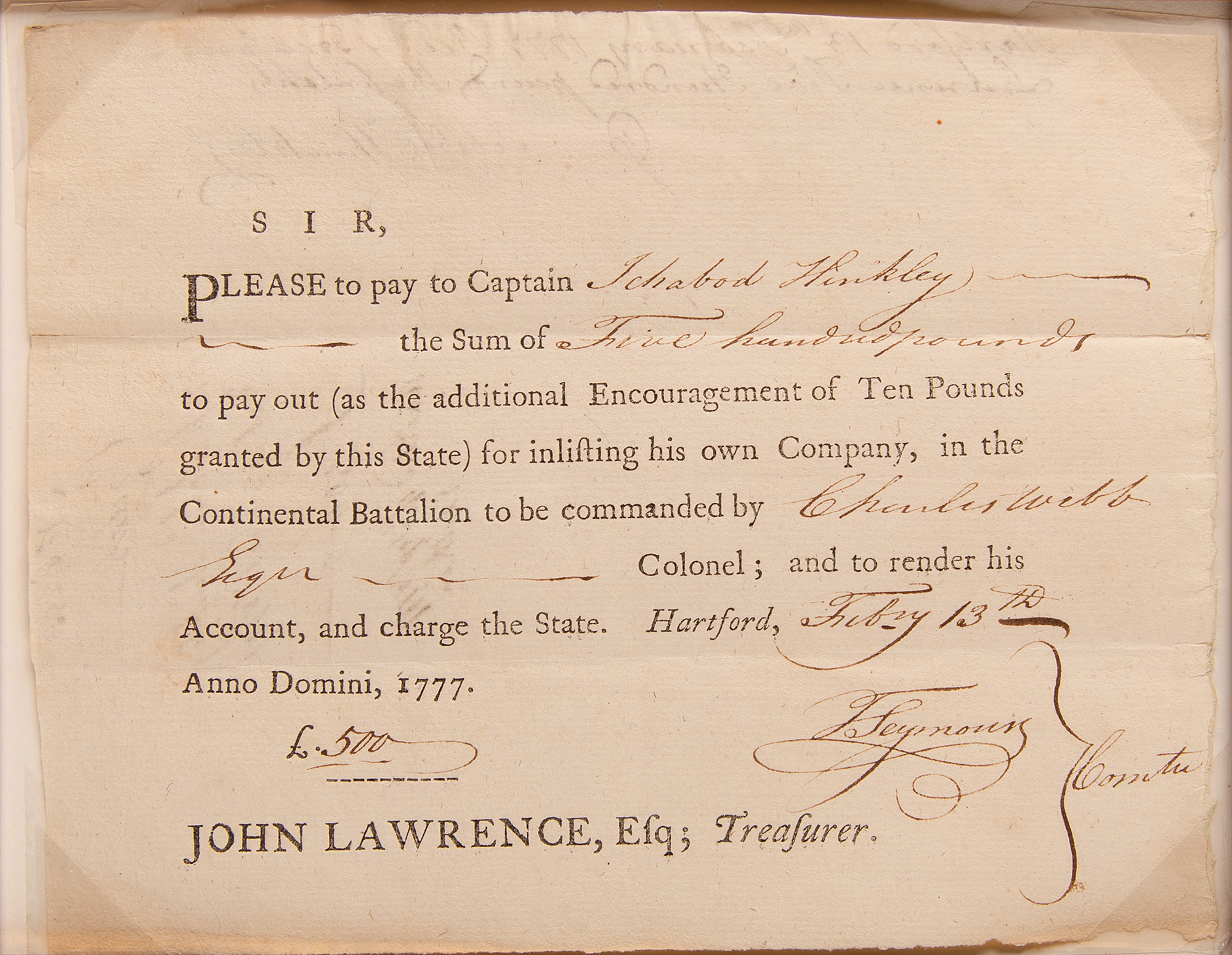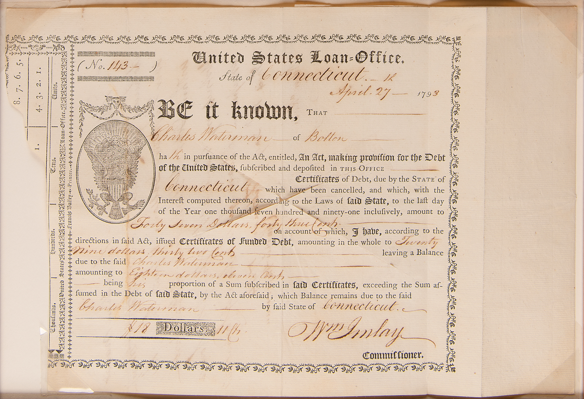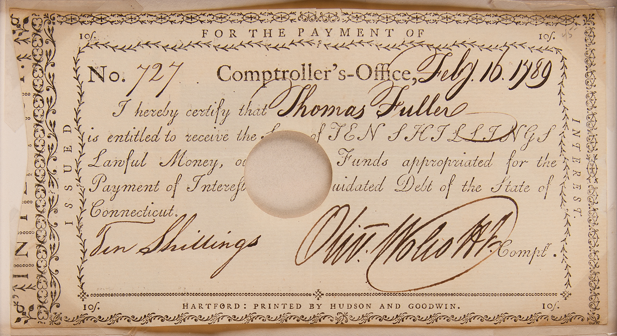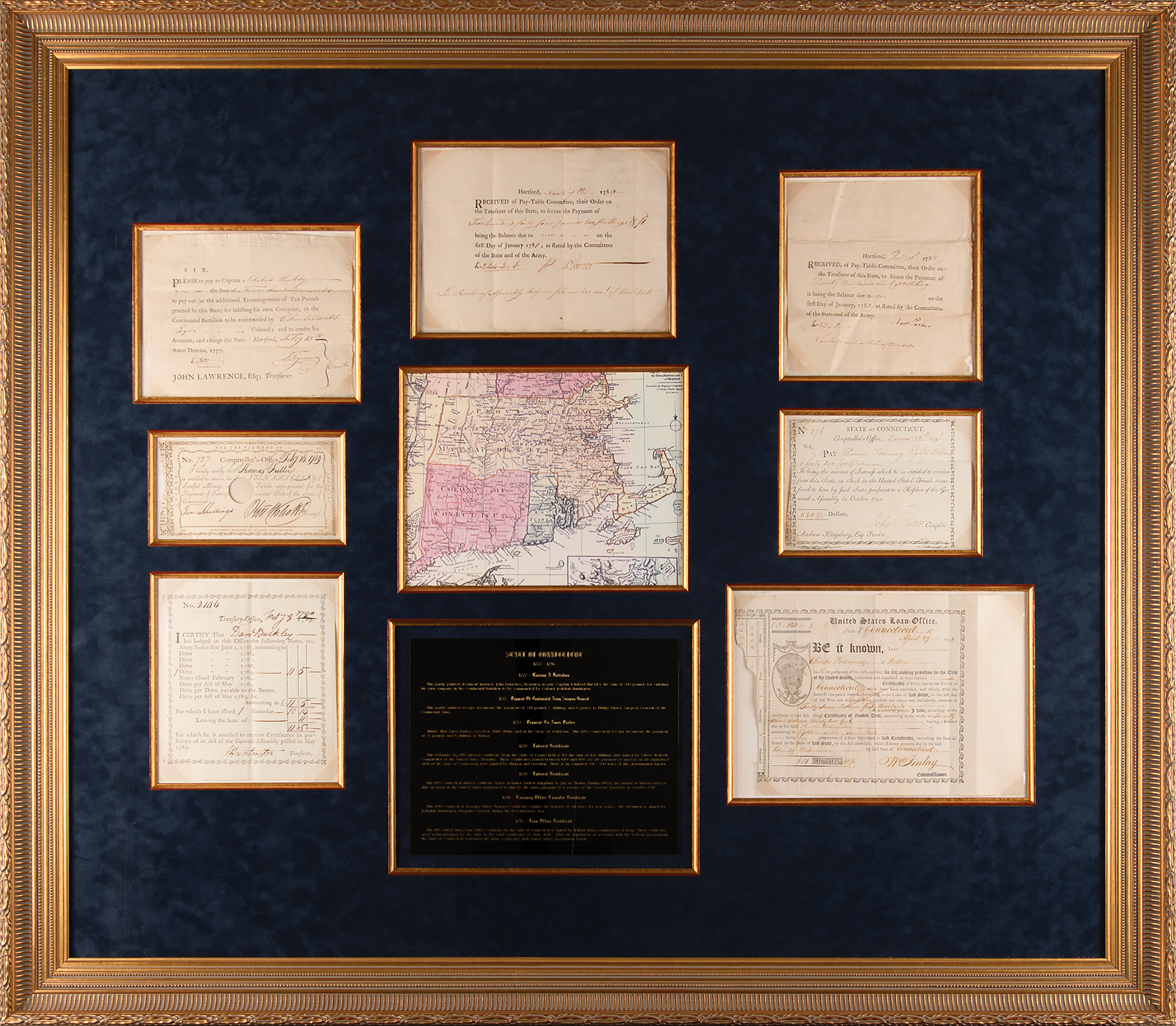 Impressively large display featuring seven Revolutionary War-era State of Connecticut financial documents, issued between 1777 and 1793, signed in ink by various state officials, including: a 1777 pay order for £500 to Captain Ichabod Hinckley for "inlisting his own company, in the Continental Battalion," signed in ink by Thomas Seymour; a 1783 receipt for £244.2.6 to Continental Army surgeon Dr. Philip Turner, endorsed in ink by Turner; a 1783 receipt for £23.8 to Yorktown veteran Amos Parker, endorsed in ink by Parker; a 1789 interest certificate for ten shillings, signed in ink by Oliver Wolcott, Jr.; a 1790 Treasury Office transfer certificate, signed in ink by Jedediah Huntington; a 1793 United States Loan-Office certificate signed in ink by William Imlay; and a 1796 interest certificate signed in ink by John Porter. Impressively cloth-matted and framed together with a descriptive plaque and map to an overall size of 43.5 x 38. In overall fine condition.