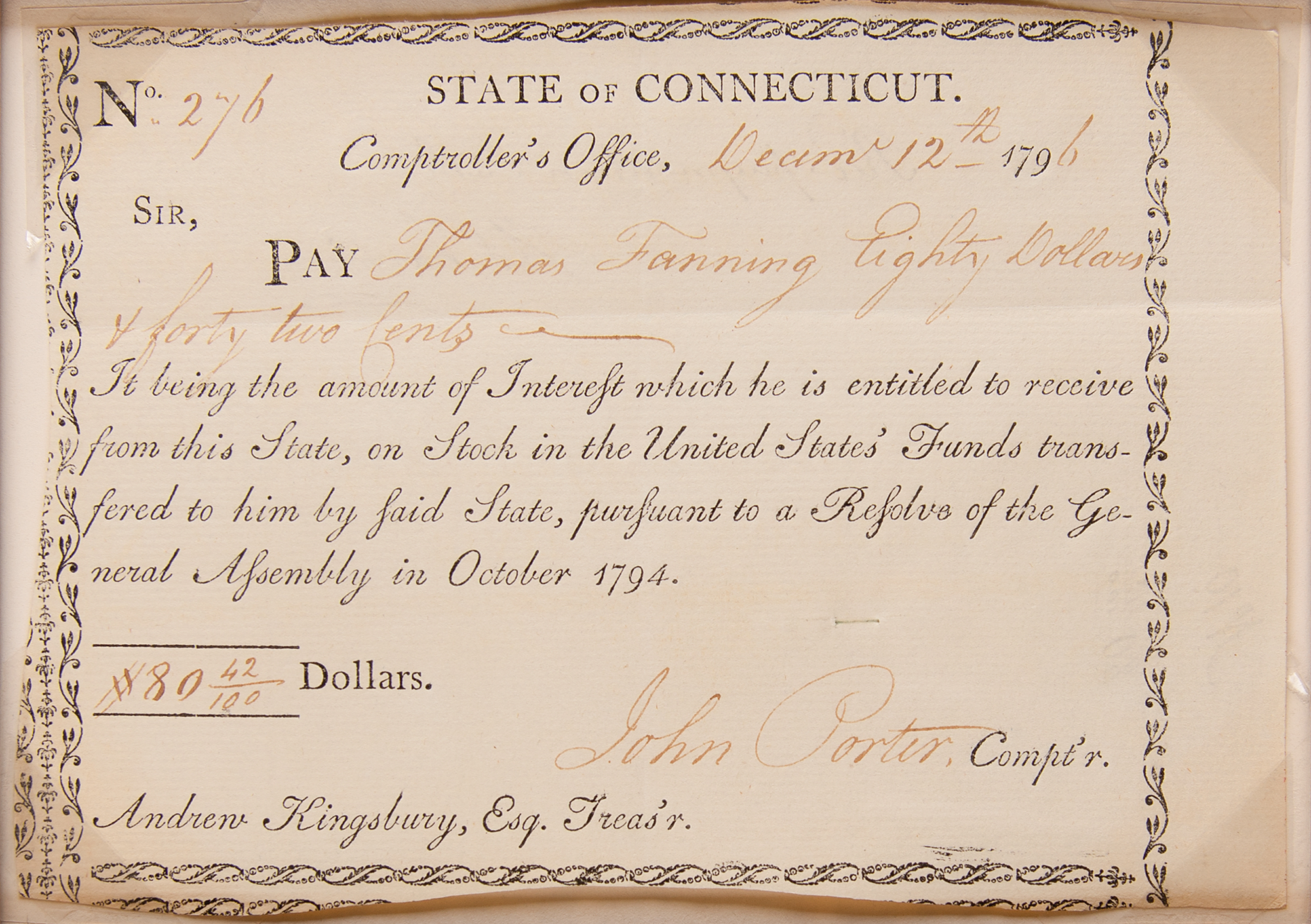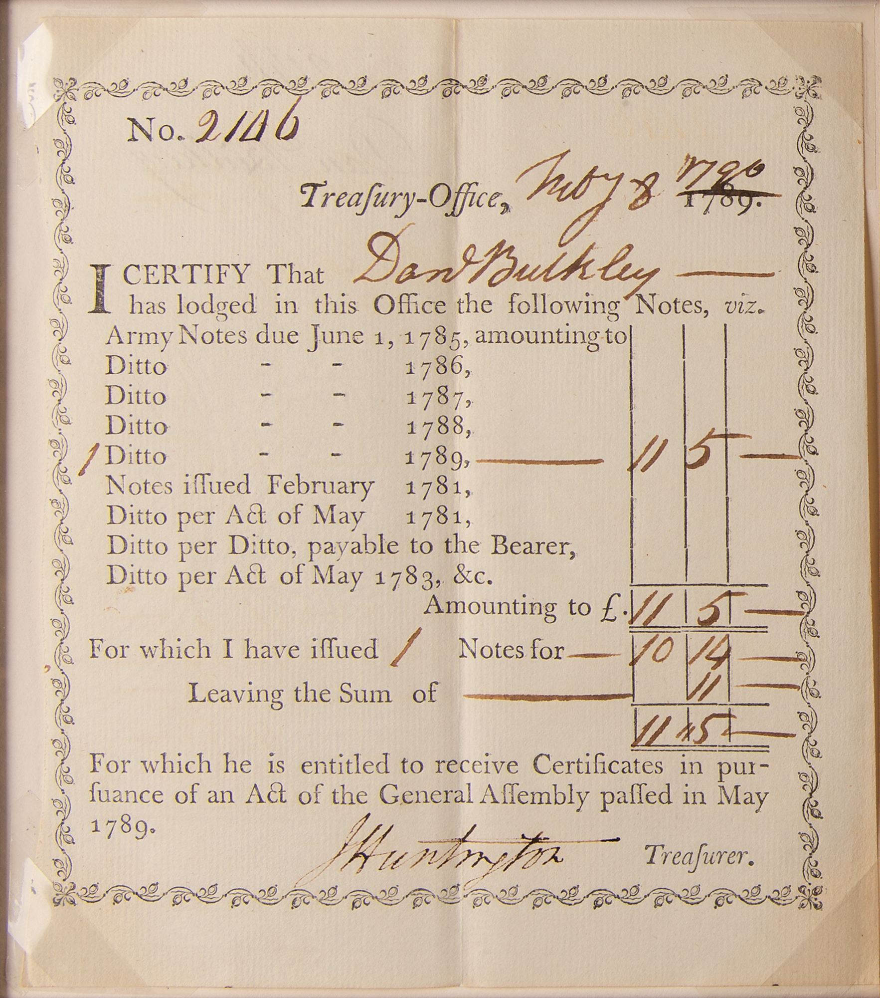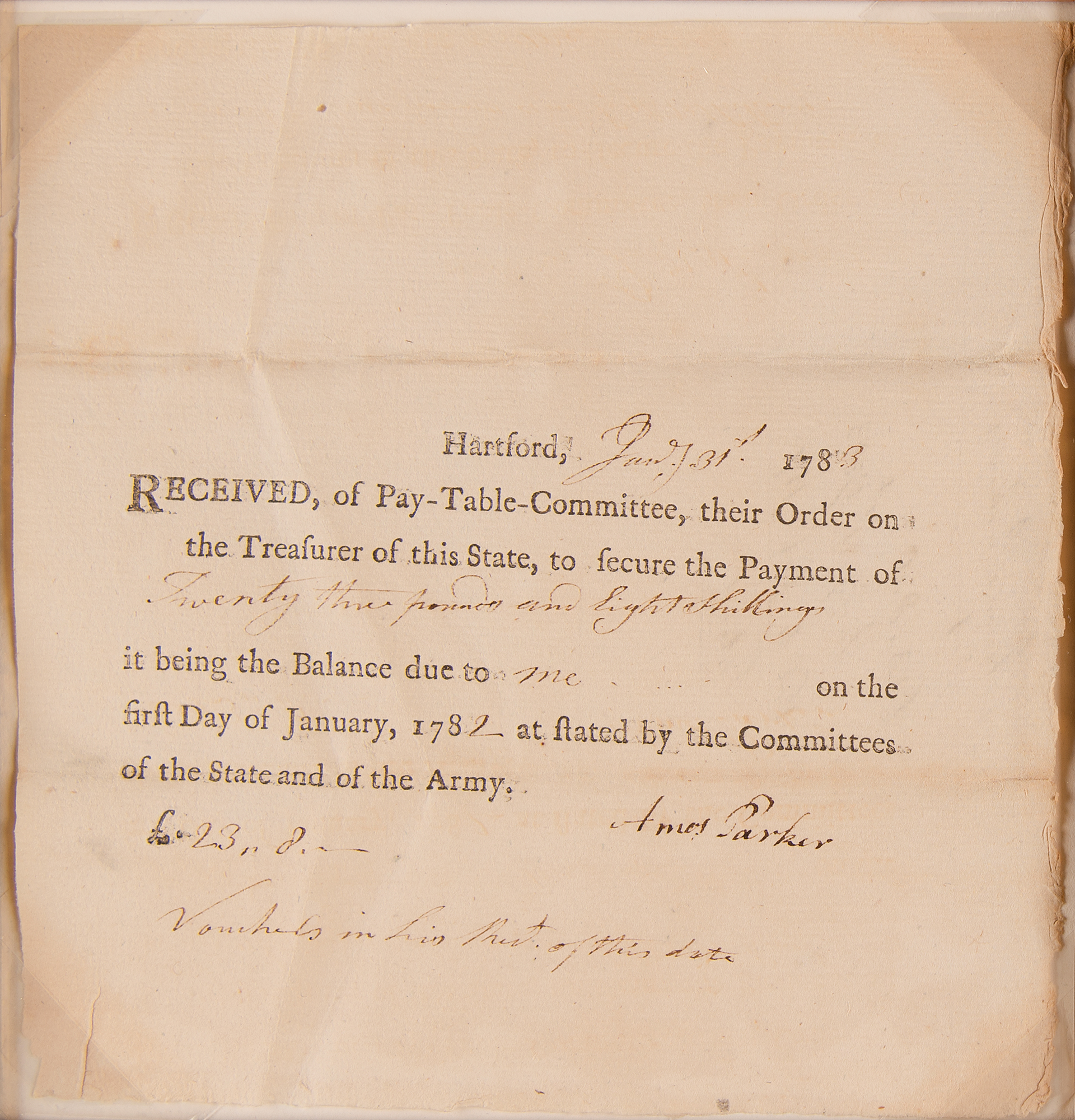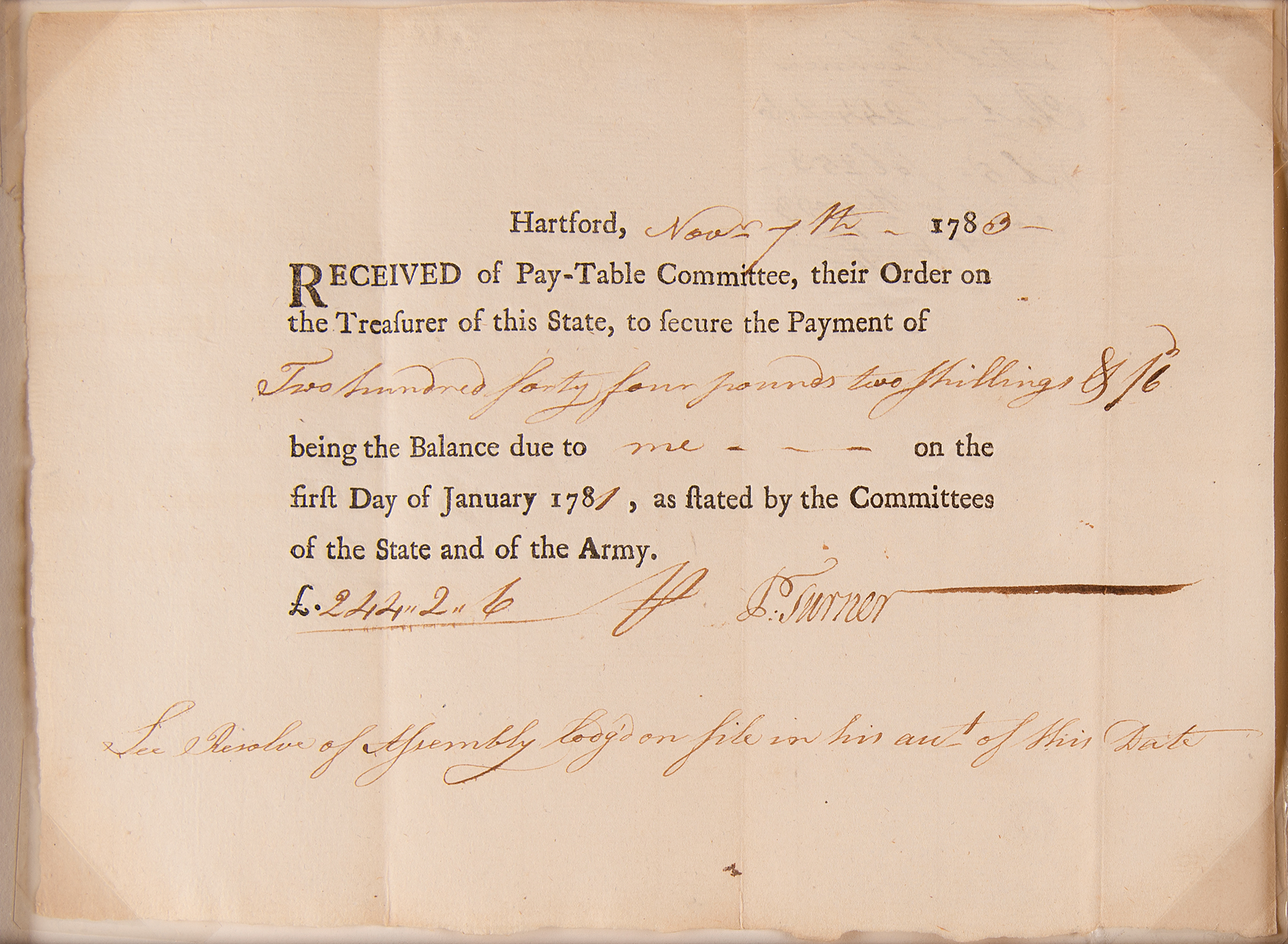 Impressively large display featuring seven Revolutionary War-era State of Connecticut financial documents, issued between 1777 and 1793, signed in ink by various state officials, including: a 1777 pay order for £500 to Captain Ichabod Hinckley for "inlisting his own company, in the Continental Battalion," signed in ink by Thomas Seymour; a 1783 receipt for £244.2.6 to Continental Army surgeon Dr. Philip Turner, endorsed in ink by Turner; a 1783 receipt for £23.8 to Yorktown veteran Amos Parker, endorsed in ink by Parker; a 1789 interest certificate for ten shillings, signed in ink by Oliver Wolcott, Jr.; a 1790 Treasury Office transfer certificate, signed in ink by Jedediah Huntington; a 1793 United States Loan-Office certificate signed in ink by William Imlay; and a 1796 interest certificate signed in ink by John Porter. Impressively cloth-matted and framed together with a descriptive plaque and map to an overall size of 43.5 x 38. In overall fine condition.