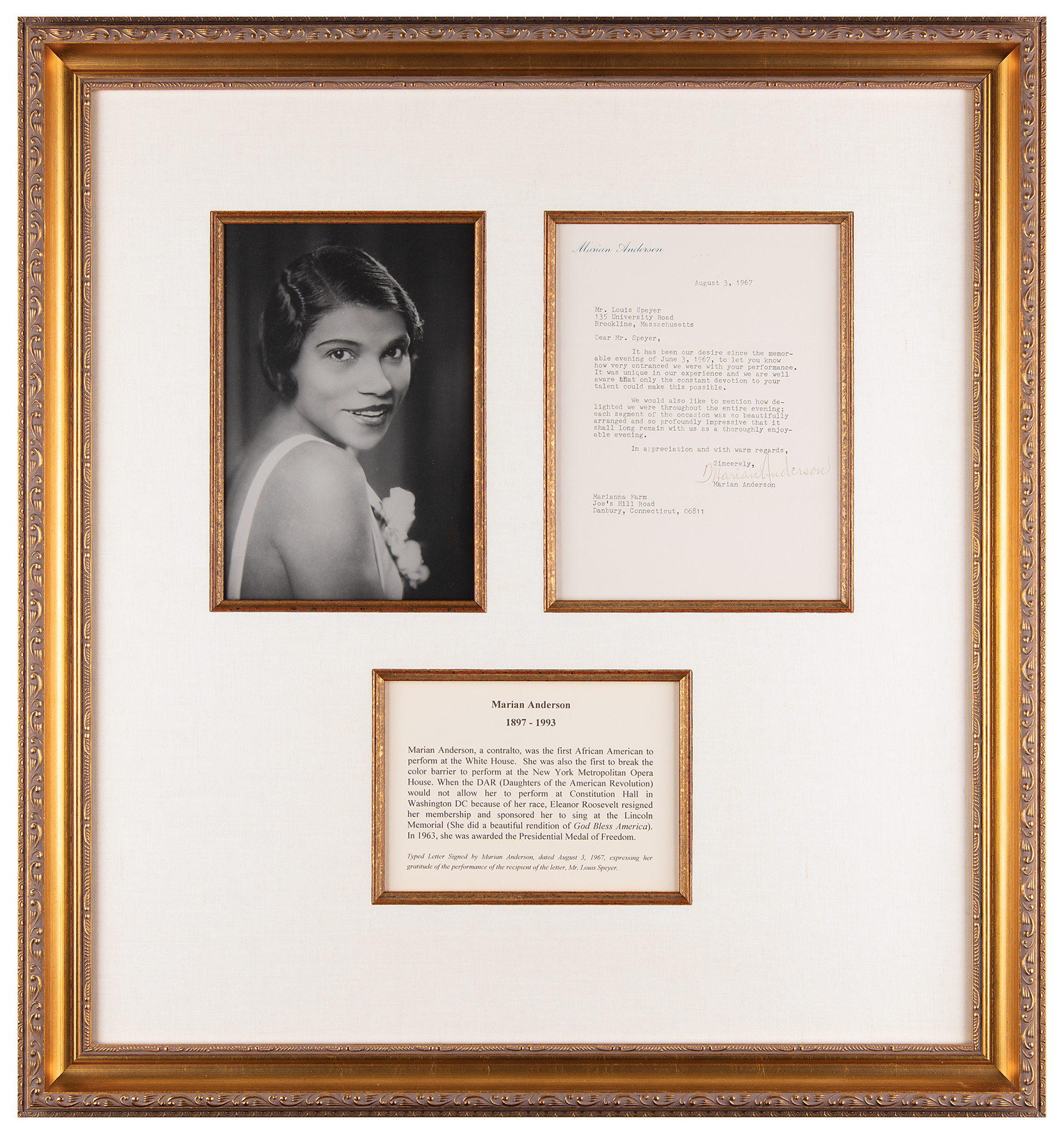 TLS, one page, 6.75 x 9.25, personal letterhead, August 3, 1967. Letter to oboist Louis Speyer, in part: "It has been our desire since the memorable evening of June 3, 1967, to let you know how very entranced we were with your performance. It was unique in our experience and we are well aware that only the constant devotion to your talent could make this possible. We would also like to mention how delighted we were throughout the entire evening; each segment of the occasion was so beautifully arranged and so profoundly impressive that it shall long remain with us as a thoroughly enjoyable evening." Beautifully cloth-matted and framed with a portrait and biographical caption to an overall size of 24.5 x 26.5. In fine condition.