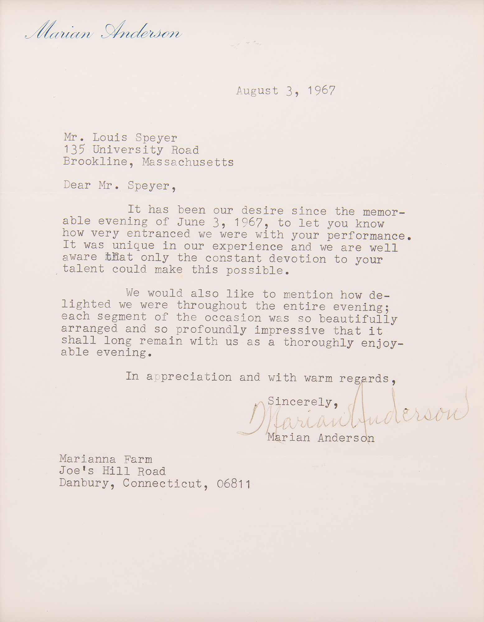 TLS, one page, 6.75 x 9.25, personal letterhead, August 3, 1967. Letter to oboist Louis Speyer, in part: "It has been our desire since the memorable evening of June 3, 1967, to let you know how very entranced we were with your performance. It was unique in our experience and we are well aware that only the constant devotion to your talent could make this possible. We would also like to mention how delighted we were throughout the entire evening; each segment of the occasion was so beautifully arranged and so profoundly impressive that it shall long remain with us as a thoroughly enjoyable evening." Beautifully cloth-matted and framed with a portrait and biographical caption to an overall size of 24.5 x 26.5. In fine condition.