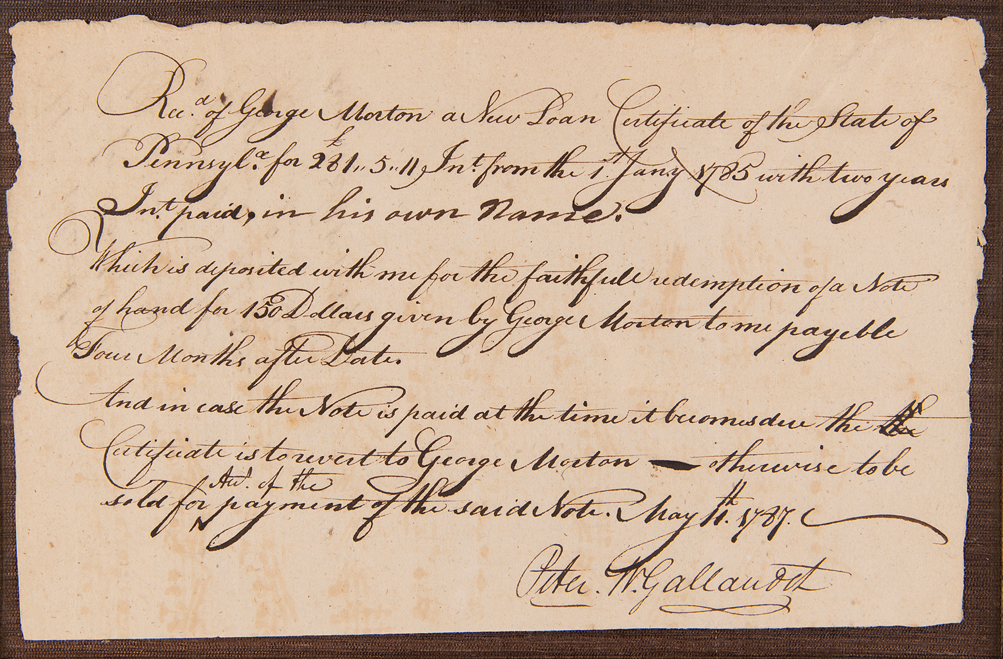 Soldier and merchant (1756–1843) who took part in the Battle of Trenton, served as personal secretary to President George Washington in Philadelphia, and was the father of Thomas Hopkins Gallaudet, the co-founder of the famous school for the deaf. Manuscript DS, one page, 8.5 x 5.25, May 11, 1787. Receipt for a "Loan Certificate of the State of Pennsyl'a for 281.5.11…which is deposited with me for the faithful redemption of a Note of hand for 150 Dollars given by George Morton to me payable Four Months after Date." Signed at the conclusion in ink by Peter W. Gallaudet. Nicely mounted, cloth-matted, and framed with a portrait and plaque to an overall size of 25.75 x 21.5. In fine condition.