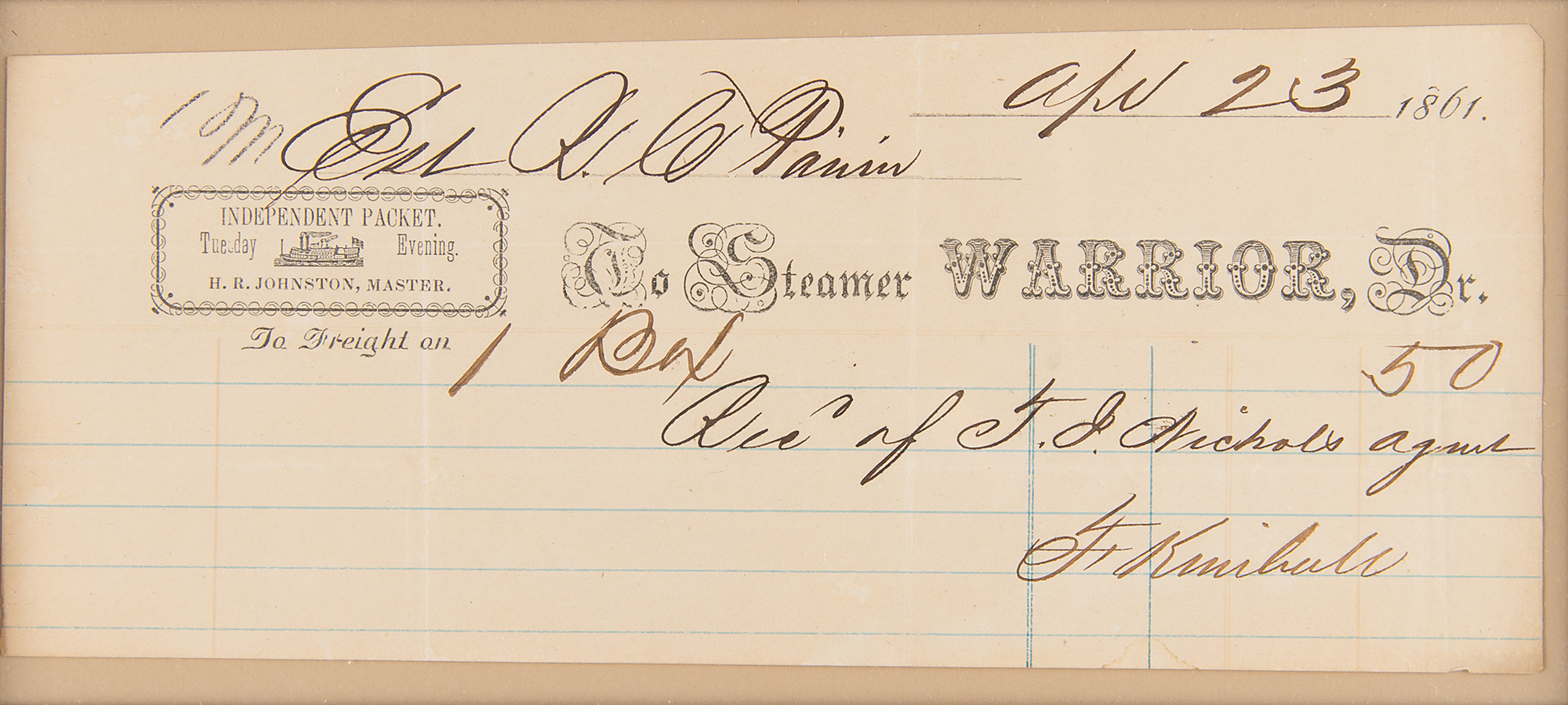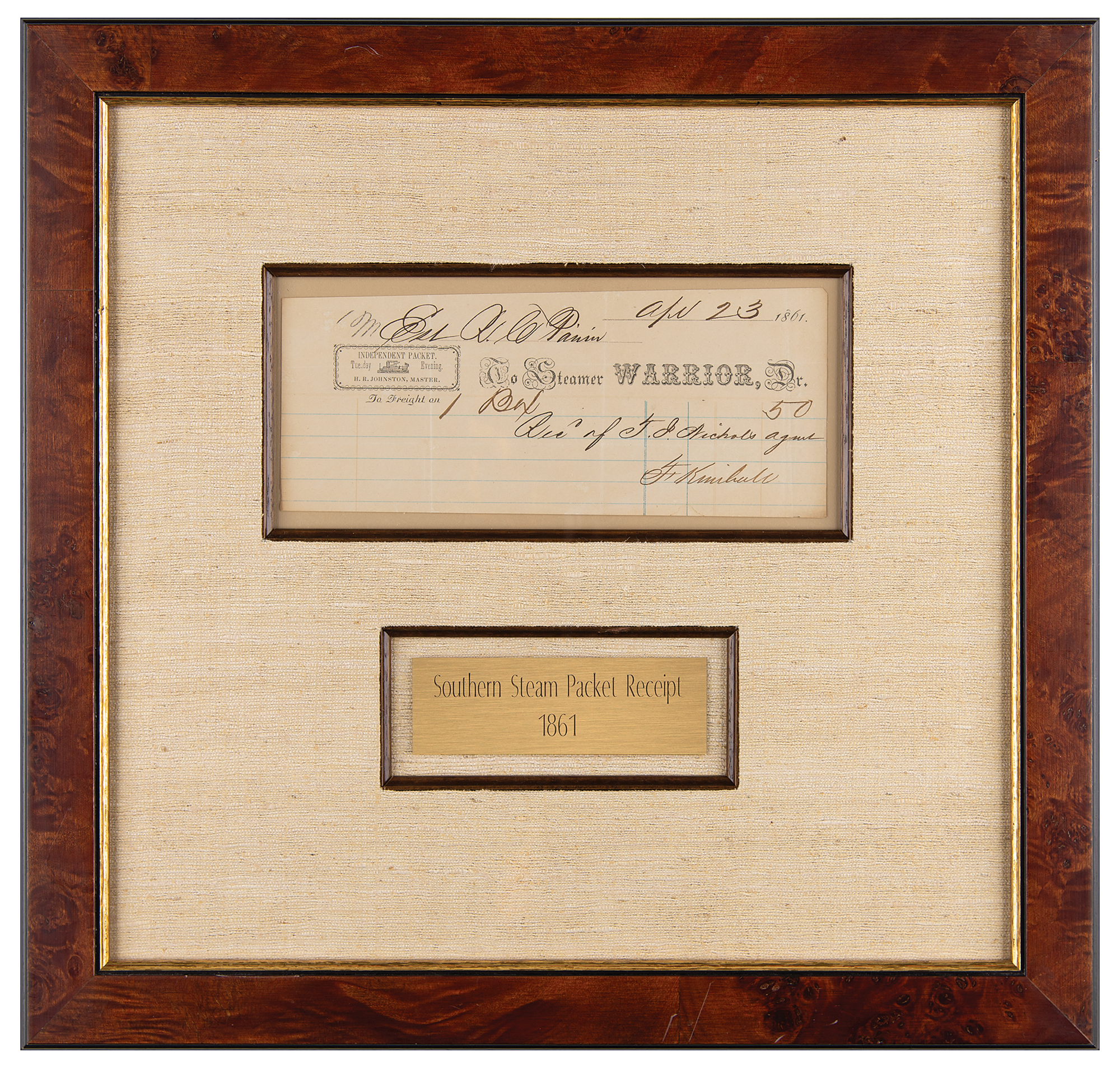 Civil War-era partly-printed document, one page, 8.25 x 3.25, April 23, 1861. Receipt for a freight shipment aboard the "Steamer Warrior," nicely mounted, cloth-matted, and framed with a plaque to an overall size of 16.5 x 16. In fine condition.