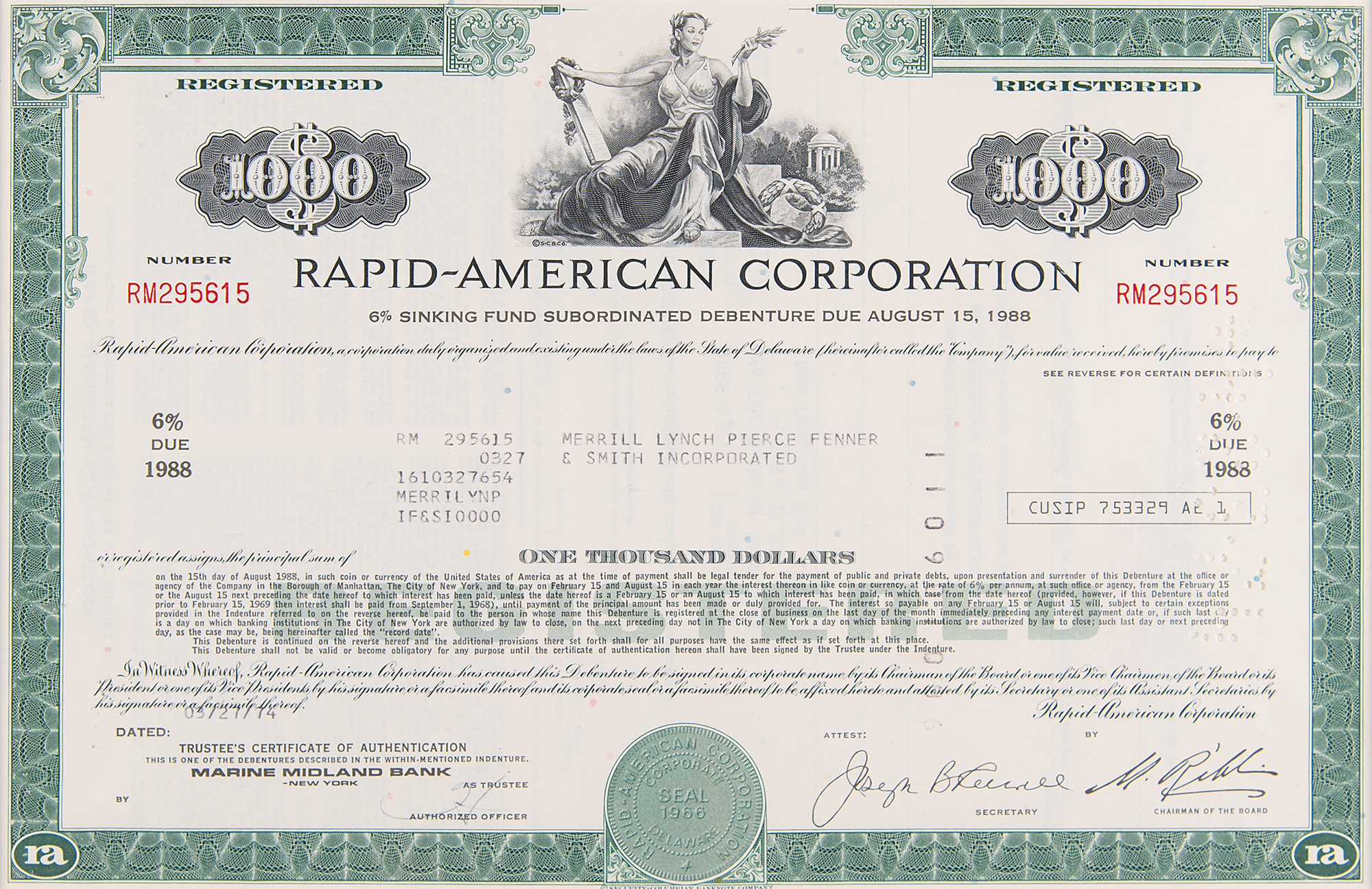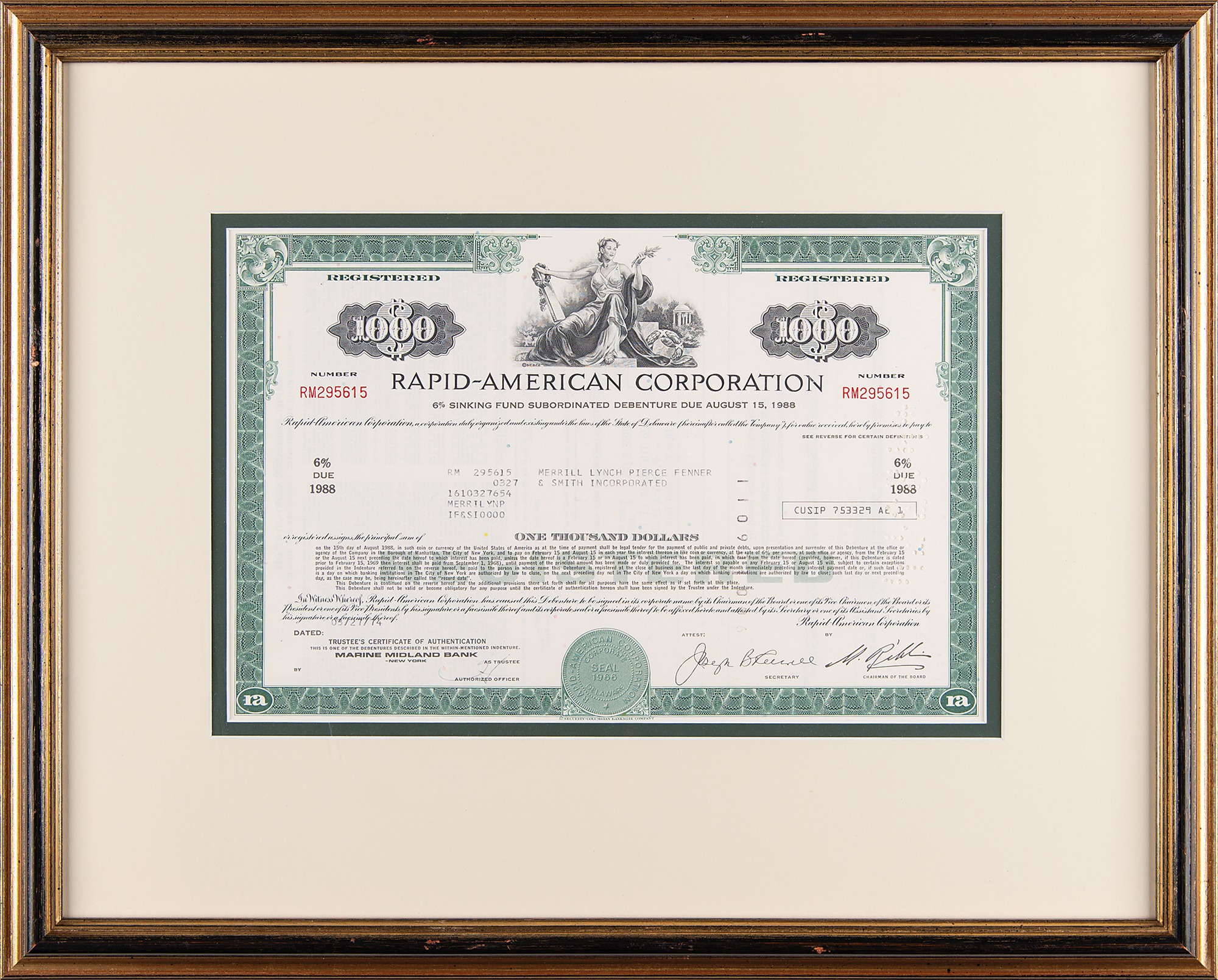 Bond certificate for $1000 in a 6% sinking fund subordinated debenture issued by the Rapid-American Corporation, one page, 11.5 x 7.5, March 27, 1974, featuring facsimile signatures of the company's chairman and secretary. Handsomely double-matted and framed to an overall size of 19 x 15.25. In fine condition.