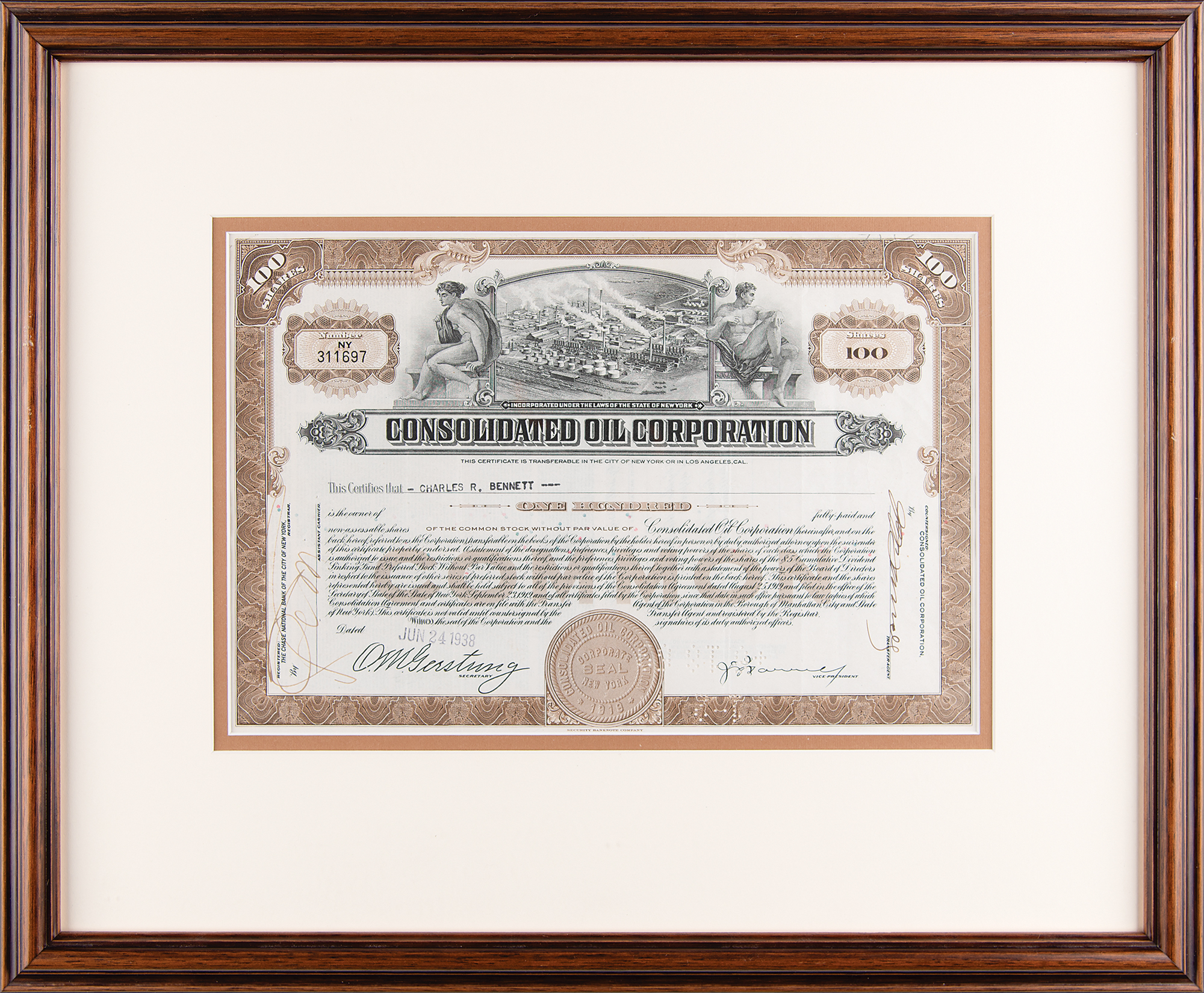 Stock certificate for 100 shares in the Consolidated Oil Corporation, one page, 11.5 x 7.5, June 24, 1935, featuring facsimile signatures of the company's vice-president and secretary. Handsomely double-matted and framed to an overall size of 19 x 15.5. In fine condition.