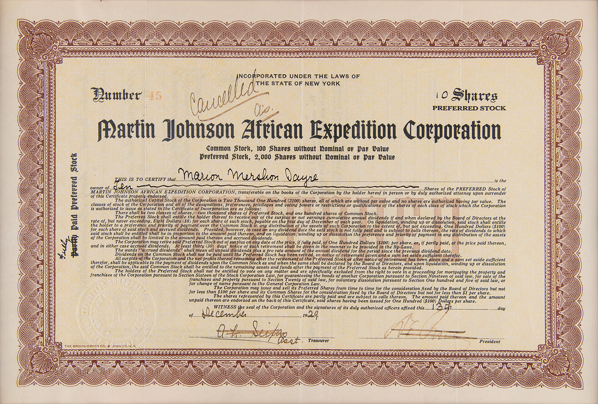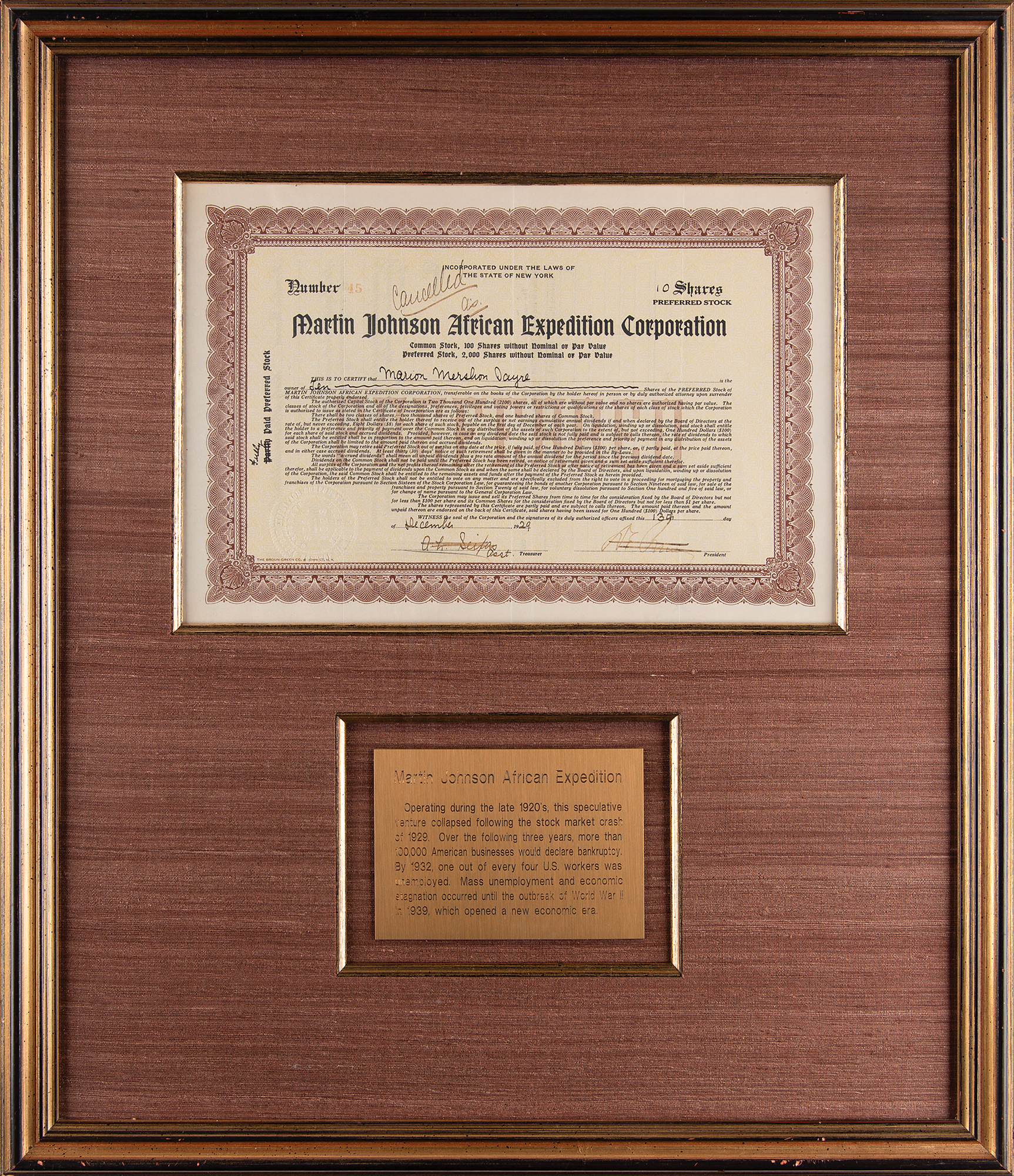 Stock certificate for 10 shares in the Martin Johnson African Expedition Corporation, one page, 12 x 8, December 13, 1929, signed in ink by the company's president and assistant treasurer. Nicely cloth-matted and framed with a plaque to an overall size of 19 x 21.75. In fine condition.