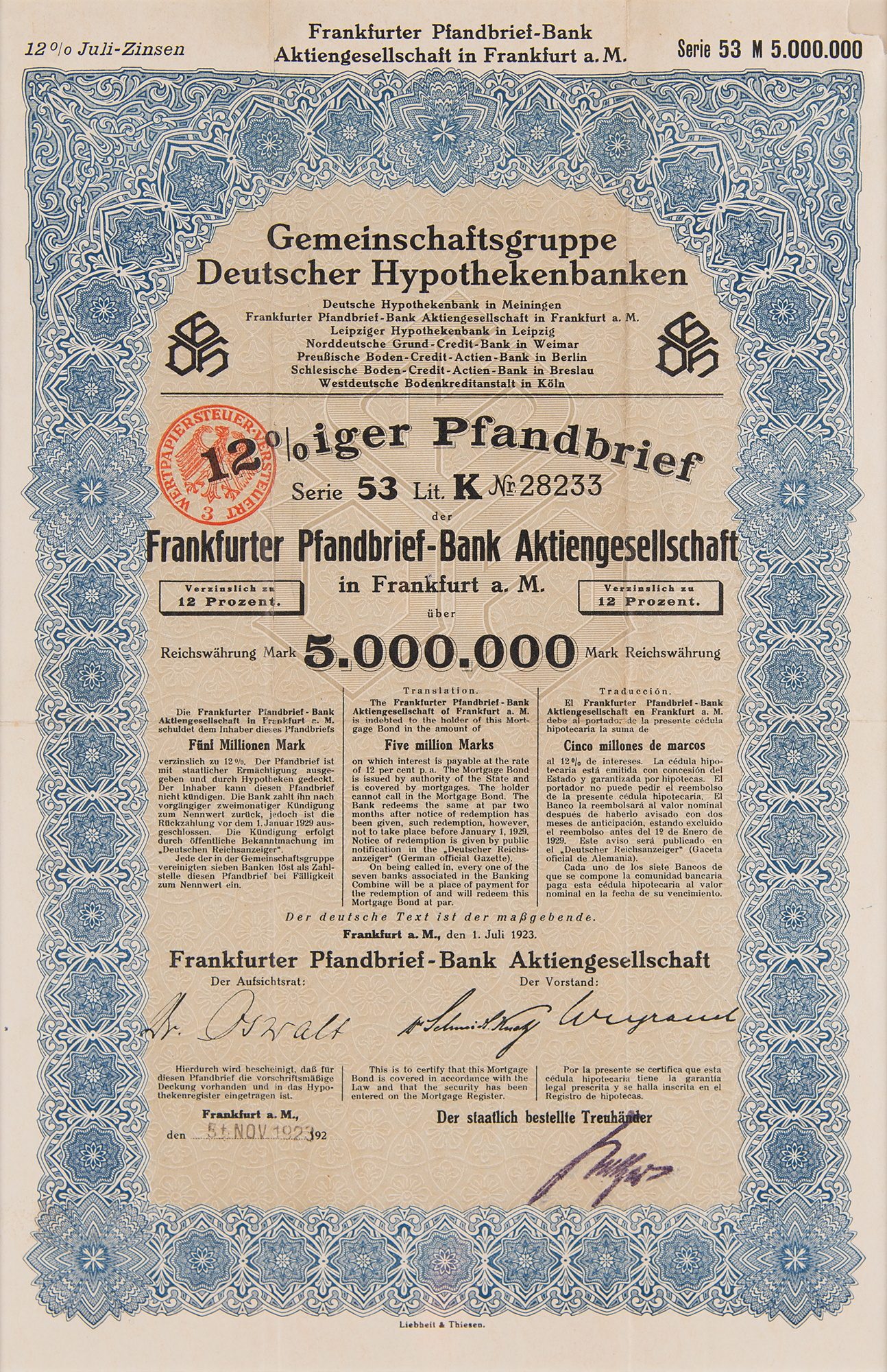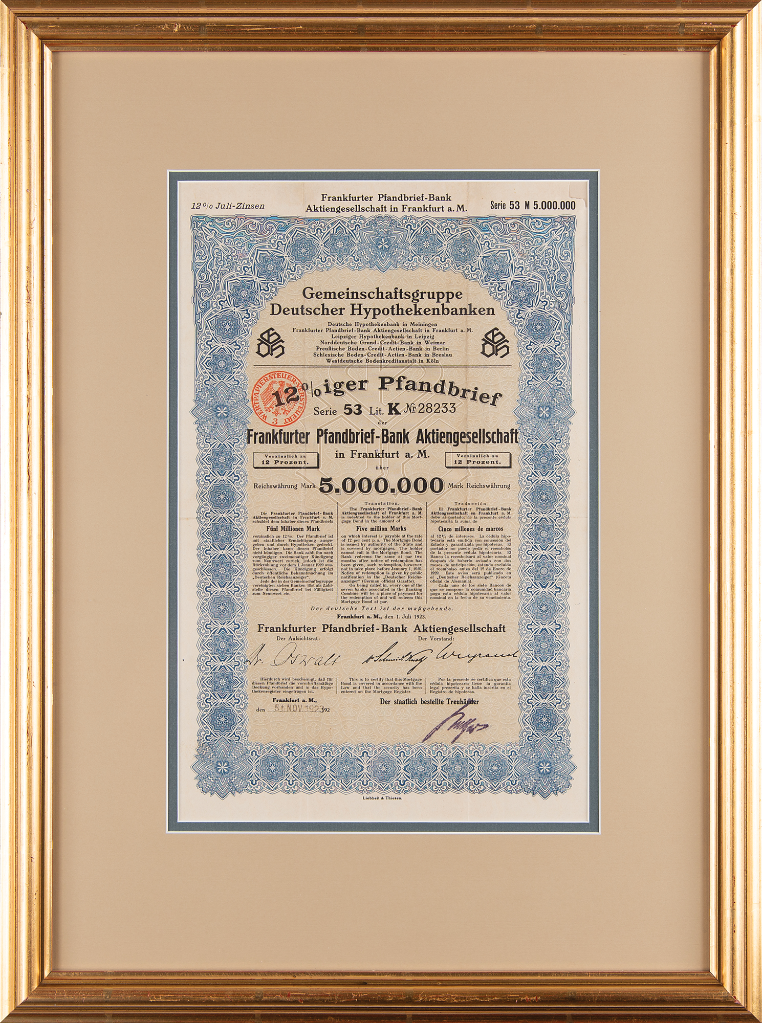 German bond of the Gemeinschaftsgruppe Deutscher Hypothekenbanken [Community Group of German Mortgage Banks], one page, 9 x 14, July 1, 1923, with stamped and facsimile signatures below. Double-matted and framed to an overall size of 17 x 22.5. In fine condition.