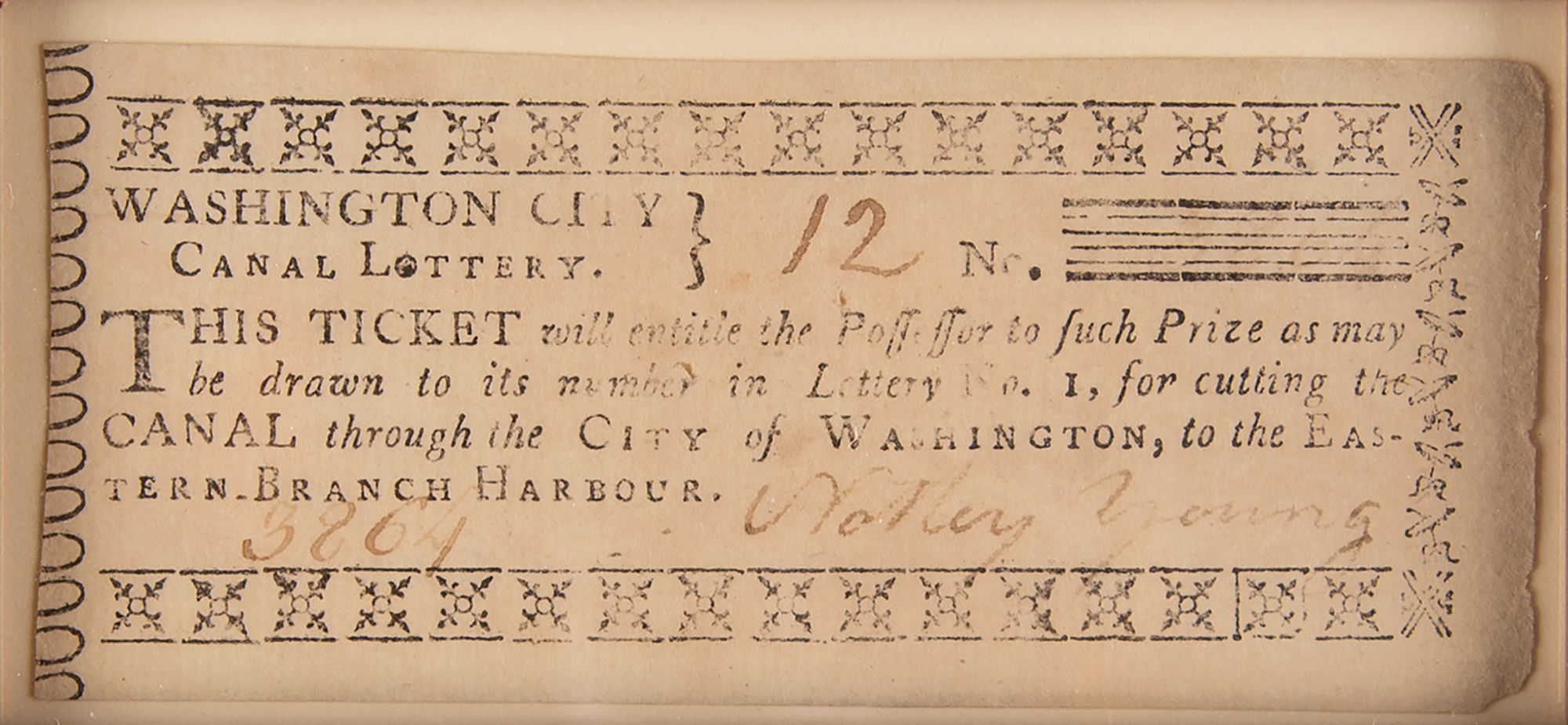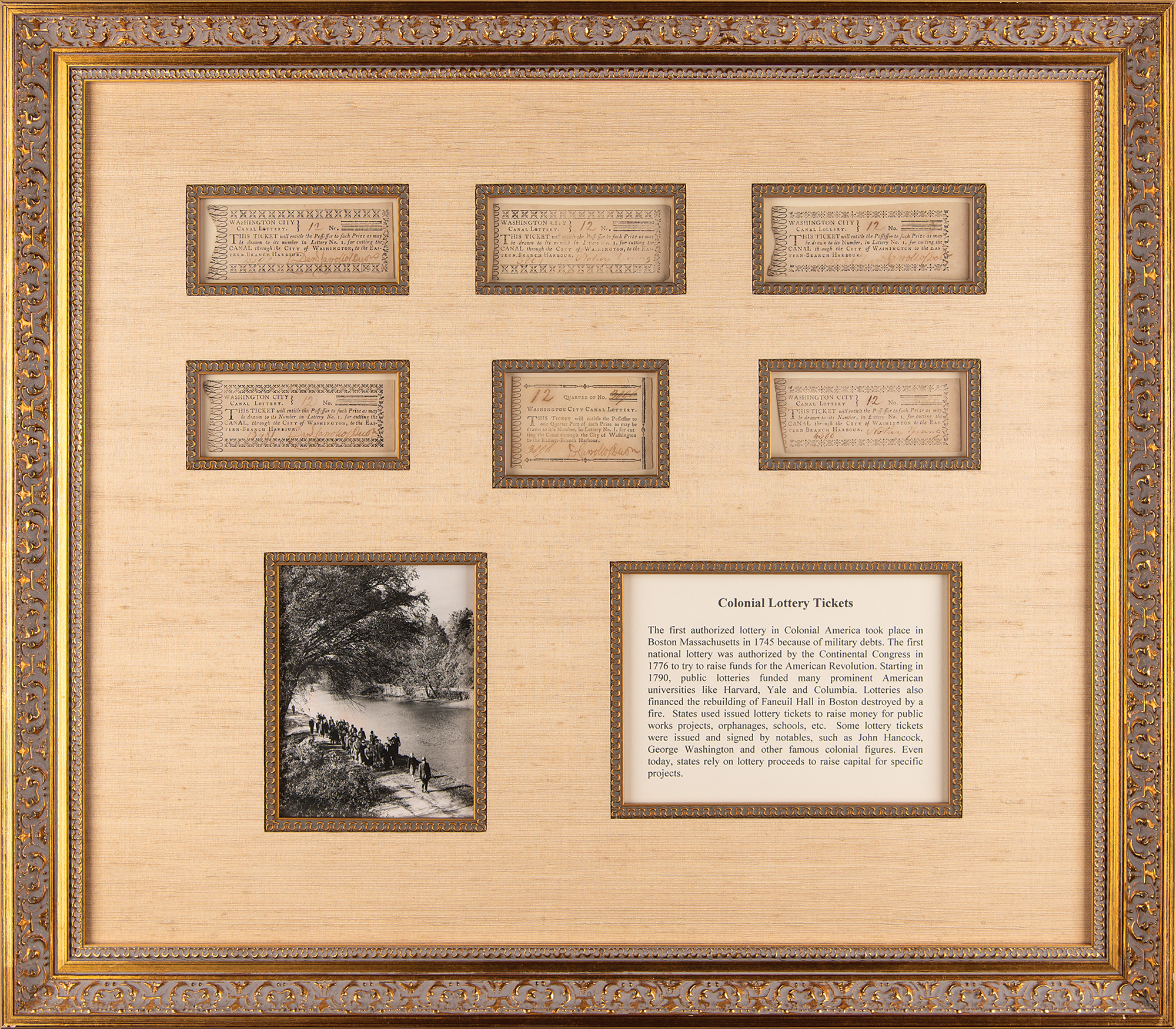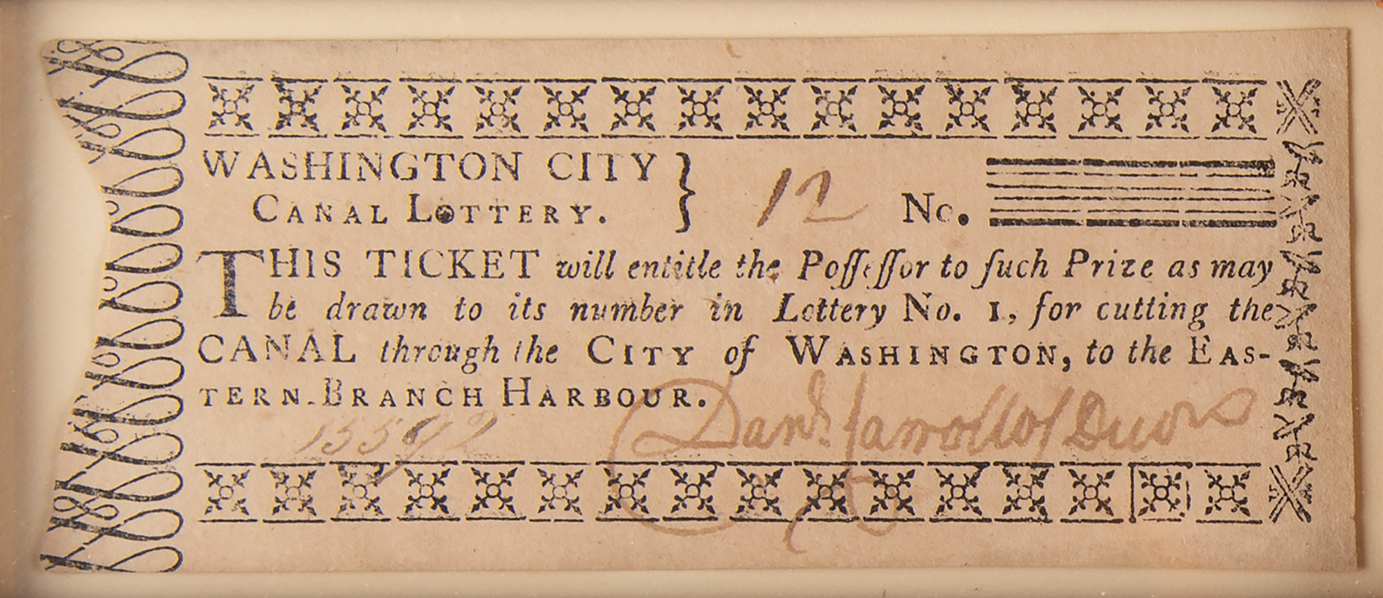 Display featuring six "Washington City Canal Lottery" tickets, ranging in size from 2.75 x 2 to 4 x 1.5, with two signed by Nottey Young and four signed by Daniel Carroll of Duddington. Impressively cloth-matted and framed with an image and descriptive caption to an overall size of 24.5 x 22. In fine condition.