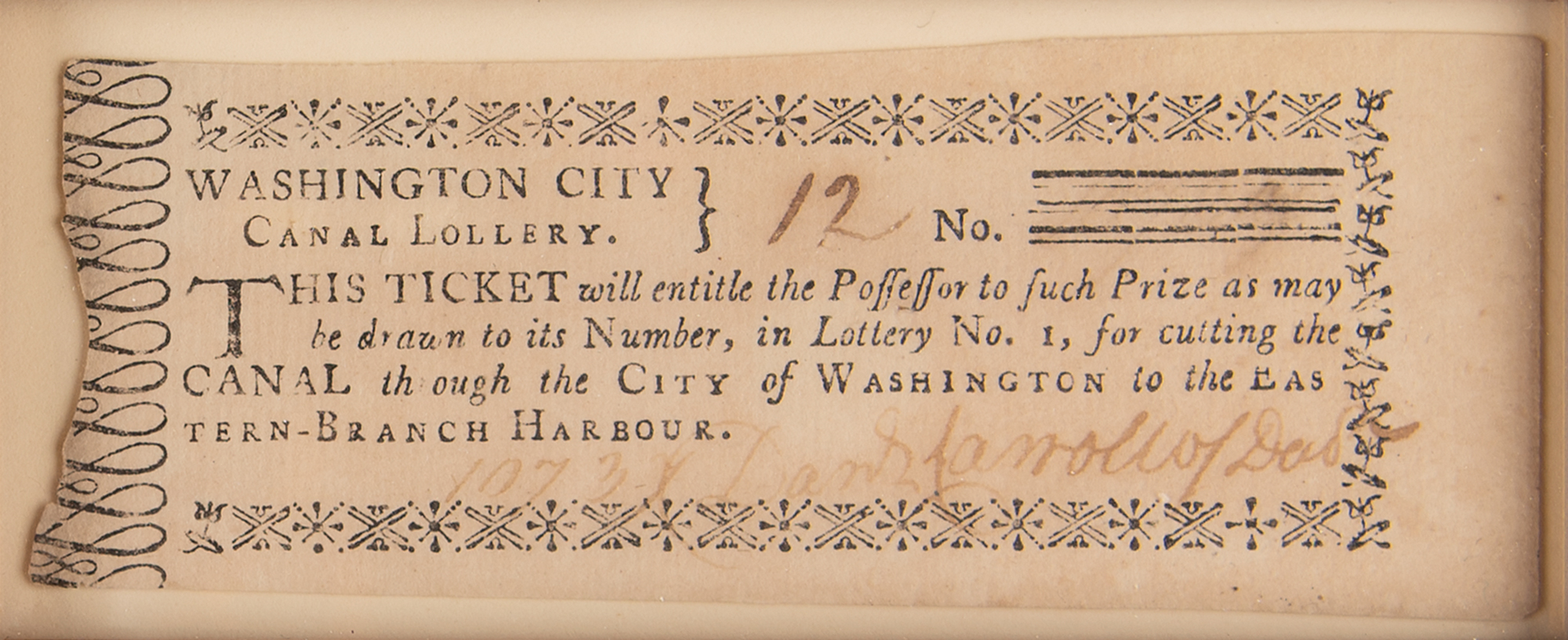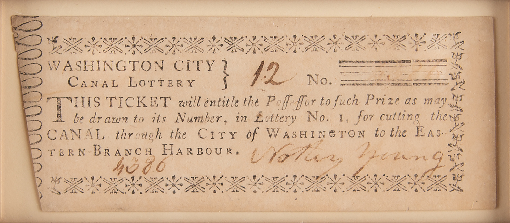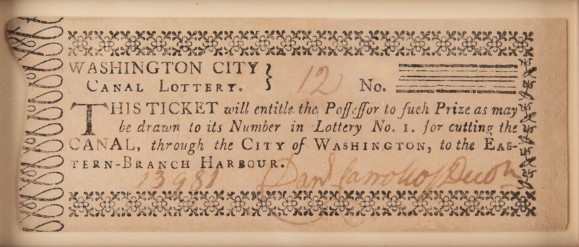 Display featuring six "Washington City Canal Lottery" tickets, ranging in size from 2.75 x 2 to 4 x 1.5, with two signed by Nottey Young and four signed by Daniel Carroll of Duddington. Impressively cloth-matted and framed with an image and descriptive caption to an overall size of 24.5 x 22. In fine condition.