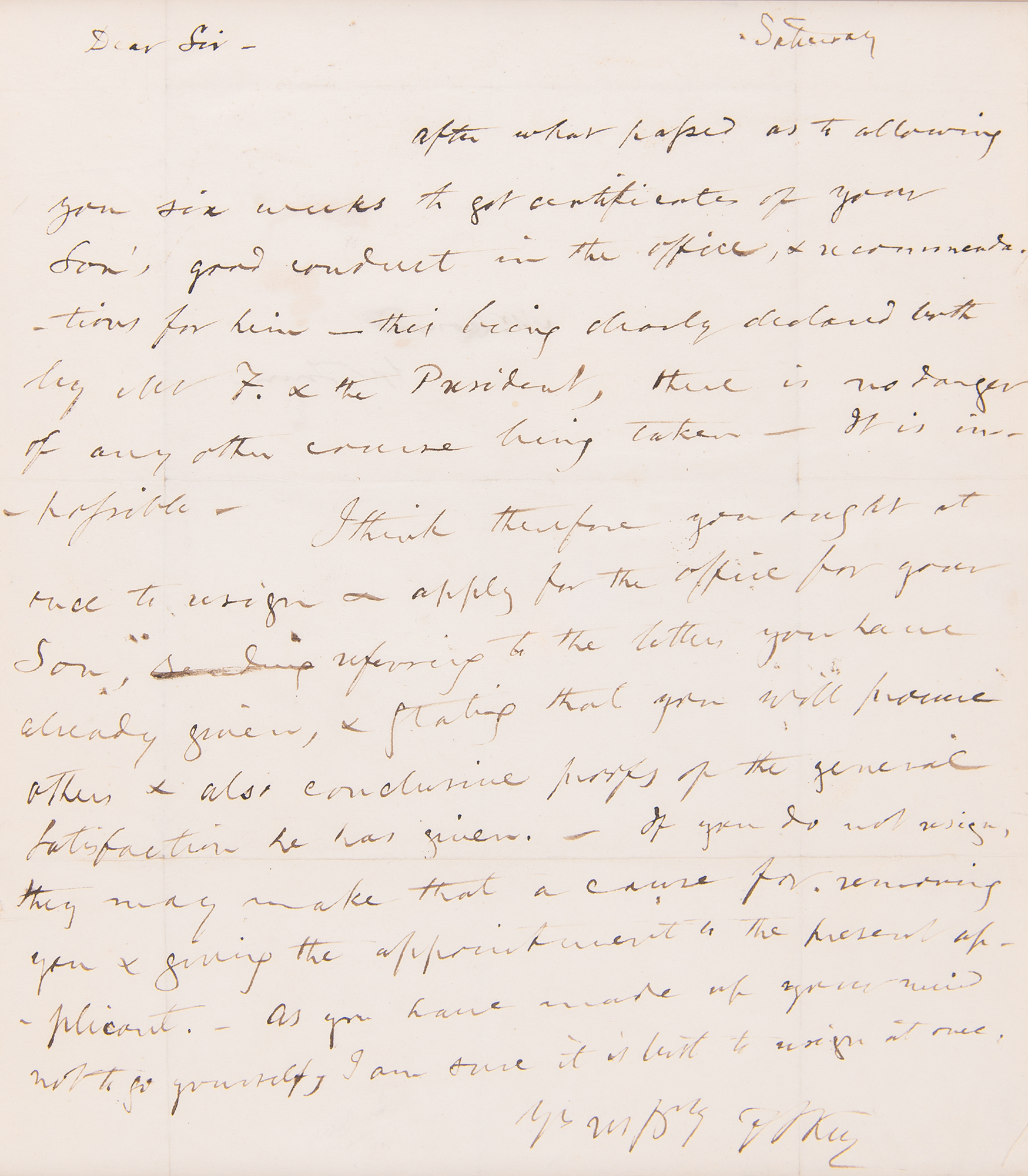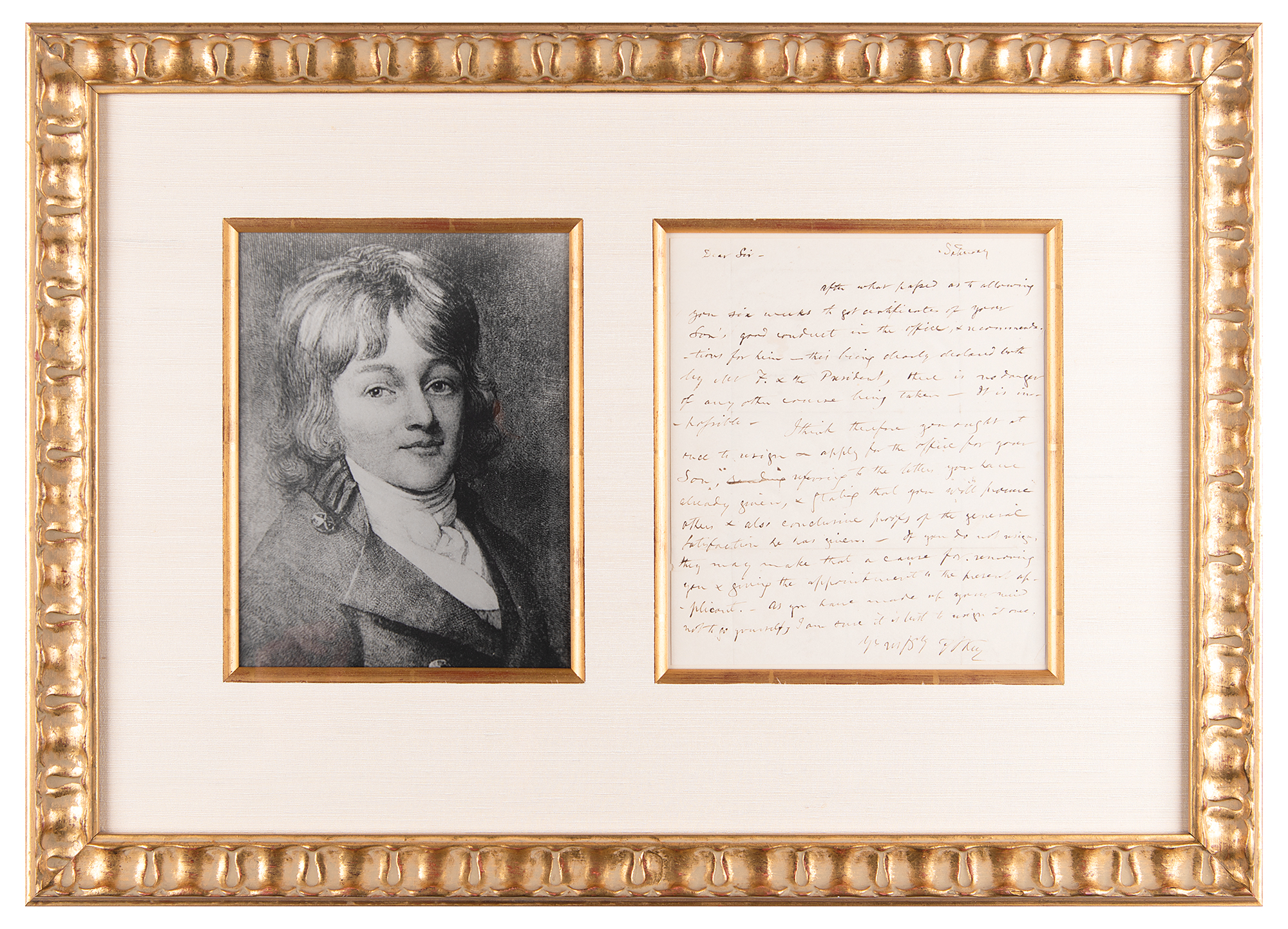 Baltimore lawyer (1779–1843) who was inspired to write the ‘Star-Spangled Banner’ after he witnessed the bombardment of Fort McHenry by the British in 1814. ALS signed “F. S. Key,” one page, 7.75 x 8.75, no date. Handwritten letter to a gentleman, offering advice on a sensitive situation. In part: "After what passed as to allowing you six weeks to get certificates of your son's good conduct in the office, & recommendations for him…there is no danger of any other course being taken—it is impossible. I think therefore you ought at once to resign & apply for the office for your son, referring to the letters you have already given, & stating that you will procure others…If you do not resign, they may make that a cause for removing you & giving the appointment to the present applicant…I am sure it is best to resign at once." Beautifully cloth-matted and framed with a portrait to an overall size of 25.5 x 18.25. In fine condition.
