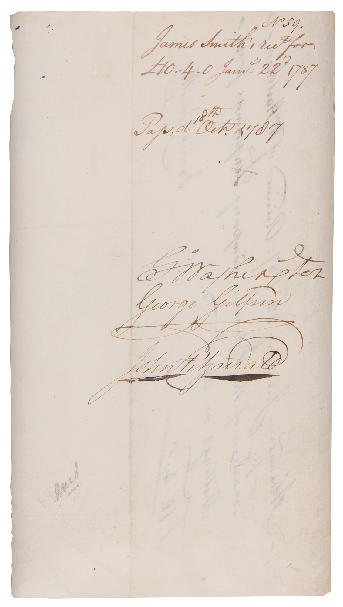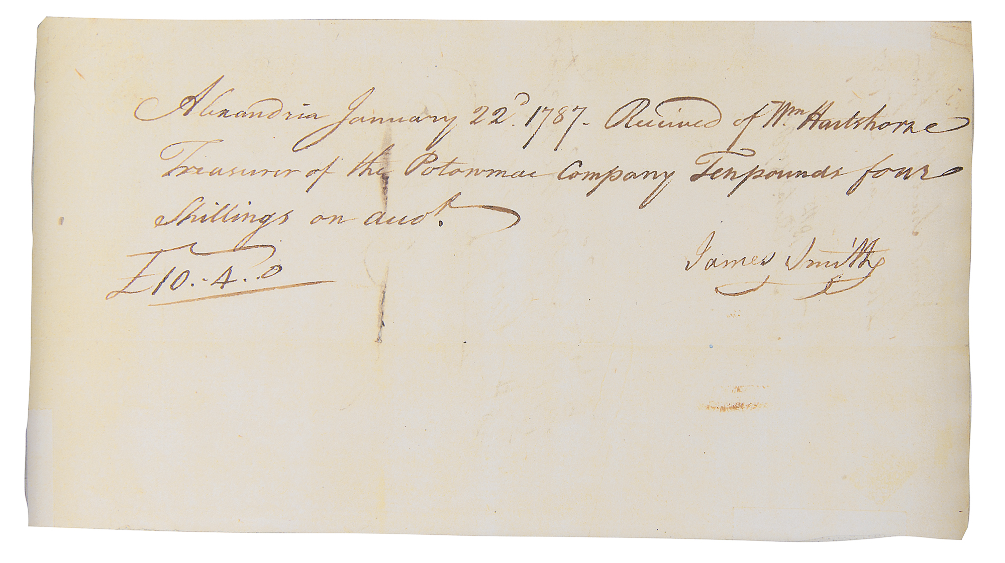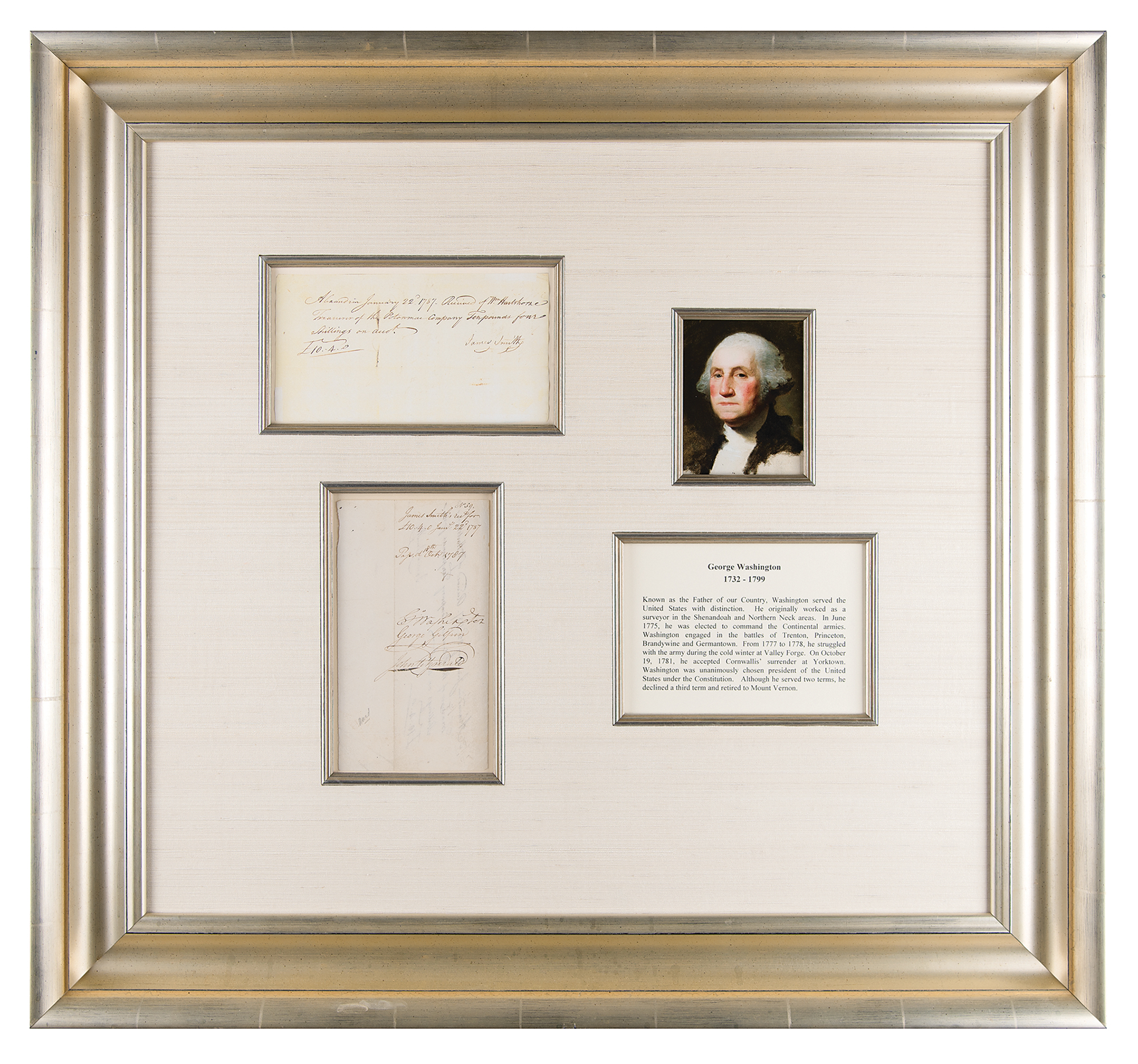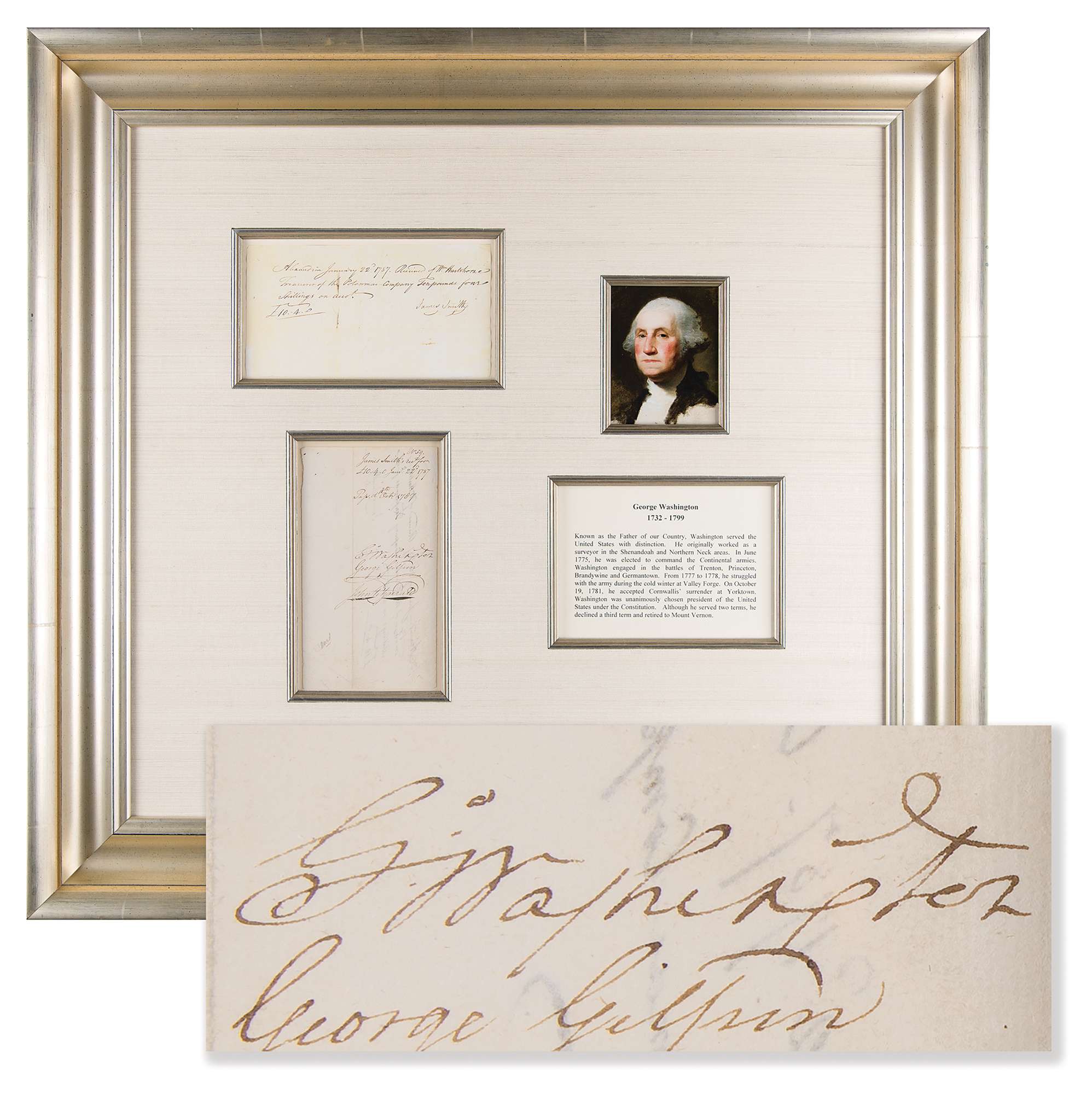DS, signed “Go: Washington,” one page, 4.25 x 7.75, January 22, 1787. Potomac Company financial receipt, neatly endorsed on the reverse in ink by George Washington, George Gilpin, and John Fitzgerald as directors. The front, signed by James Smith, reads, in full: "Alexandria, January 22d 1787. Received of Wm. Hartshorne, Treasurer of the Potomac Company Ten pounds Four shillings on acco't." Impressively mounted, cloth-matted, and framed with a color copy of the front, a color portrait of Washington, and a biographical caption to an overall size of 30 x 28. In fine condition. George Washington's bold, crisp autograph is an ideal example.