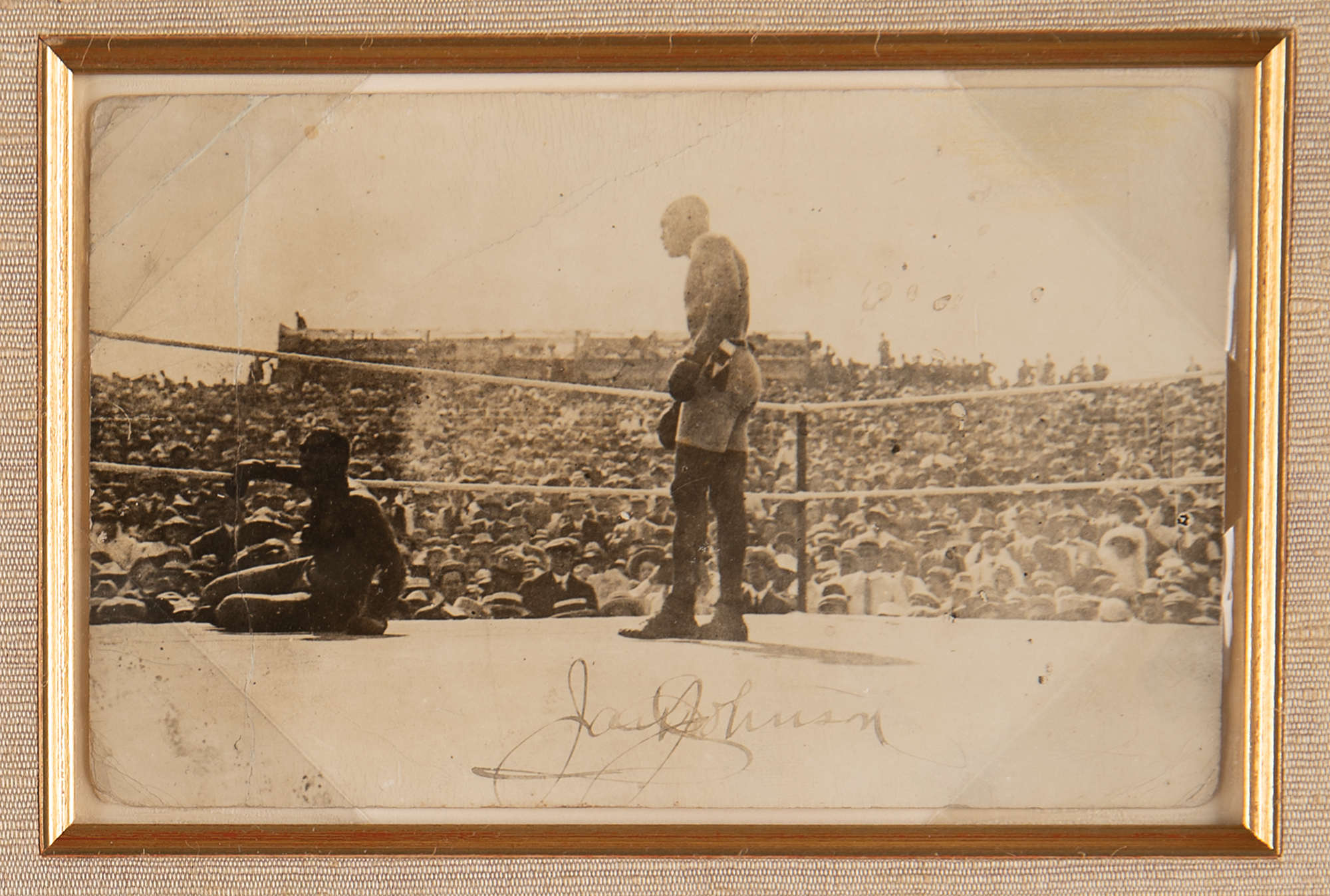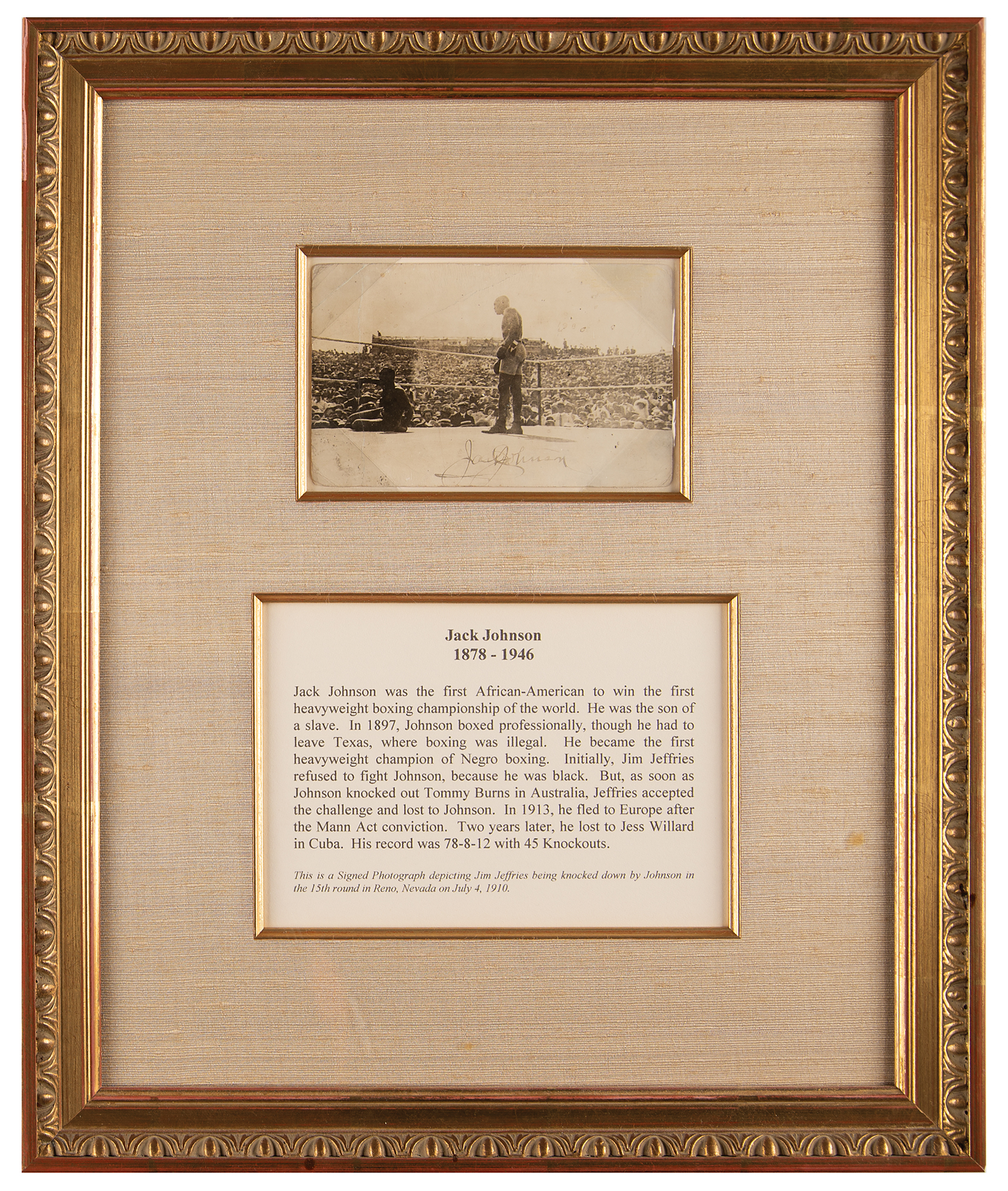 Exceptional vintage glossy 5.5 x 3.5 postcard photo of Jack Johnson knocking down Jim Jeffries in the 15th round of their famous bout on July 4, 1910—the 'Fight of the Century'—signed along the bottom in fountain pen, "Jack Johnson." Beautifully corner-mounted, cloth-matted, and framed with a biographical caption to an overall size of 14 x 17. In very good to fine condition, with creasing to the corners, and the upper background.