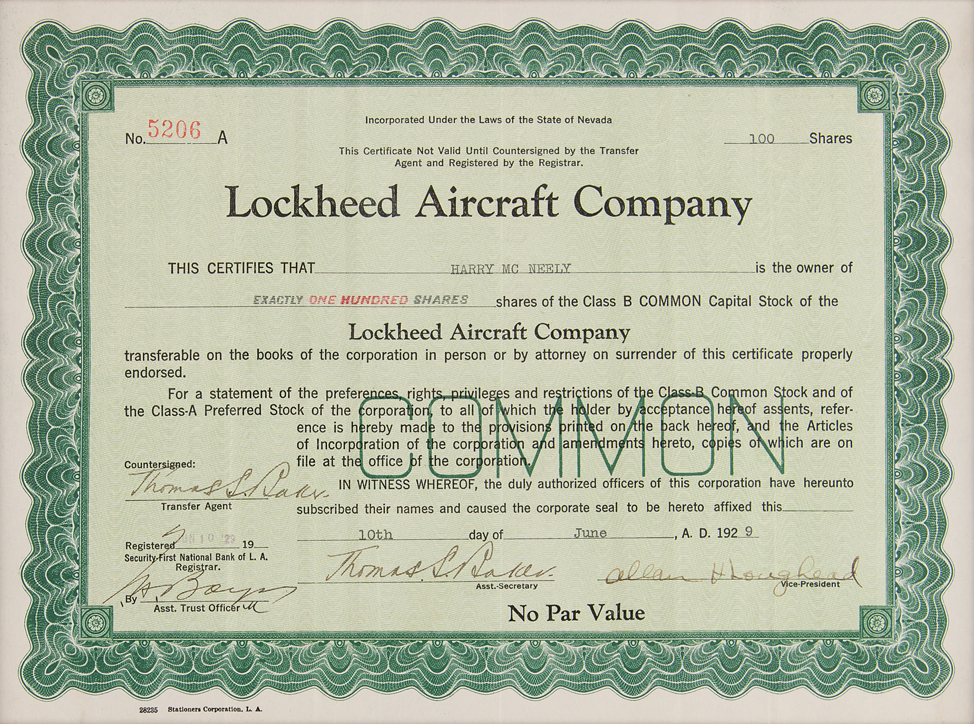 Stock certificate for 100 shares in the Lockheed Aircraft Company, one page, 11.5 x 8.25, June 10, 1929, signed in ink by the company's vice president, Allan Lockheed (using his given name, "Allan H. Loughead"), and assistant secretary, Thomas S. Baker. Handsomely cloth-matted and framed with a Lockheed advertisement and descriptive plaque to an overall size of 30 x 25. In fine condition.