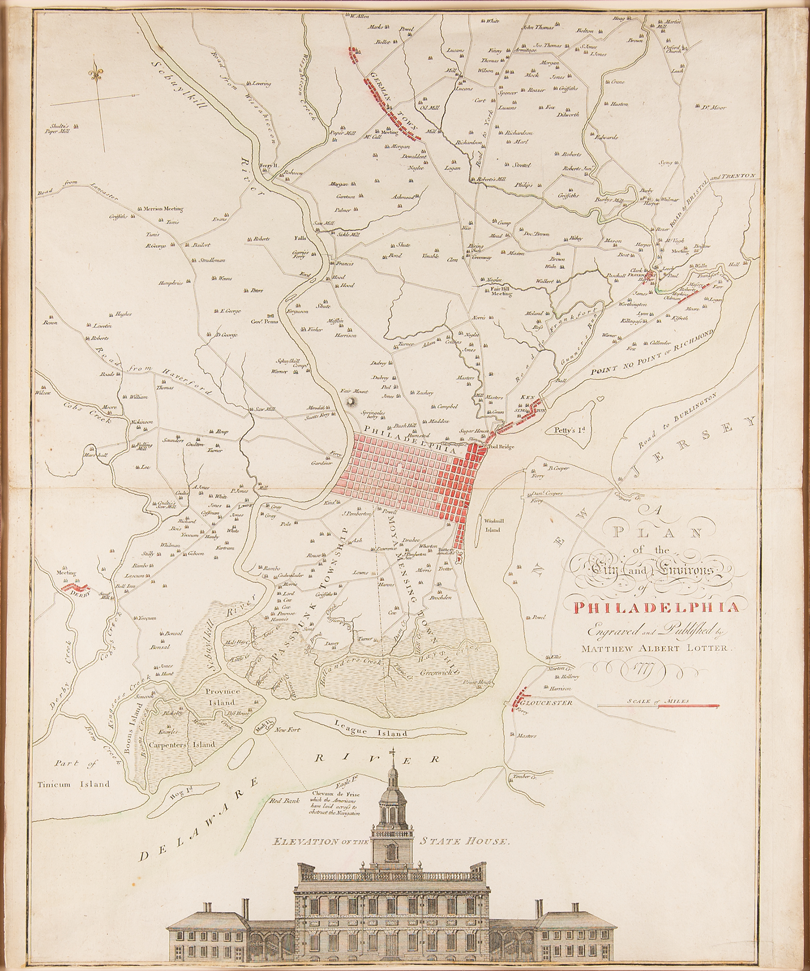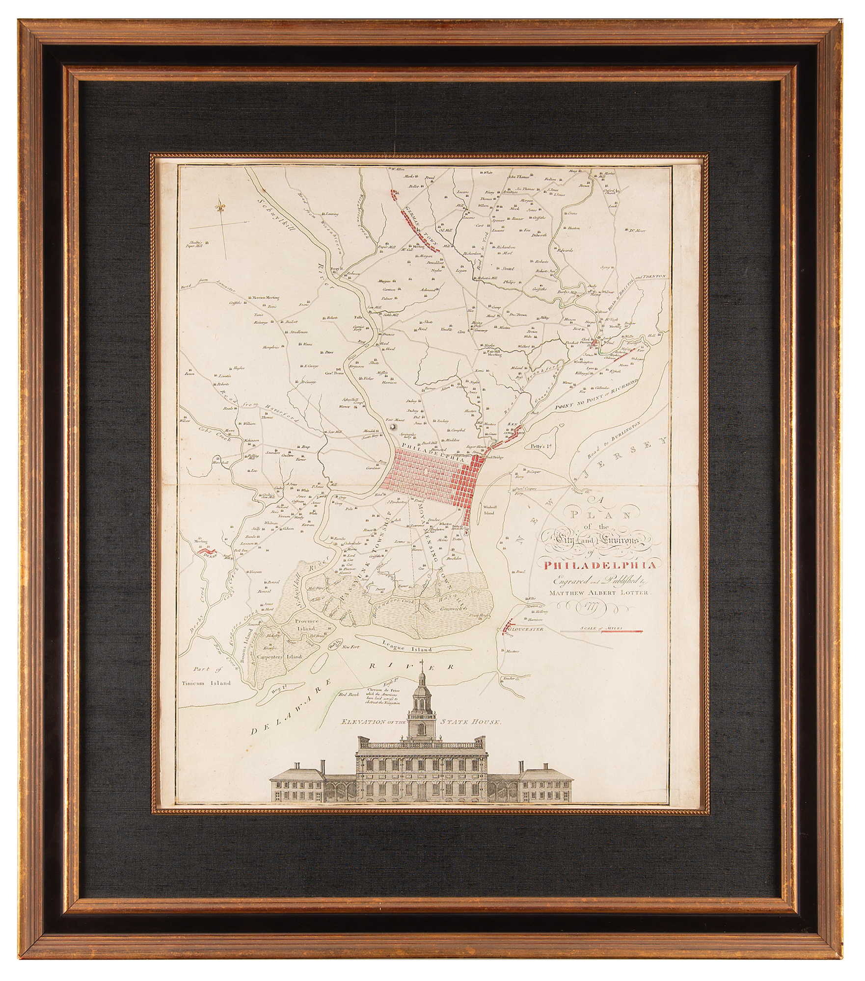 Stunning hand-colored map entitled "A Plan of the City and Environs of Philadelphia," engraved and published by Matthew Albert Lotter in 1777, measuring 19.5 x 23.5, a Revolutionary War–era reissue of the famous 'Scull and Heap' plan of 1752. The large map centers on Thomas Holme's 1682 urban grid plan for the city, situated between the Schuylkill and Delaware Rivers, with numerous outlying 'county seats' placed and named, and the city's primitive road system indicated. A detailed engraving of the Pennsylvania State House—today known as Independence Hall, where the Declaration of Independence was signed in 1776—features at the bottom of the plan. Gorgeously cloth-matted and framed to an overall size of 29.5 x 34. In fine condition.