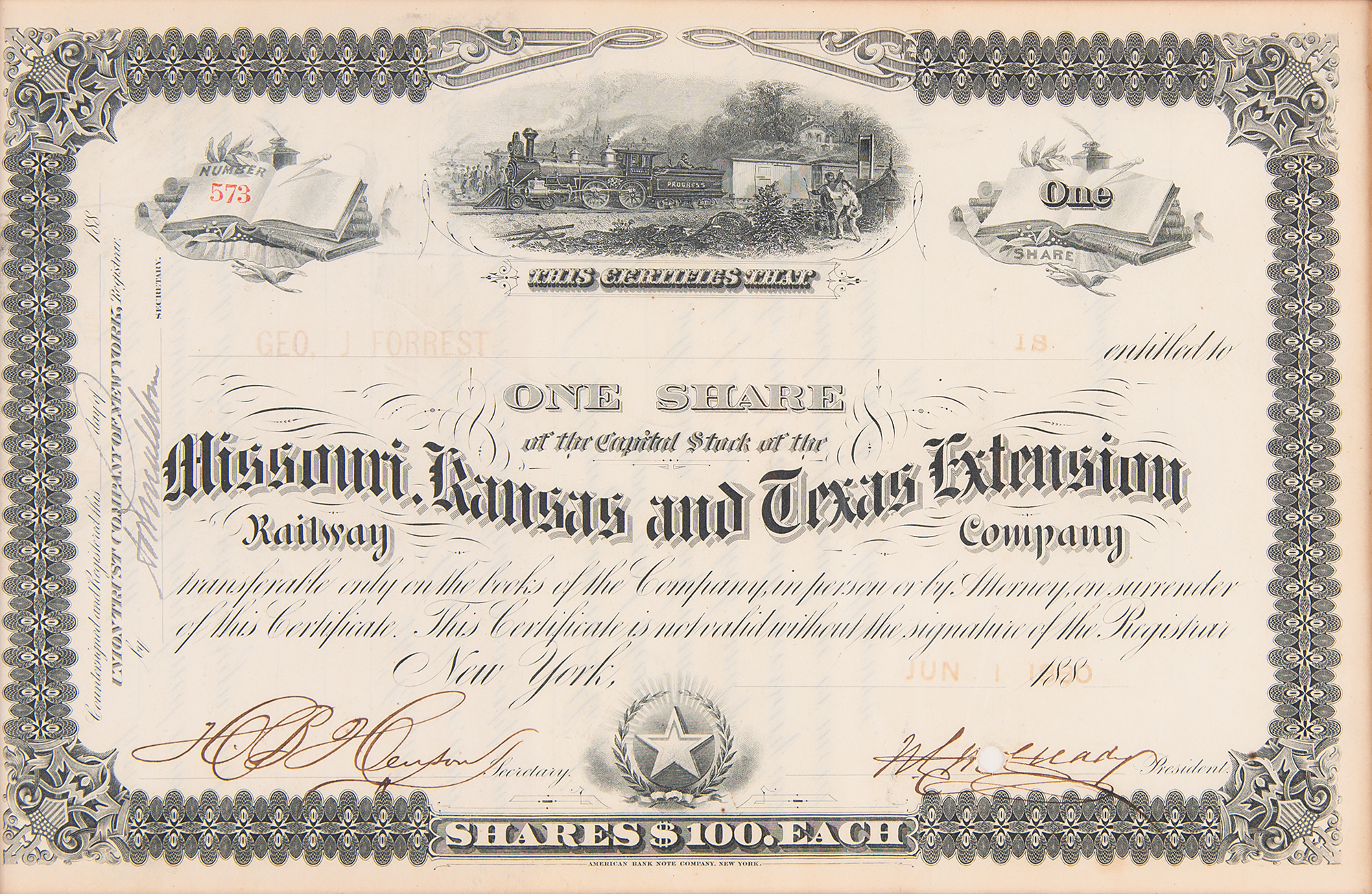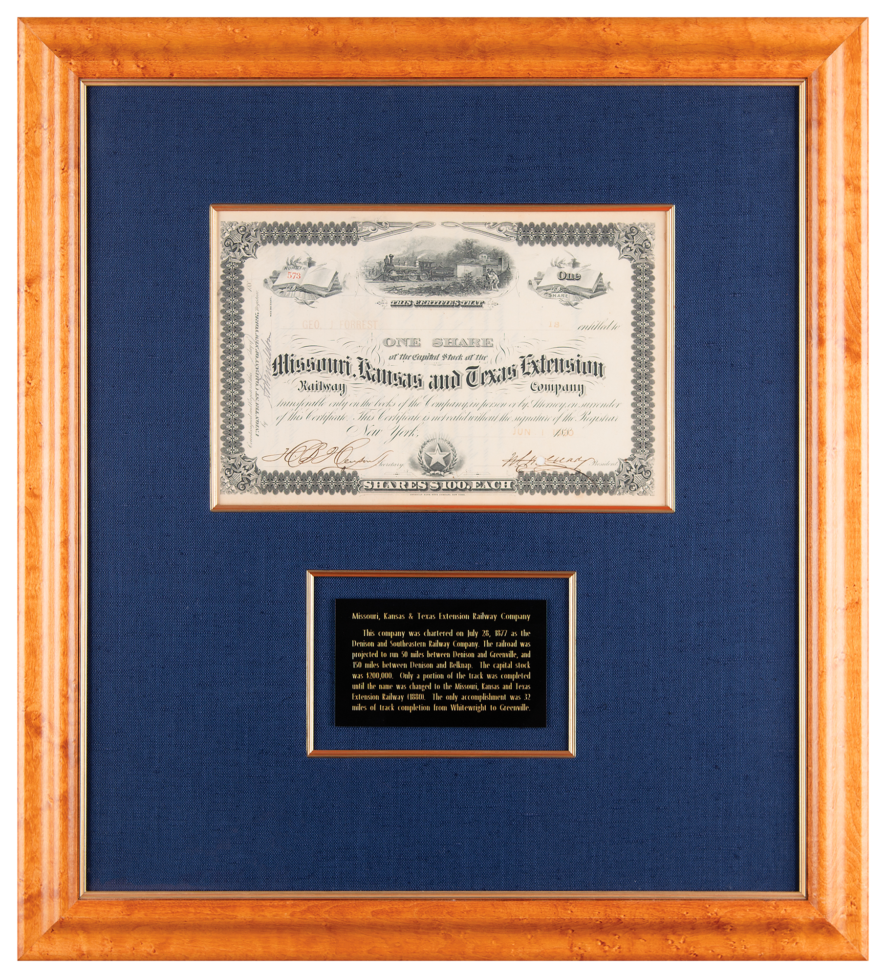 Stock certificate for one share in the Missouri, Kansas and Texas Extension Railway Company, one page, 10.5 x 7, June 1, 1880, signed in ink by the company's president and secretary. The certificate features a fine vignette of a railroad scene. Gorgeously cloth-matted and framed with a plaque to an overall size of 20 x 22. In fine condition.